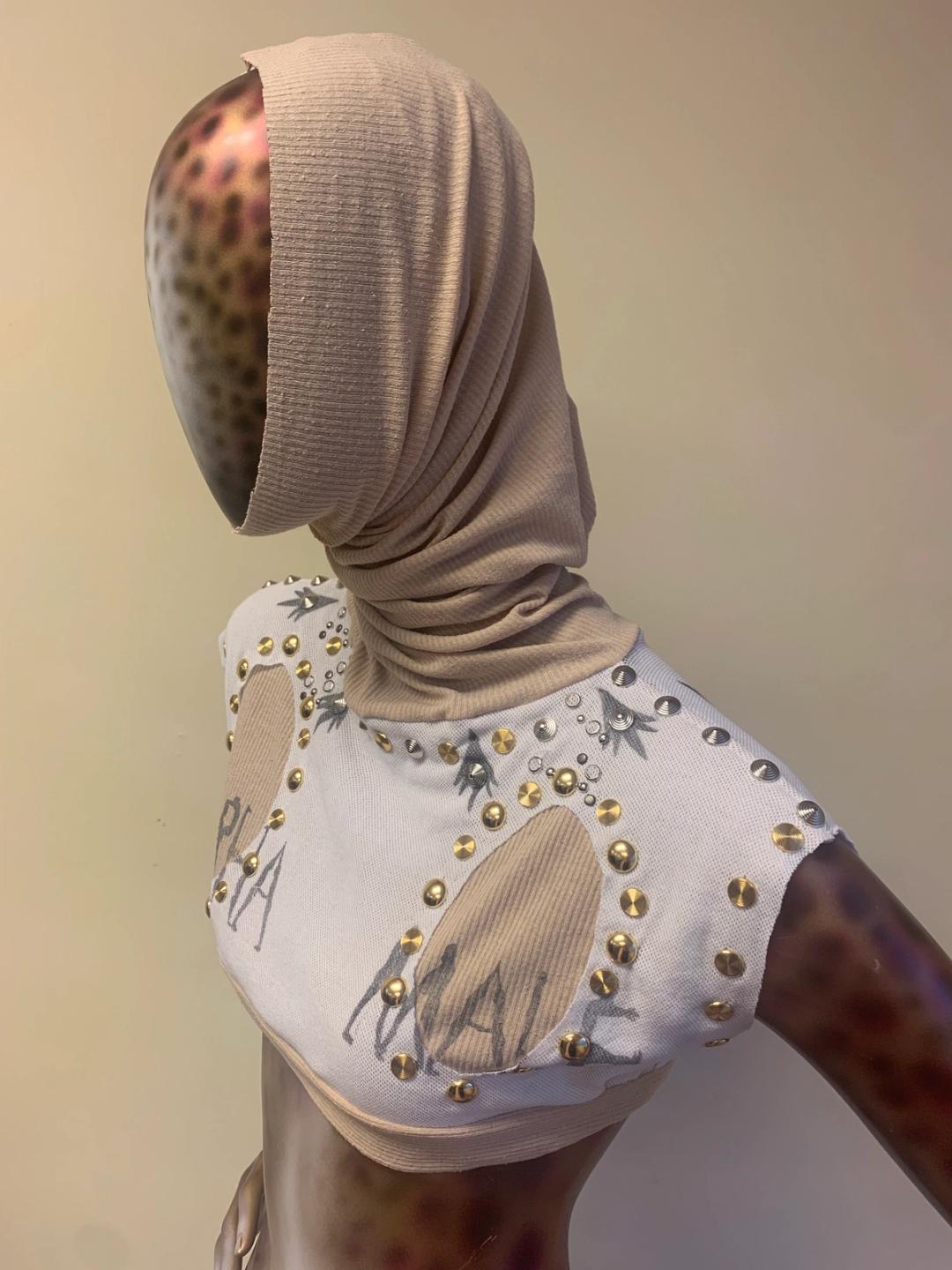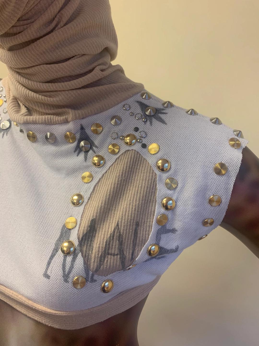 Alpha Male’ micro top with hand- printed text and faux ermine pattern. Each top is unique with makeup smears, distressing, and studded embellishment. The 'Alpha Male' top was shown in the AW 2024 'Enfer' collection.