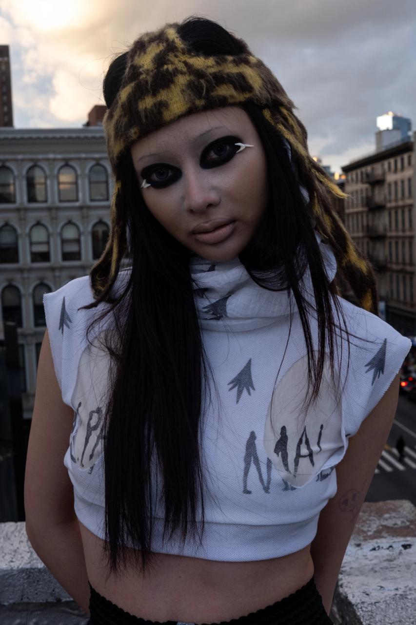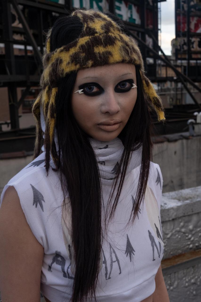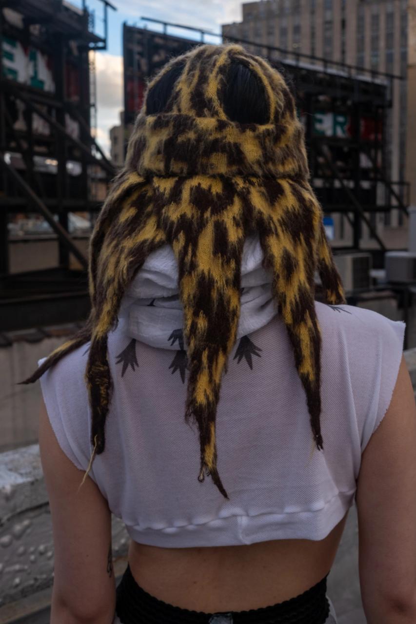 Knit ski caps in cheetah colorway with cartoonish hair strands and an animalic pattern, taken from a French Art Deco flannel. The criss crossed skullcap design is based on Art Deco ski hats from 1920-1930s. The hats are knit from Mohair yarn and brushed out for a blurred effect. The band over the ears is double-layered providing warmth. This style was seen on our recent SS2025 ‘Indestructible Dollhead’.