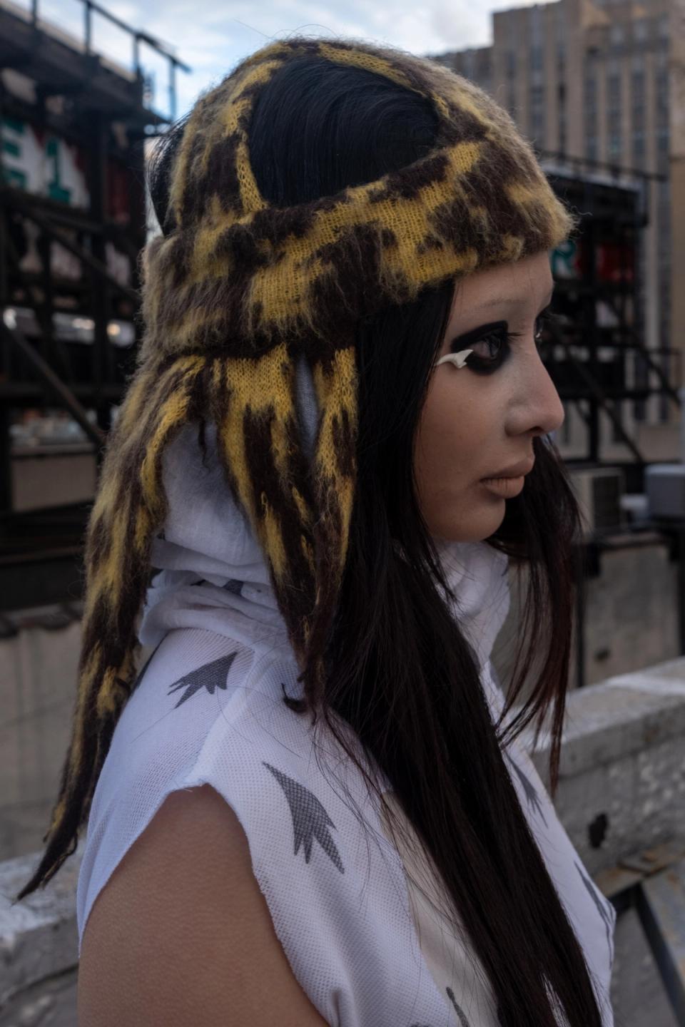 Knit ski caps in cheetah colorway with cartoonish hair strands and an animalic pattern, taken from a French Art Deco flannel. The criss crossed skullcap design is based on Art Deco ski hats from 1920-1930s. The hats are knit from Mohair yarn and brushed out for a blurred effect. The band over the ears is double-layered providing warmth. This style was seen on our recent SS2025 ‘Indestructible Dollhead’.