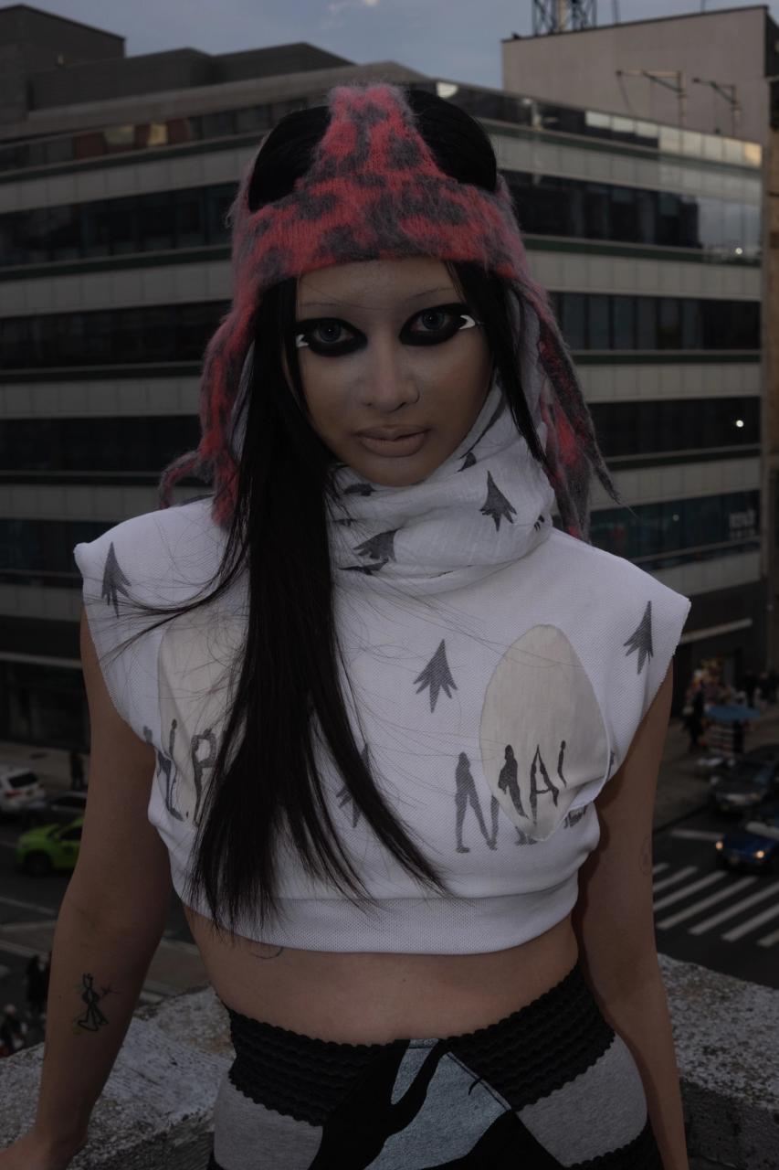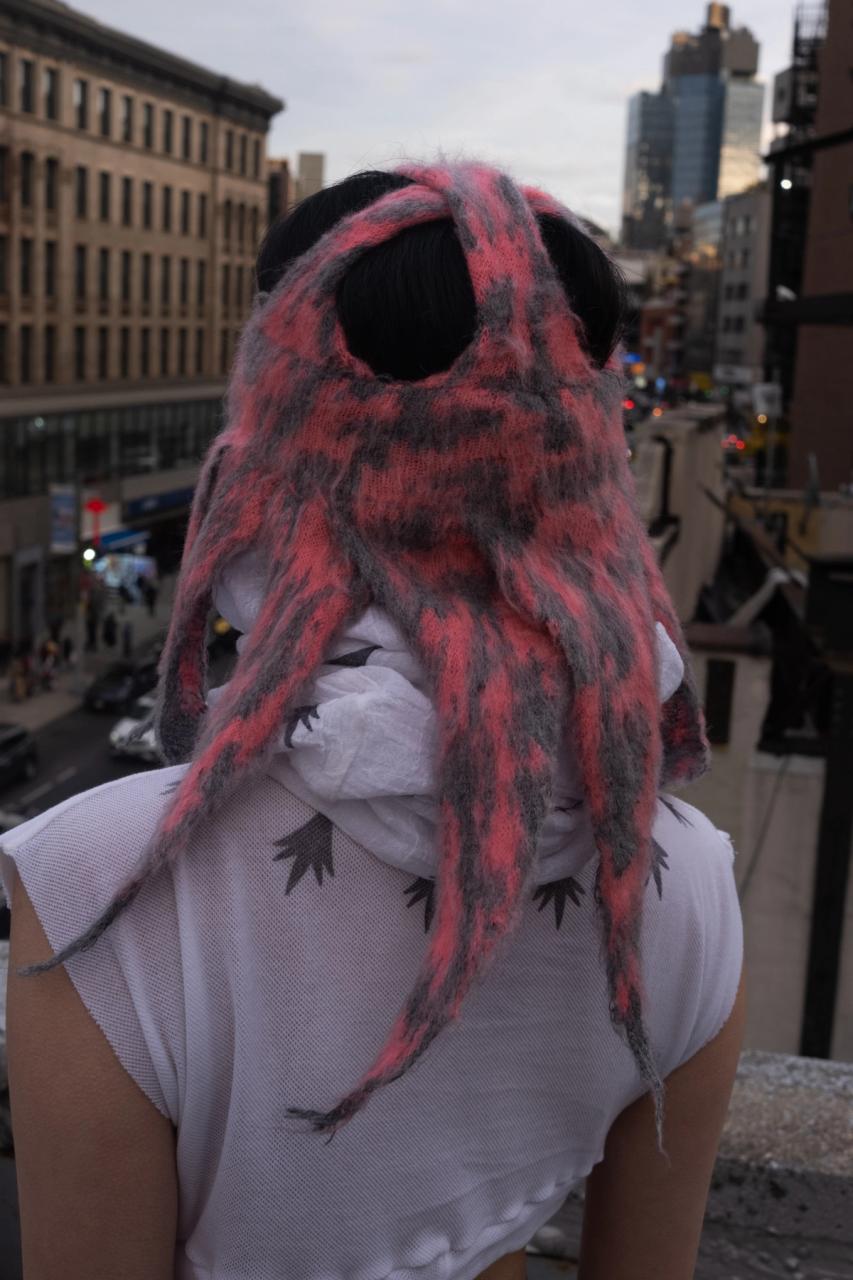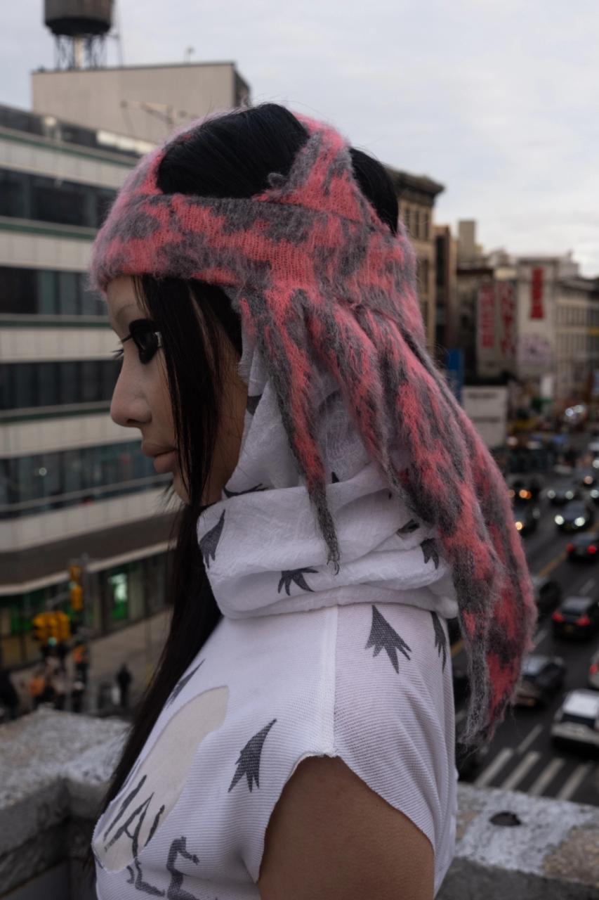 Knit ski caps in panthère rose colorway with cartoonish hair strands and an animalic pattern, taken from a French Art Deco flannel. The criss crossed skullcap design is based on Art Deco ski hats from 1920-1930s. The hats are knit from Mohair yarn and brushed out for a blurred effect. The band over the ears is double-layered providing warmth. This style was seen on our recent SS2025 ‘Indestructible Dollhead’.