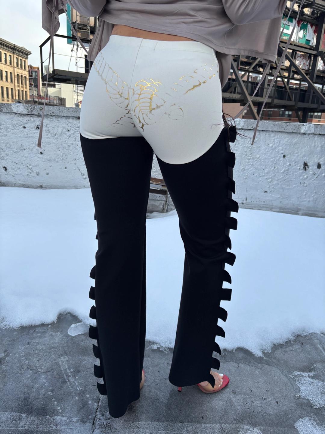 Castellated pant with faux nude top with bound gold foil print. Made in New York City.