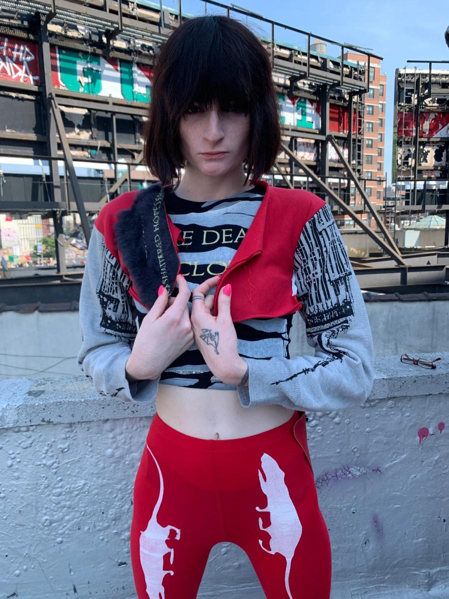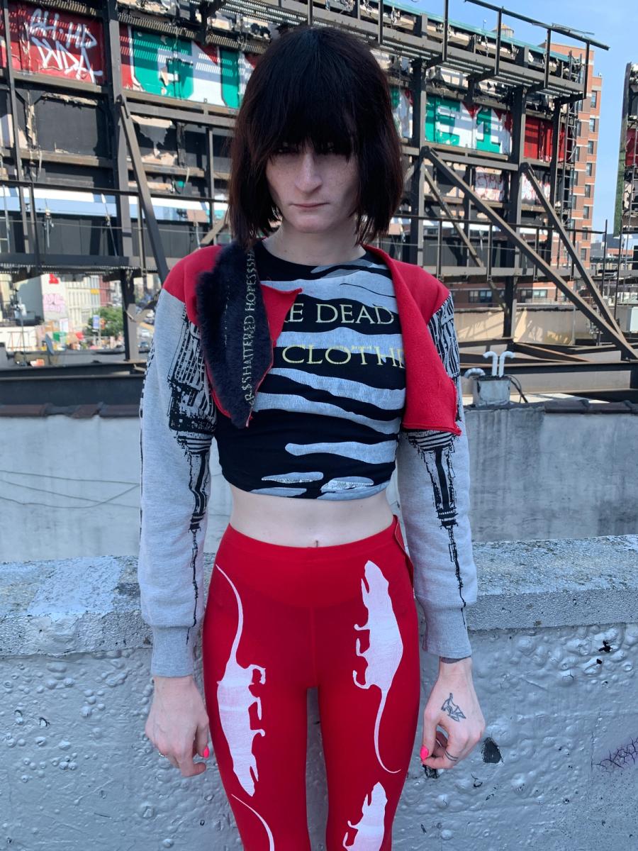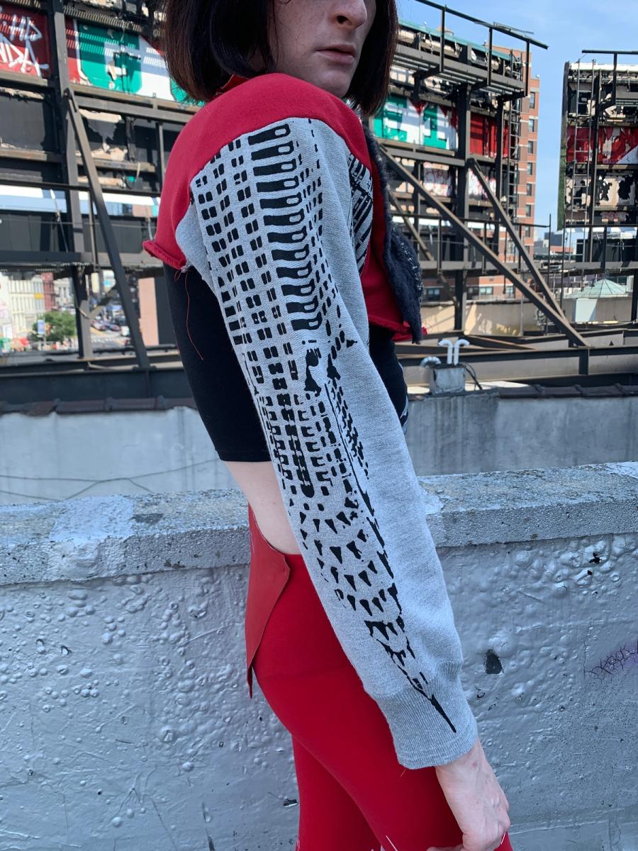 Shrug made of repurposed antique long johns and screenprinted fur appliqués. The shrug is handprinted with screens used in our recent collection, "Enfer." Fur is detachable for washing.