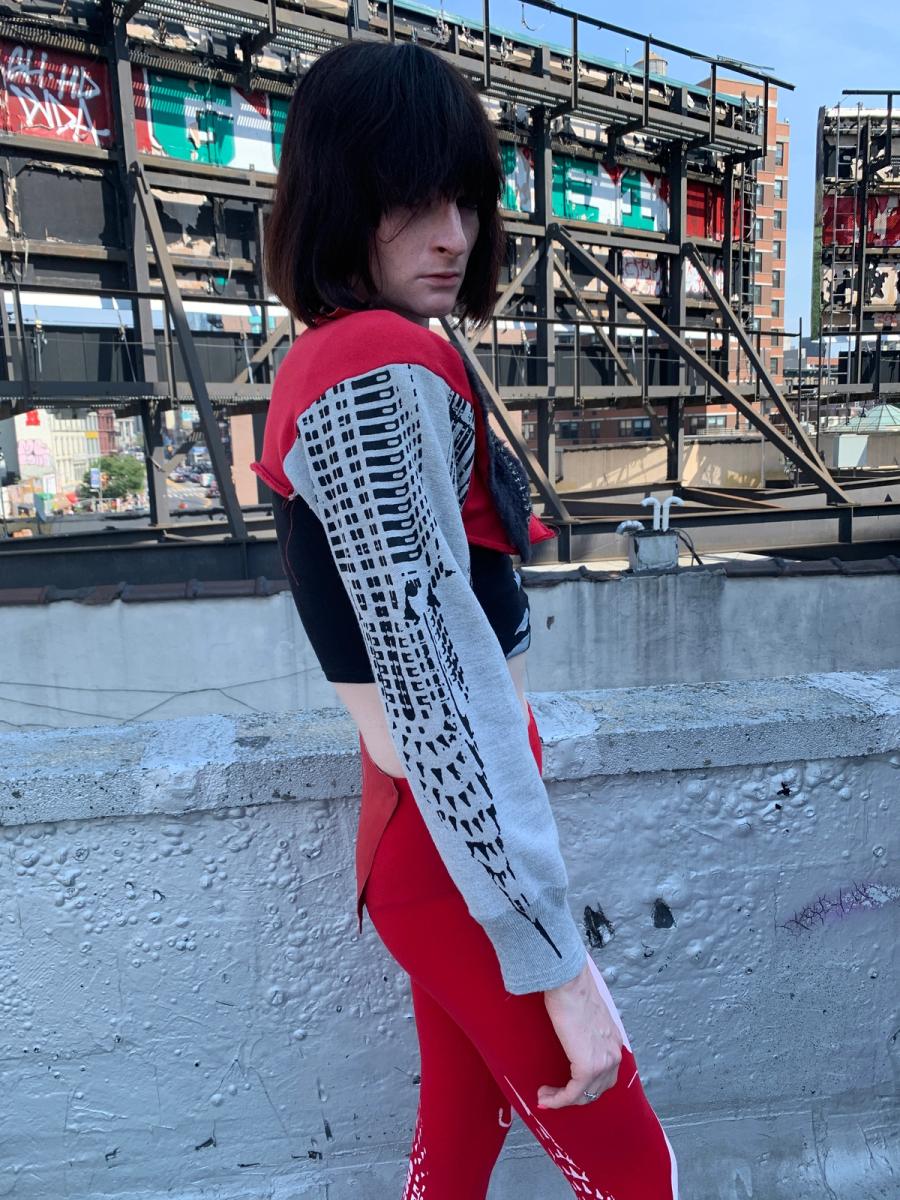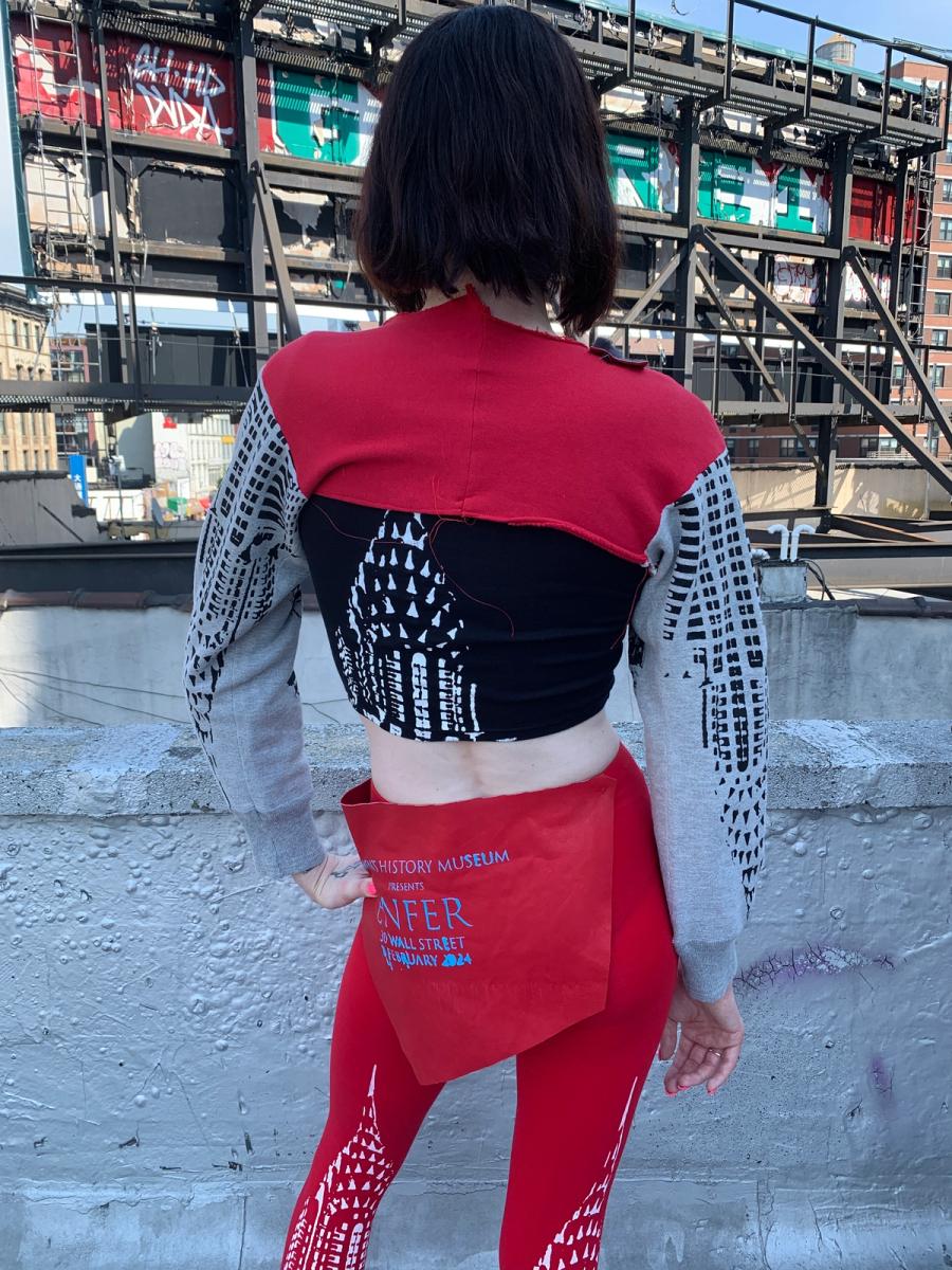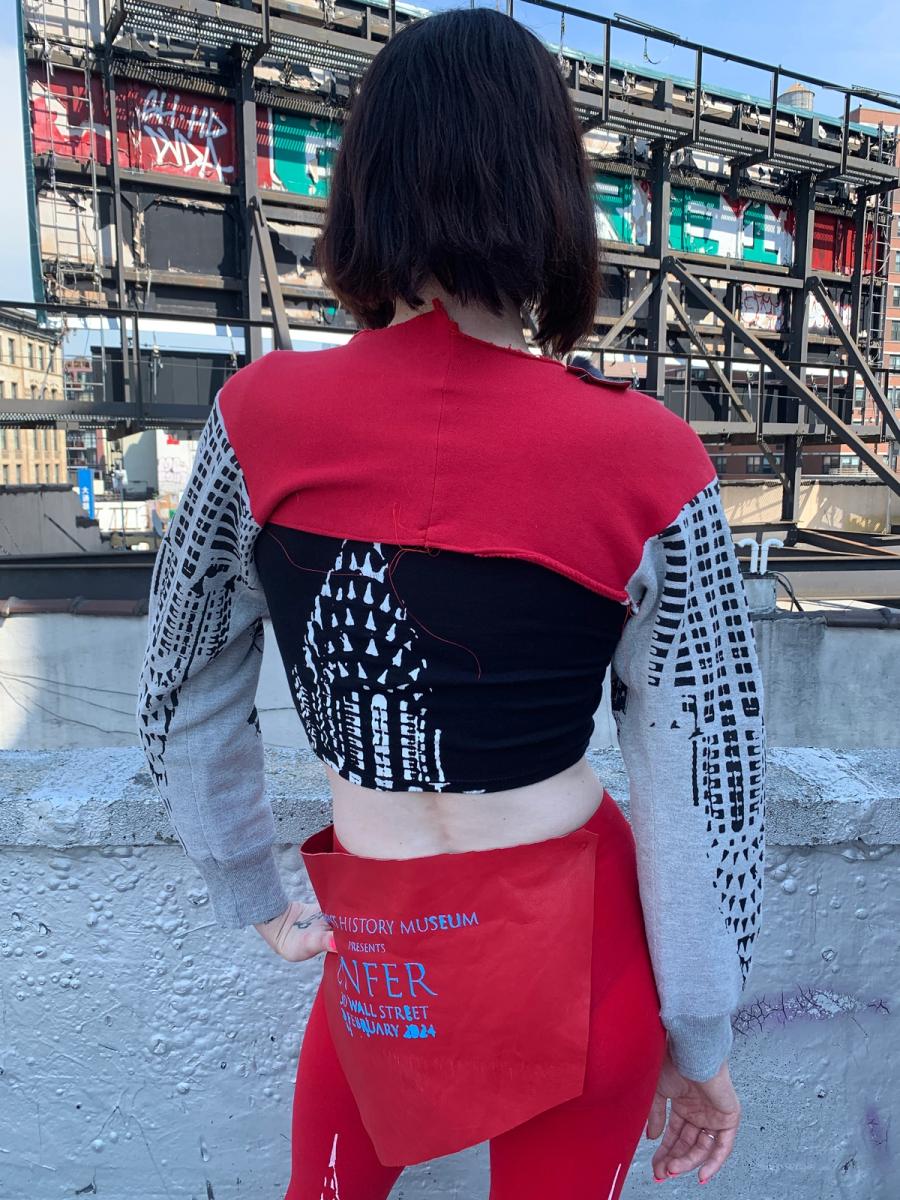Shrug made of repurposed antique long johns and screenprinted fur appliqués. The shrug is handprinted with screens used in our recent collection, "Enfer." Fur is detachable for washing.