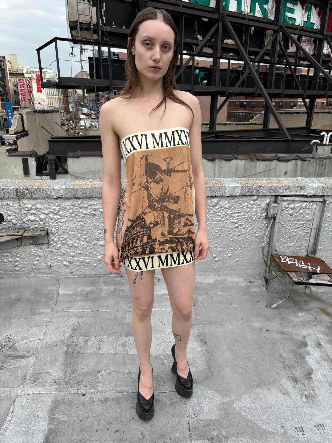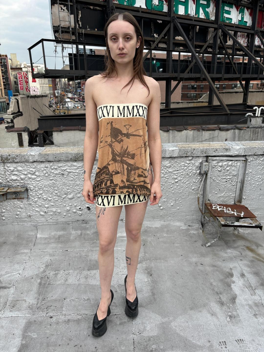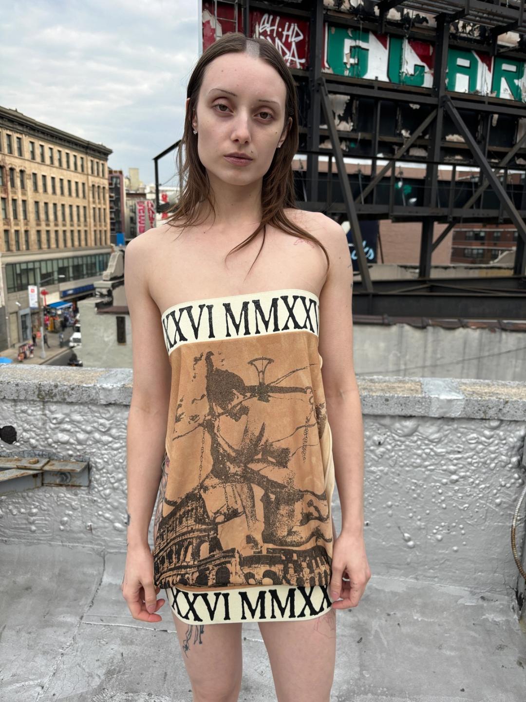 Backless tube dress with oversized Roman numeral print elastic on the top and bottom. Screen printed with original coliseum and "thinker" pin up girl print. Tea dyed. Viscose crepe. One size. Design from our AW 25 DEAD CURRENCY fashion show.