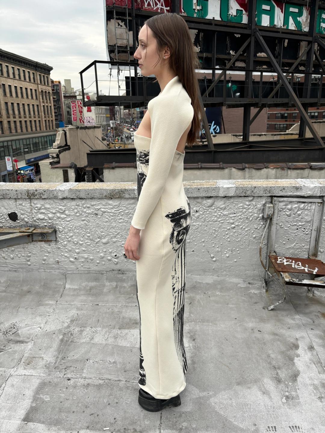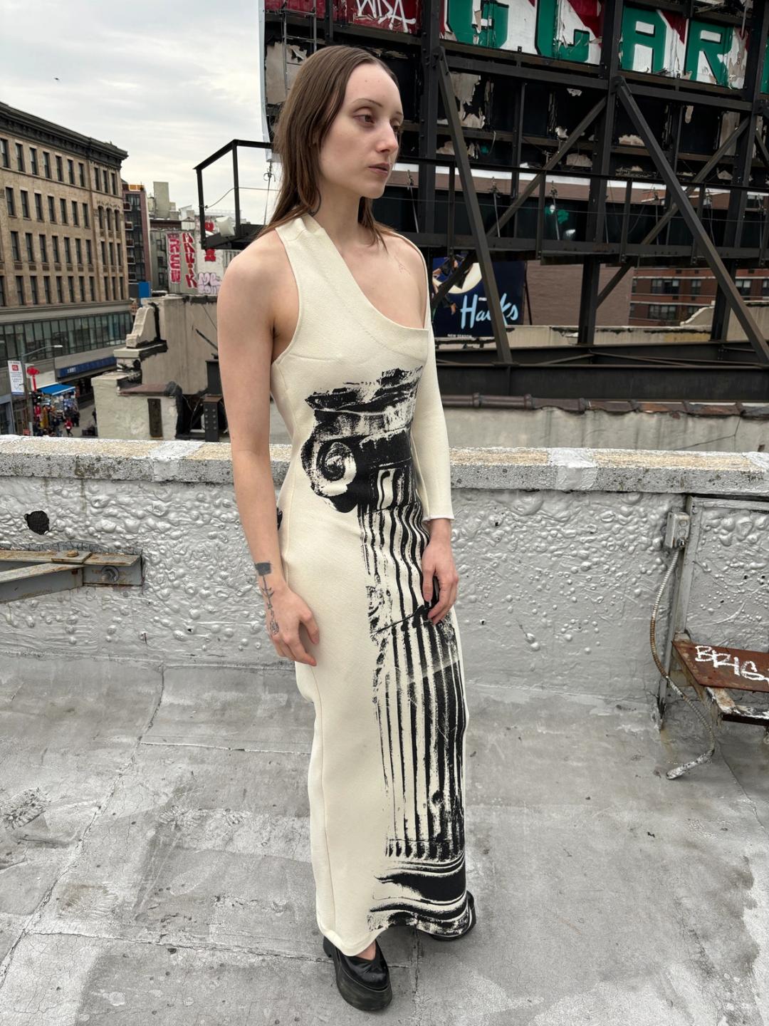 Column bias gown with asymmetrical one sleeve. The column print follows the curves of the body. The dress is made of a luxe creme wool crepe. Has stretch. Available in size S/M and M/L. Design from our AW 25 DEAD CURRENCY fashion show.