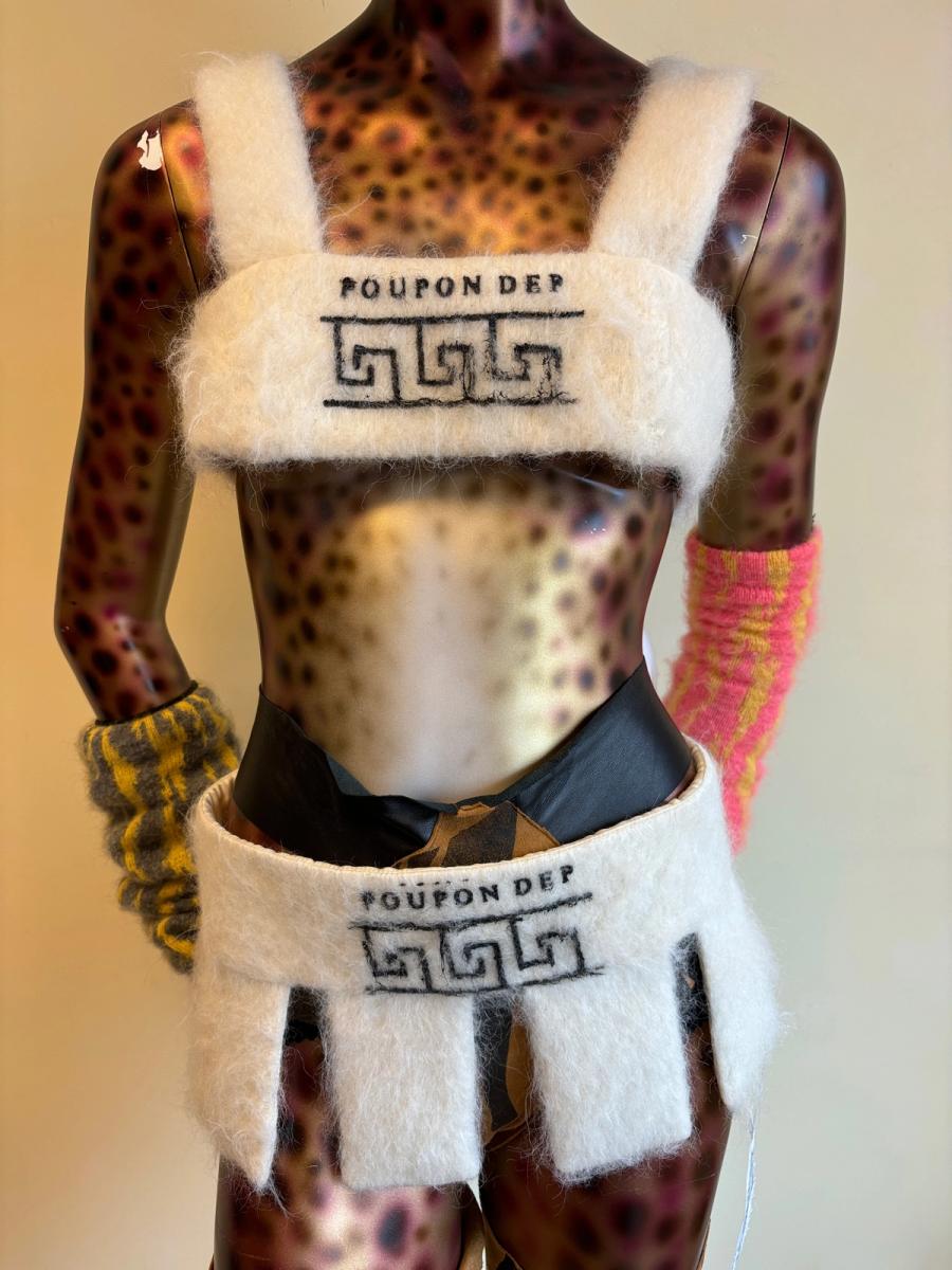 Mohair bra top with boning. Each top is screen printed with a doll mark from an antique doll database. Lined, closes in the back with zipper. Made in NYC.