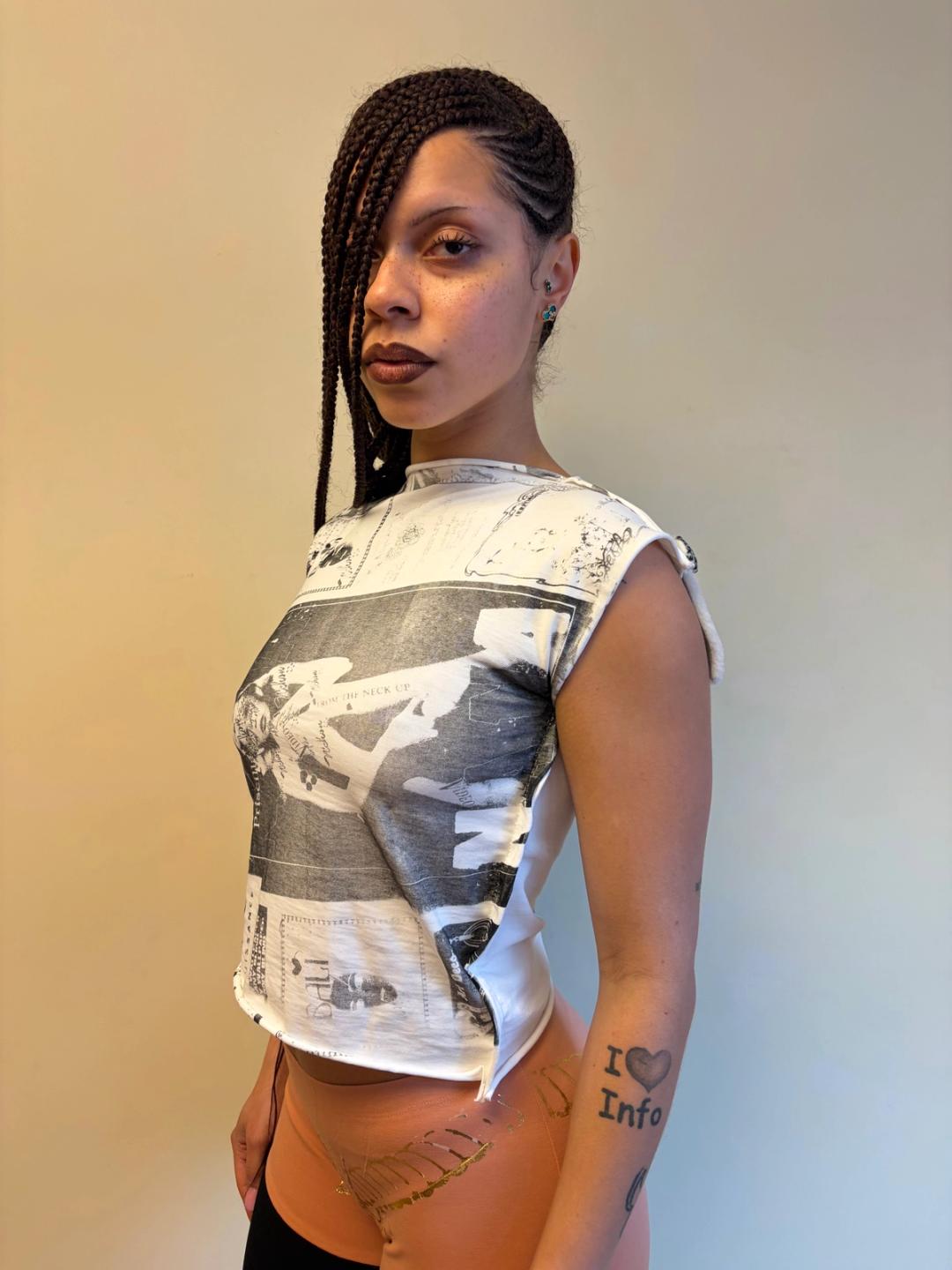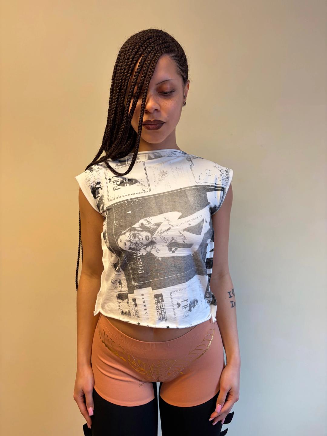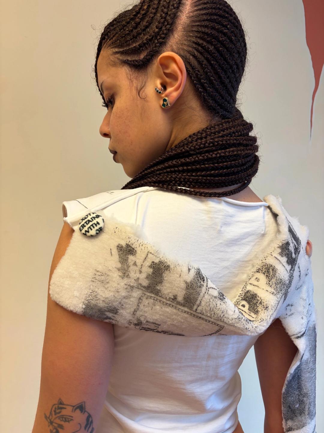 NANA collage print tee with detachable printed shearling shawl made from remnants from our studio. The fur can be buttoned off for washing. Made in New York City.
