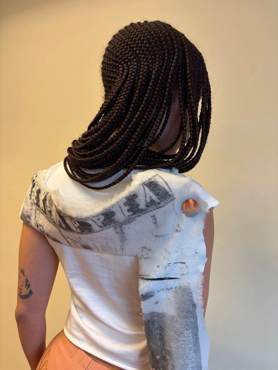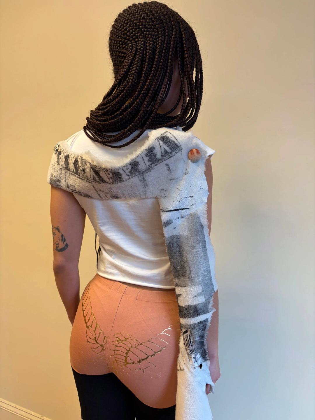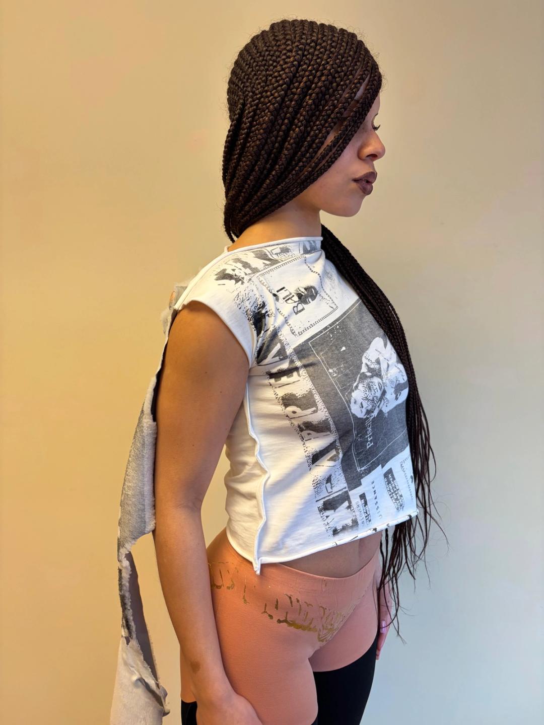 NANA collage print tee with detachable printed shearling shawl made from remnants from our studio. The fur can be buttoned off for washing. Made in New York City.