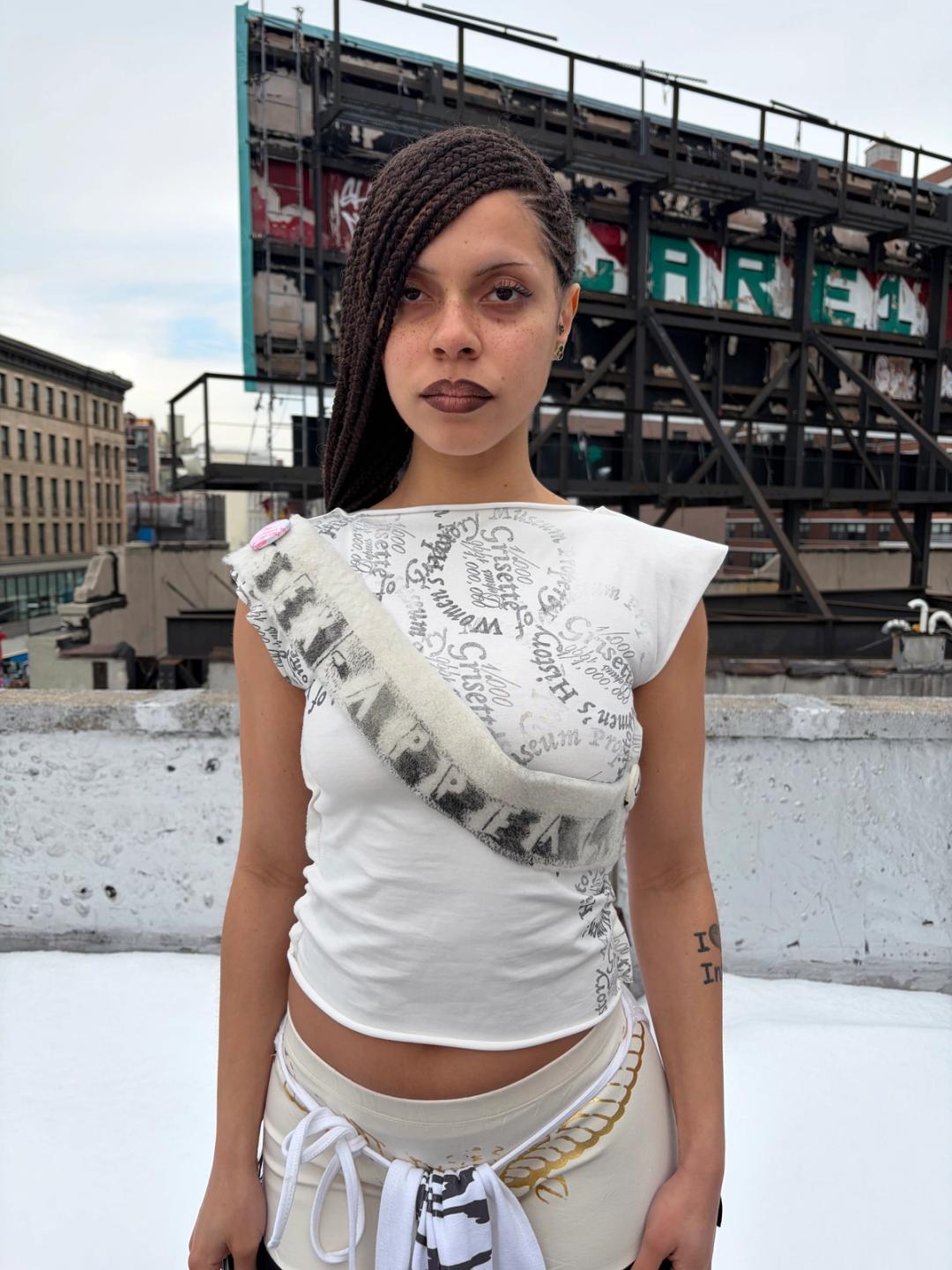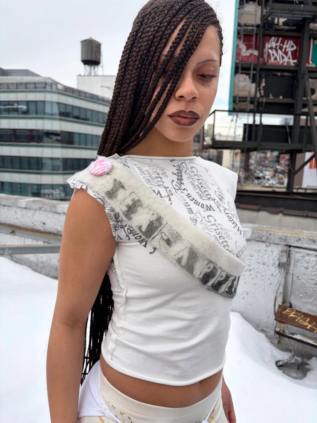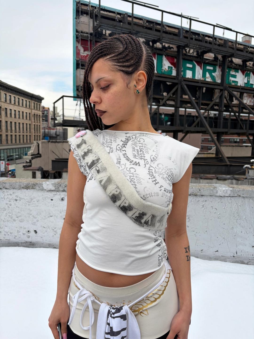 Grisette hand-stamped tee with detachable printed shearling sash made from remnants from our studio. The "Grisette" stamp is the logo of our shopping bags. The fur can be buttoned off for washing. Made in New York City.