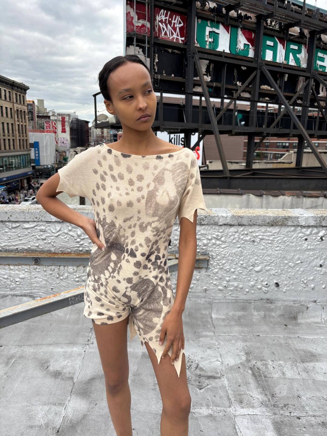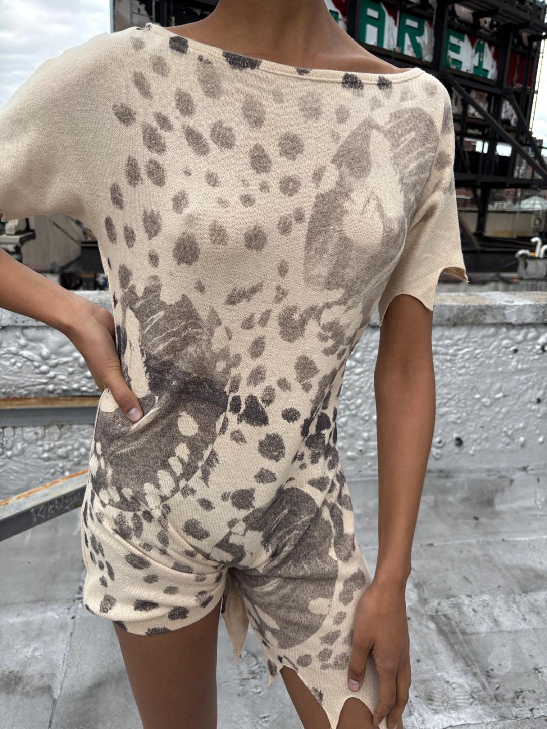 Romper with one jagged hem leg and sleeves. Screen printed with leopard and vintage 1930s 'Sex Appeal' magazine perfume sniffing girl print. Nude color and gray print. Knit Viscose. One size. Design from our AW 25 DEAD CURRENCY fashion show.