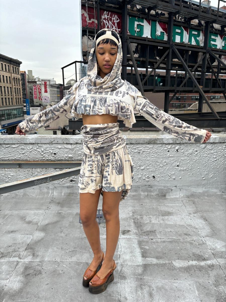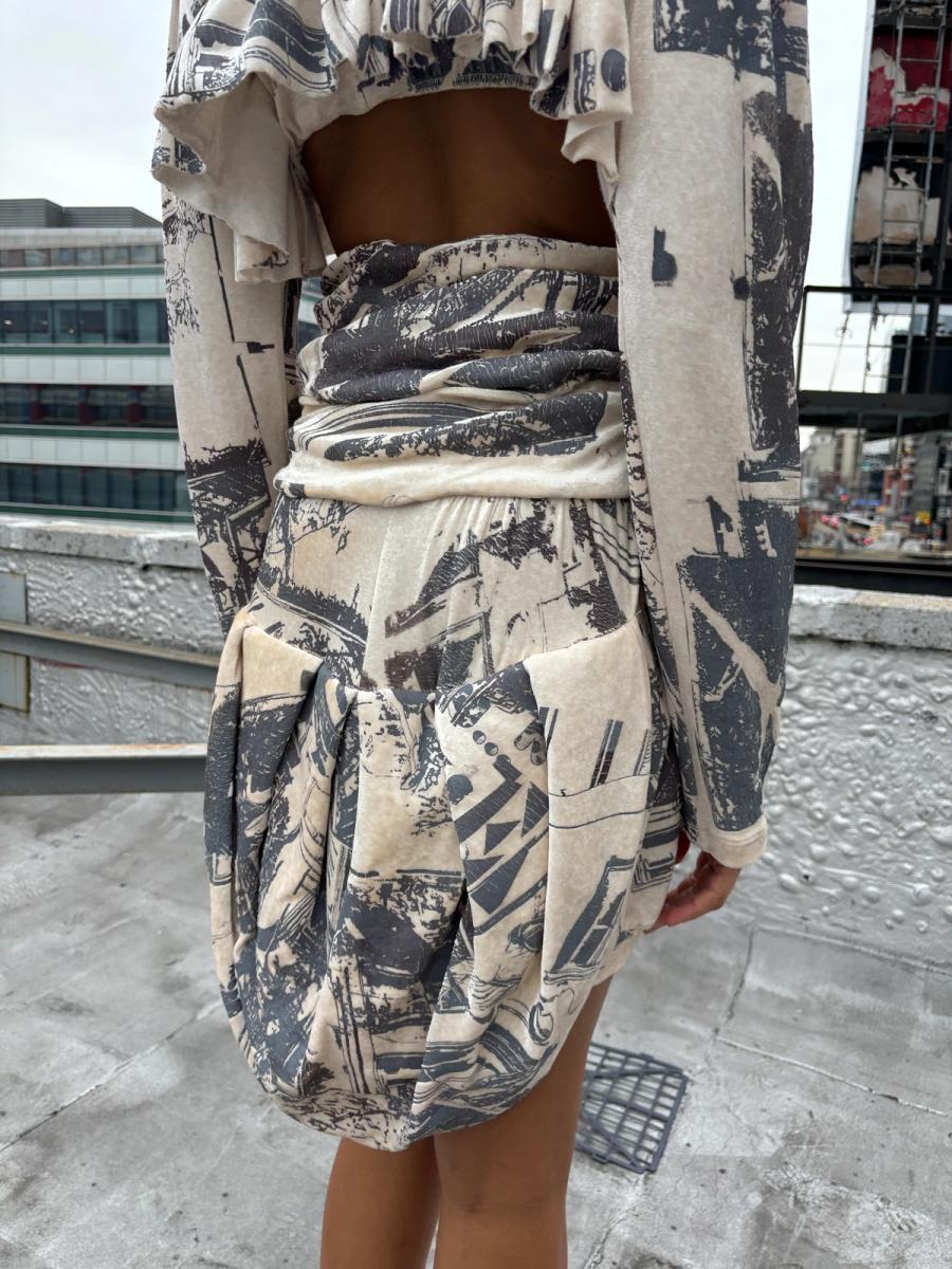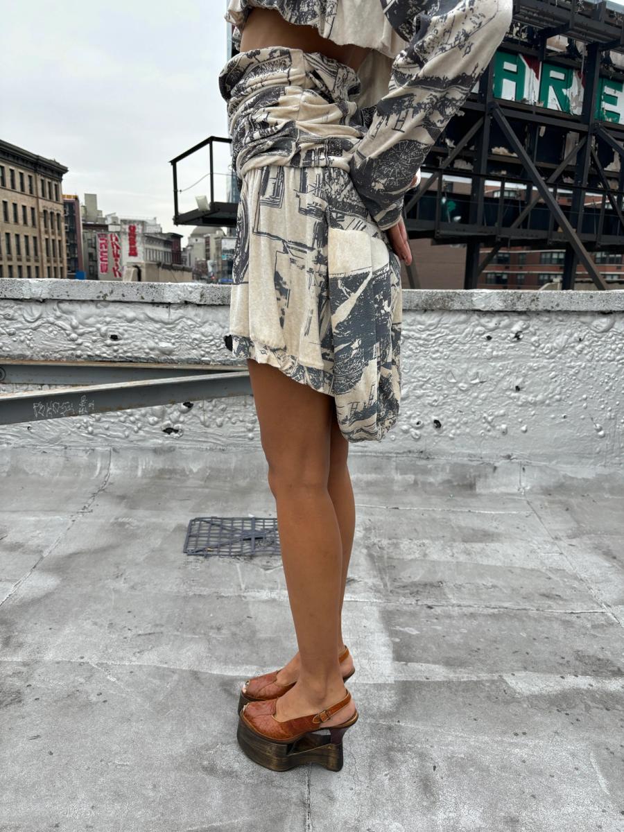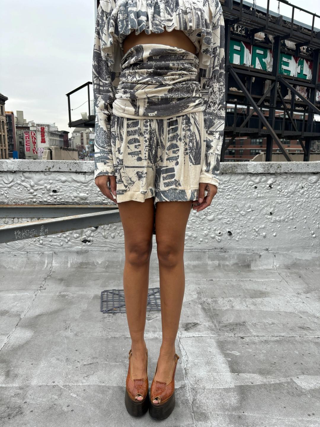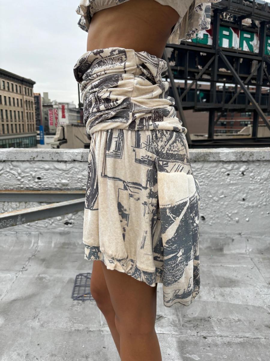 Velvet shorts with an all-over screen print featuring Parisian signage, building edifices, and Enfer text. The shorts have a high waist and a bustle in the back with boning. Made in NYC. One size.