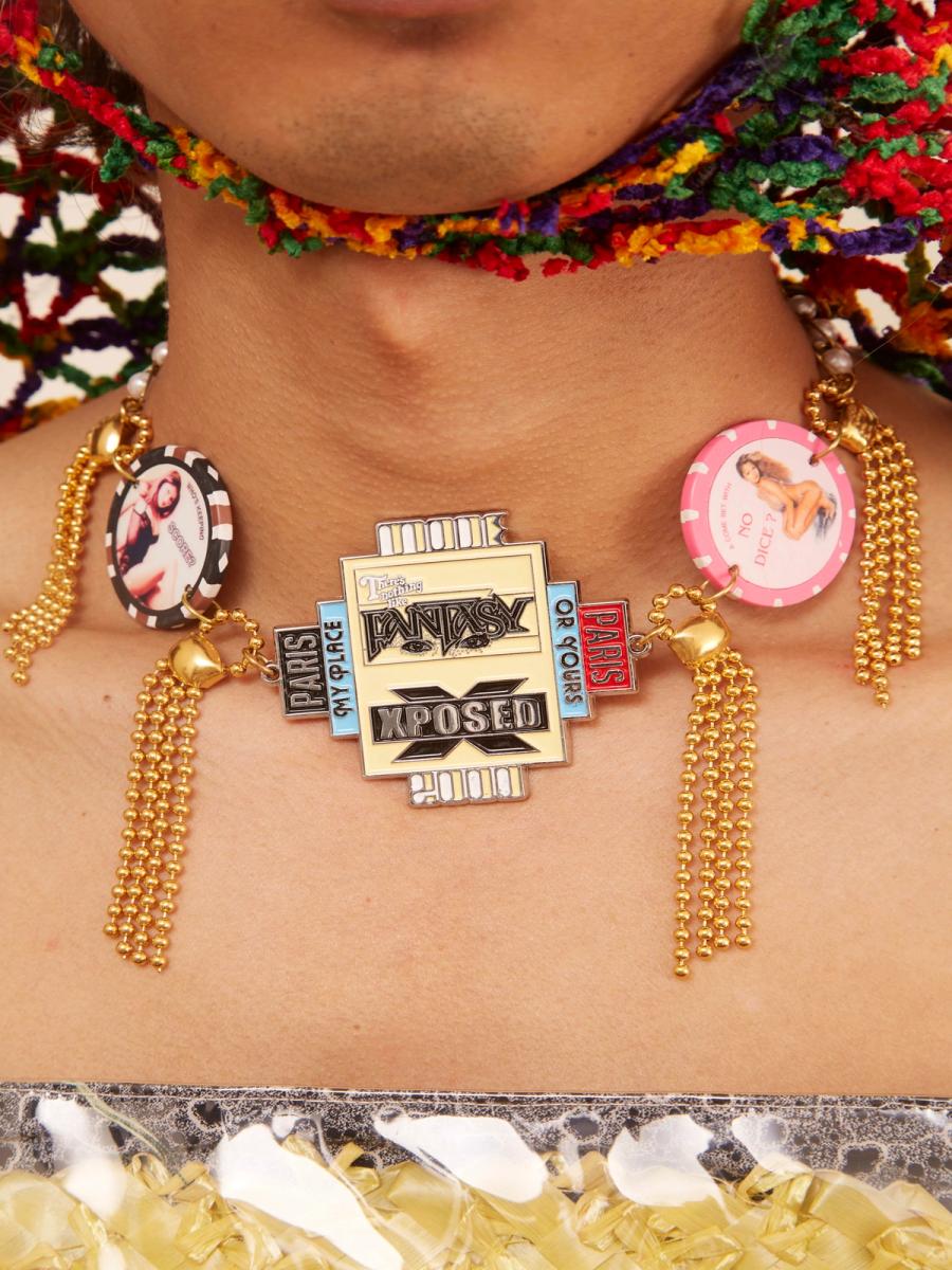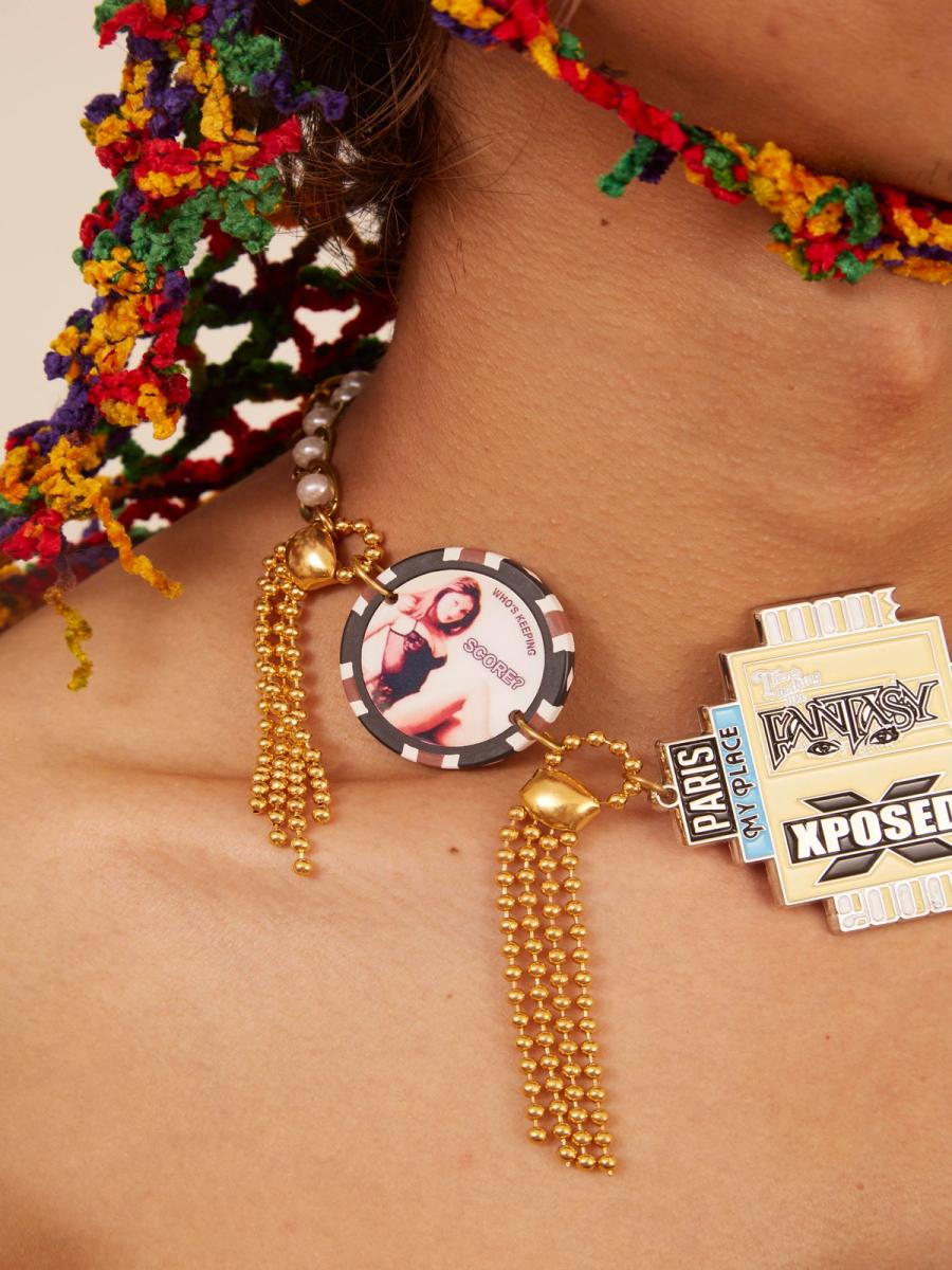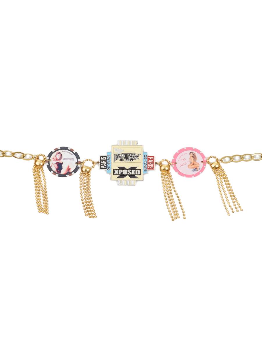 Custom enamel charm with Nevada brothel souvenir chips and brass fringe