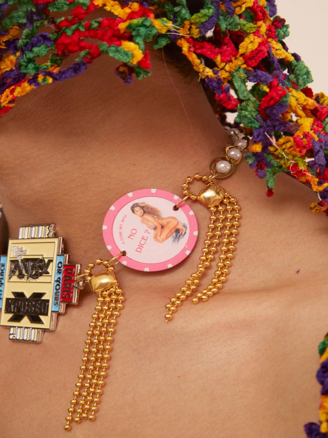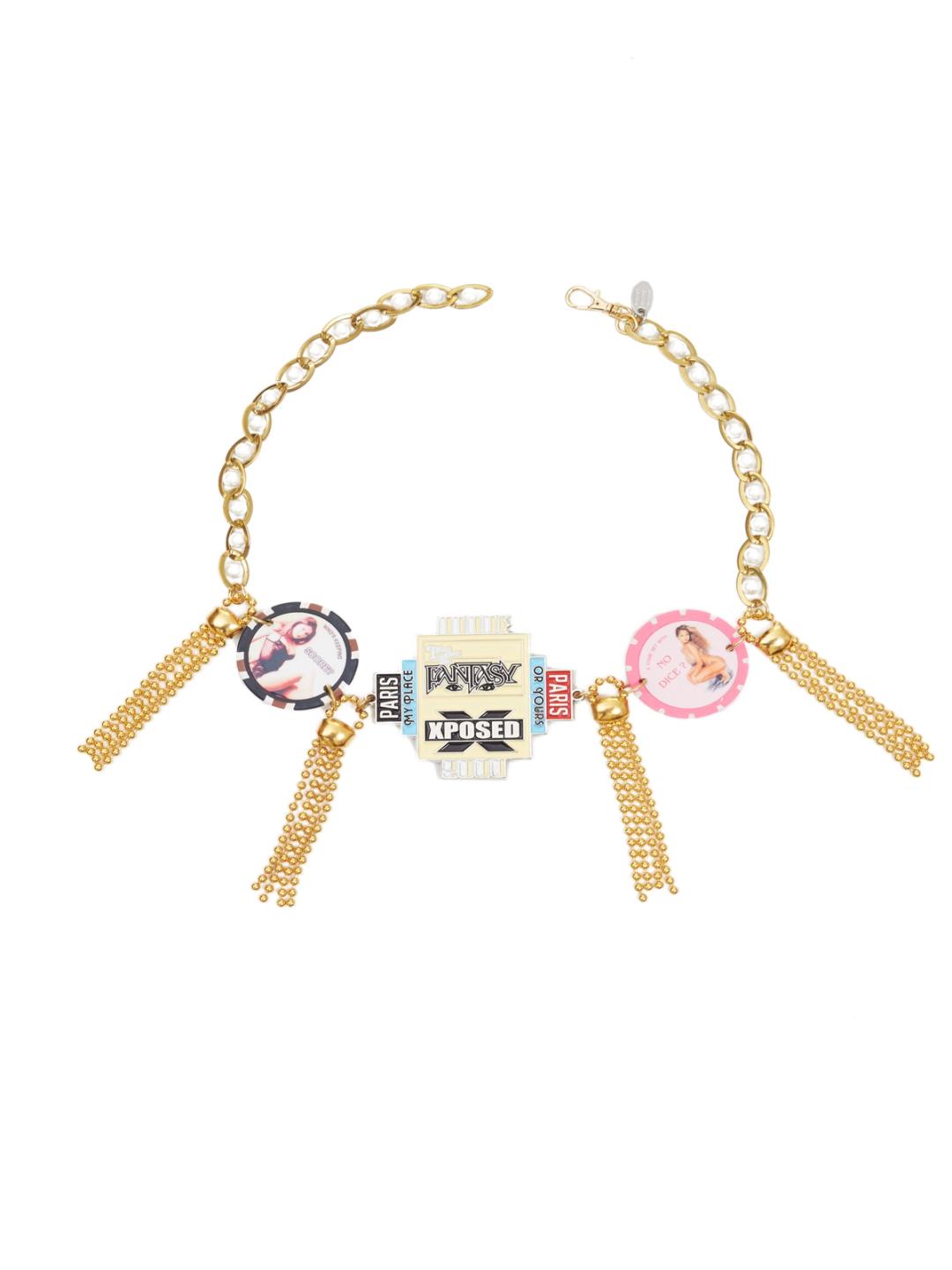 Custom enamel charm with Nevada brothel souvenir chips and brass fringe