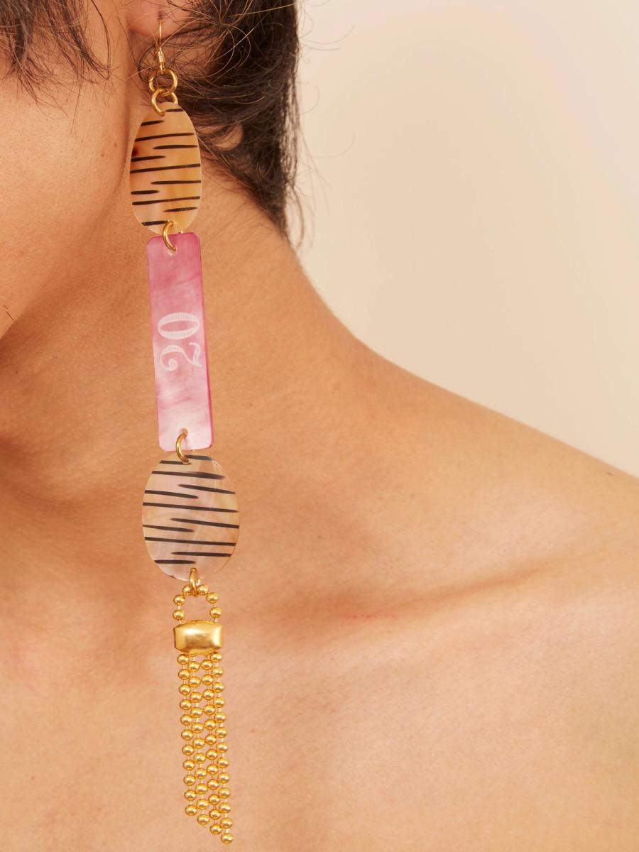Ultra long single earring made using mother- of- pearl plaquettes painted with a Zebra pattern, and pink dyed mother- of- pearl Casino Chip--both French Art Deco, and brass fringe.