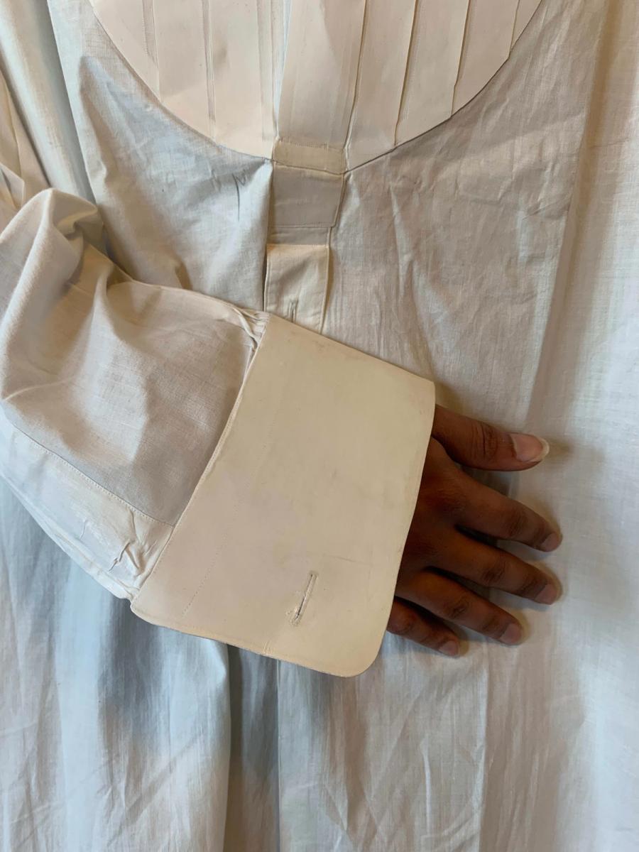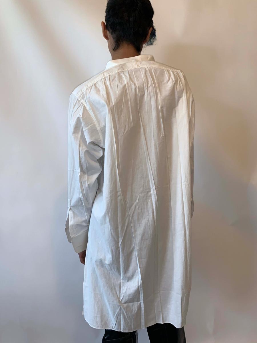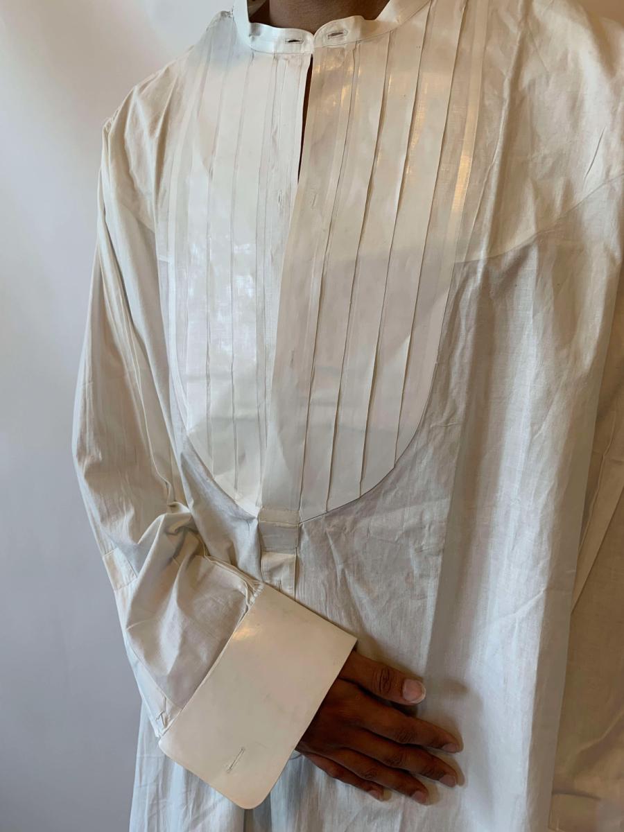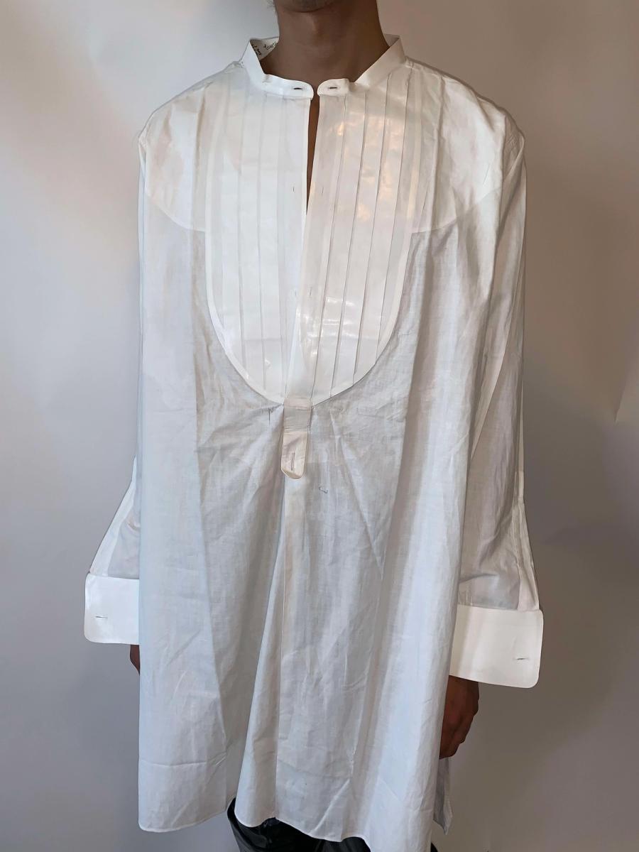 Antique Edwardian oversized dress shirt from France that has unusual wax treated sleeve cuffs and chest. The shirt is extremely oversized and can be worn as a dress! Although old, the shirt has a feel reminiscent of contemporary avant-garde designers like Margiela. In excellent vintage condition!