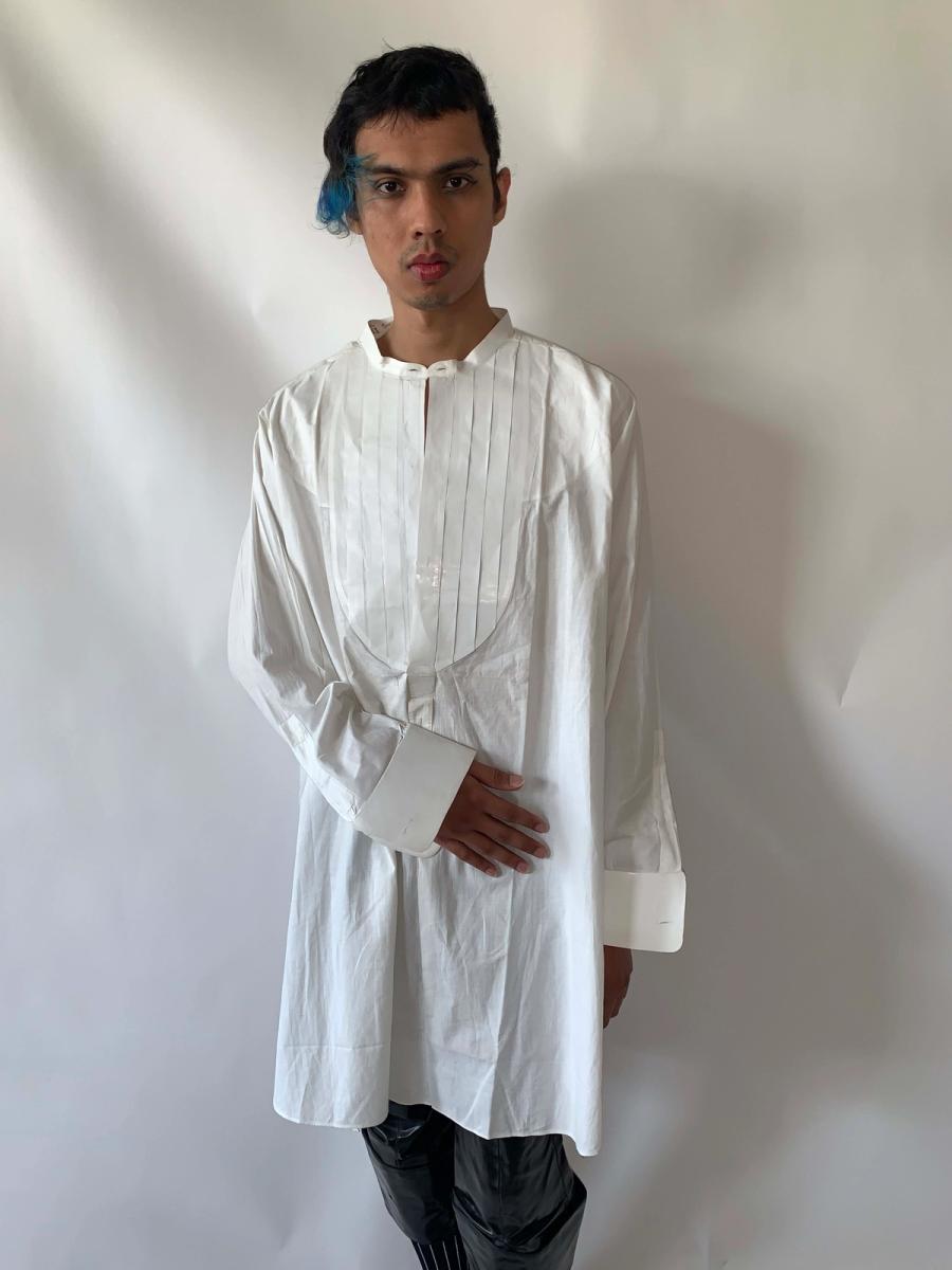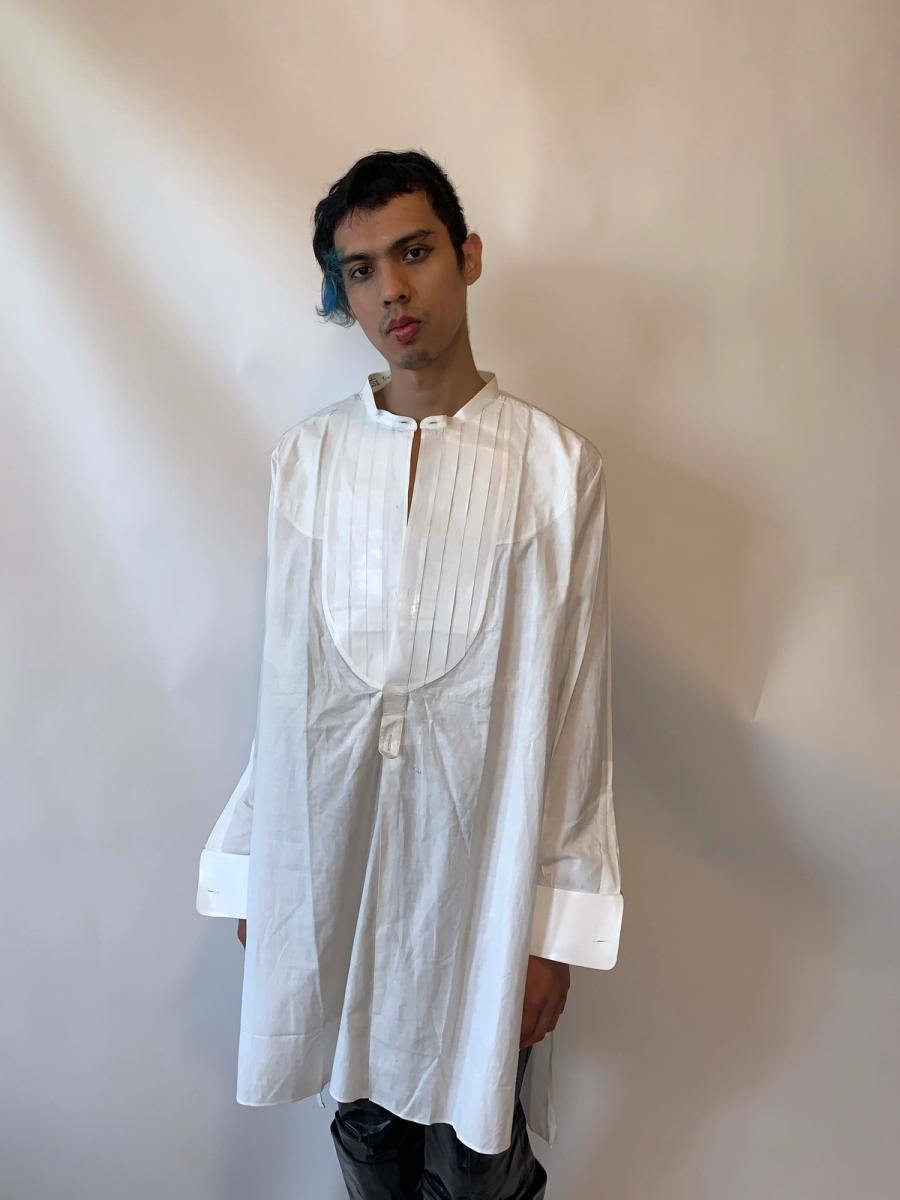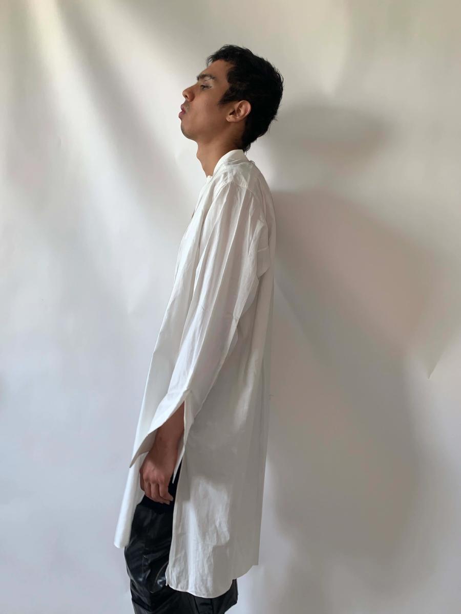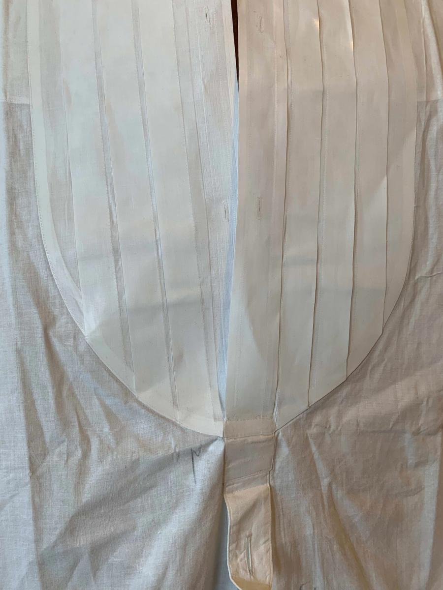 Antique Edwardian oversized dress shirt from France that has unusual wax treated sleeve cuffs and chest. The shirt is extremely oversized and can be worn as a dress! Although old, the shirt has a feel reminiscent of contemporary avant-garde designers like Margiela. In excellent vintage condition!