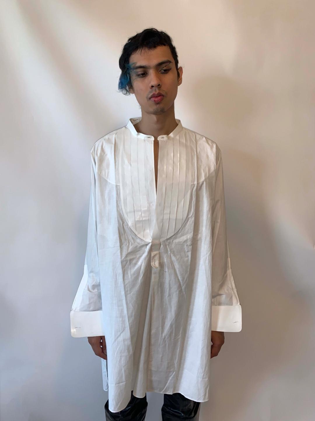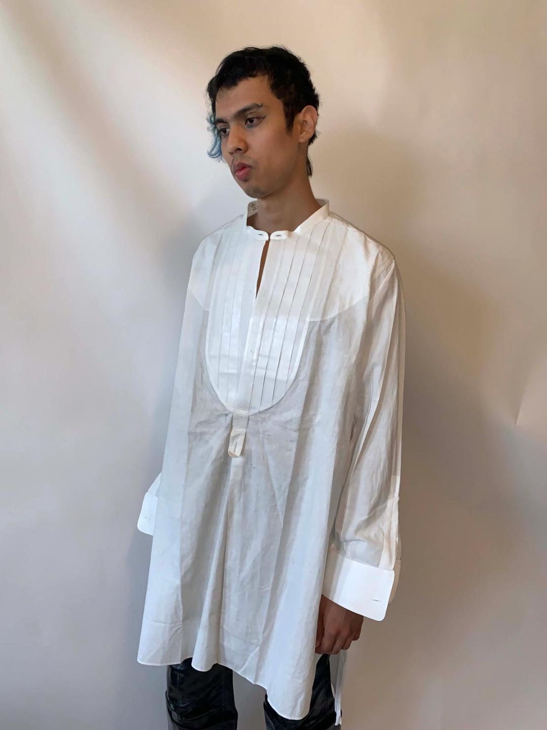Antique Edwardian oversized dress shirt from France that has unusual wax treated sleeve cuffs and chest. The shirt is extremely oversized and can be worn as a dress! Although old, the shirt has a feel reminiscent of contemporary avant-garde designers like Margiela. In excellent vintage condition!