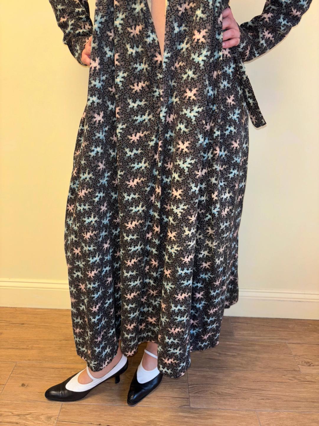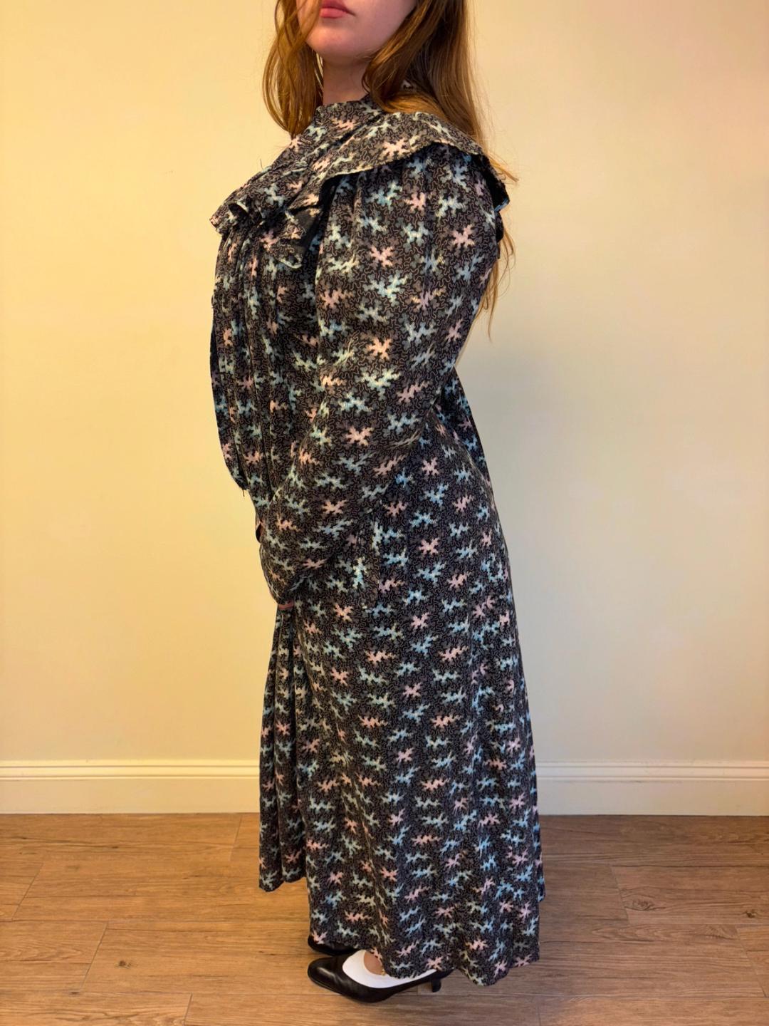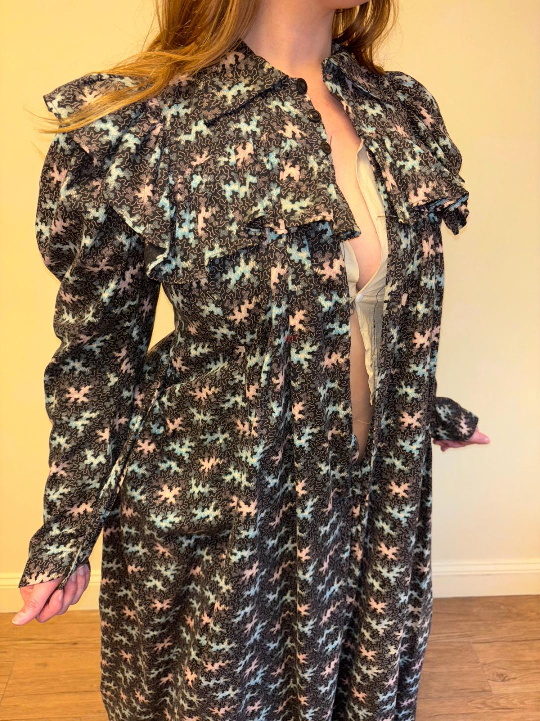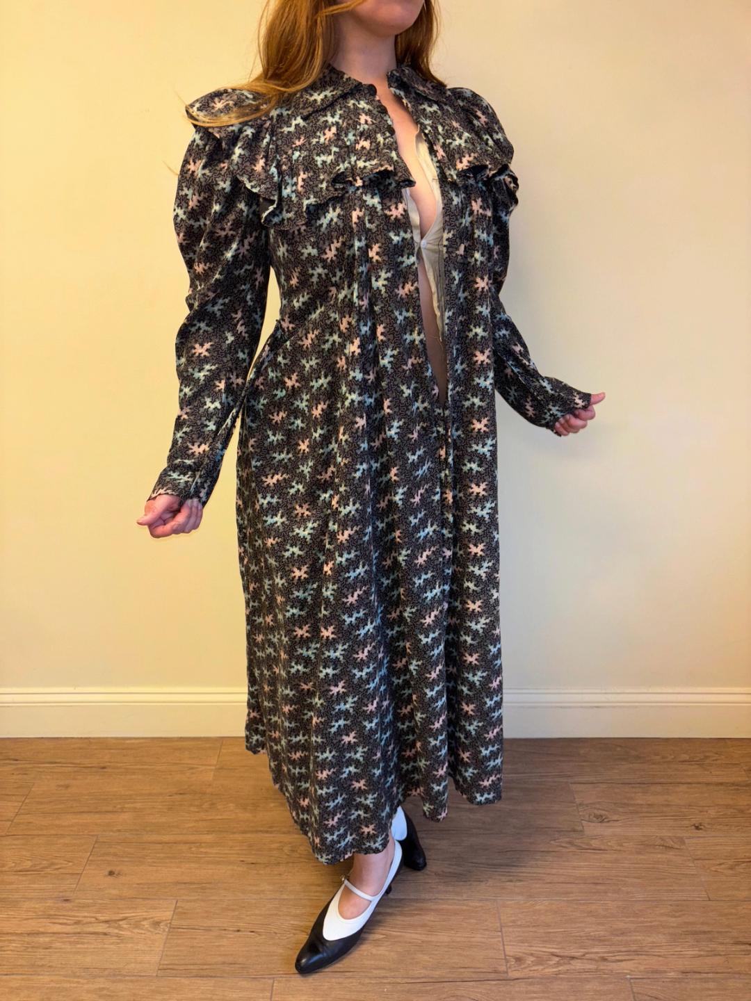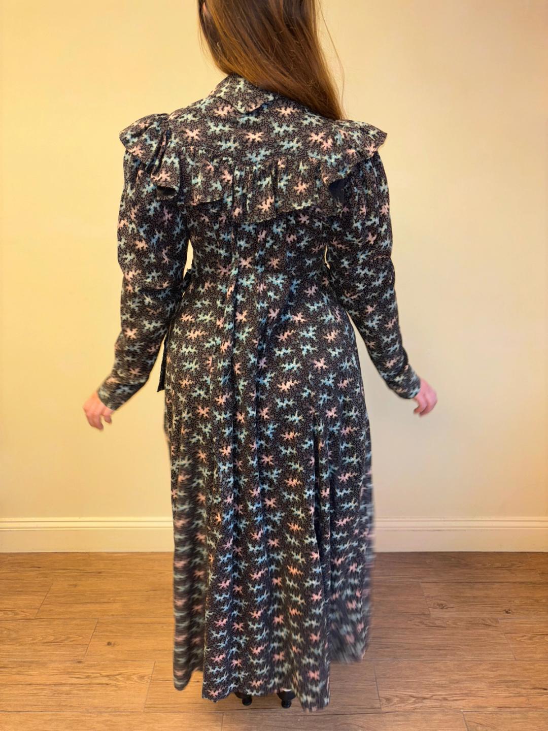Stunning and rare late Victorian workwear dress with abstract vermicular print in black, vibrant pink and blue. "Vermincular" referred to a genre of printed textiles designs which emerged during the late 19th century which were inspired by the view under a microscope. The wrapper is made of cotton and in sturdy wearable condition. High neck, hook and eye closures, cinching sash at back and 3/4 length mutton sleeves.
