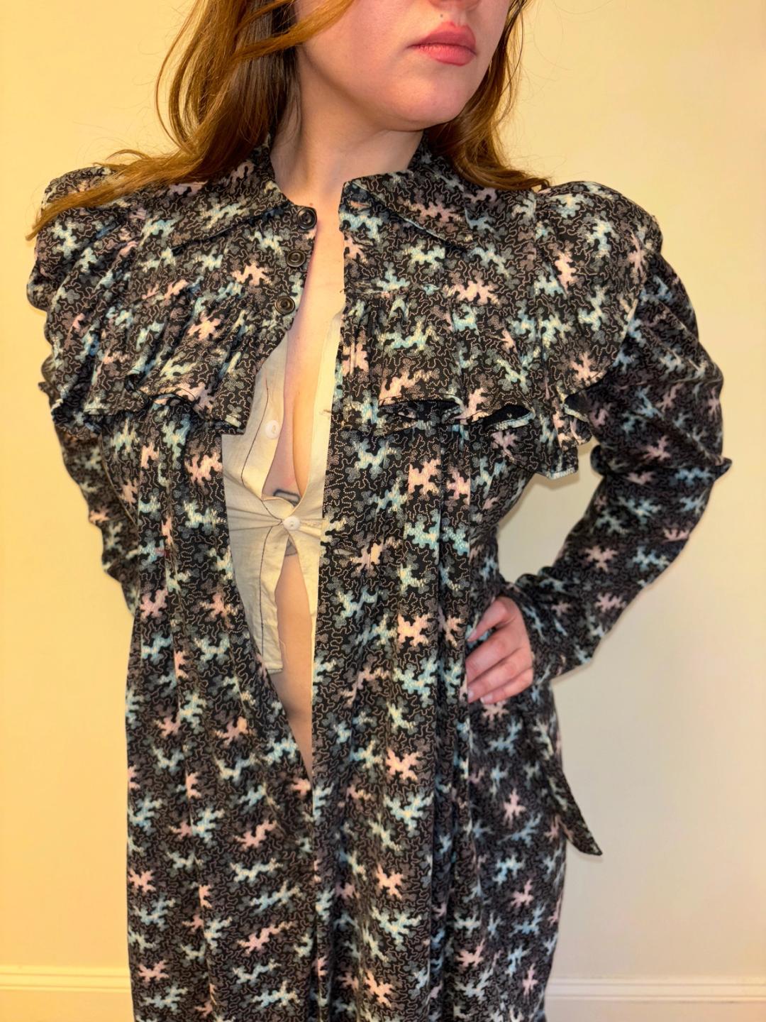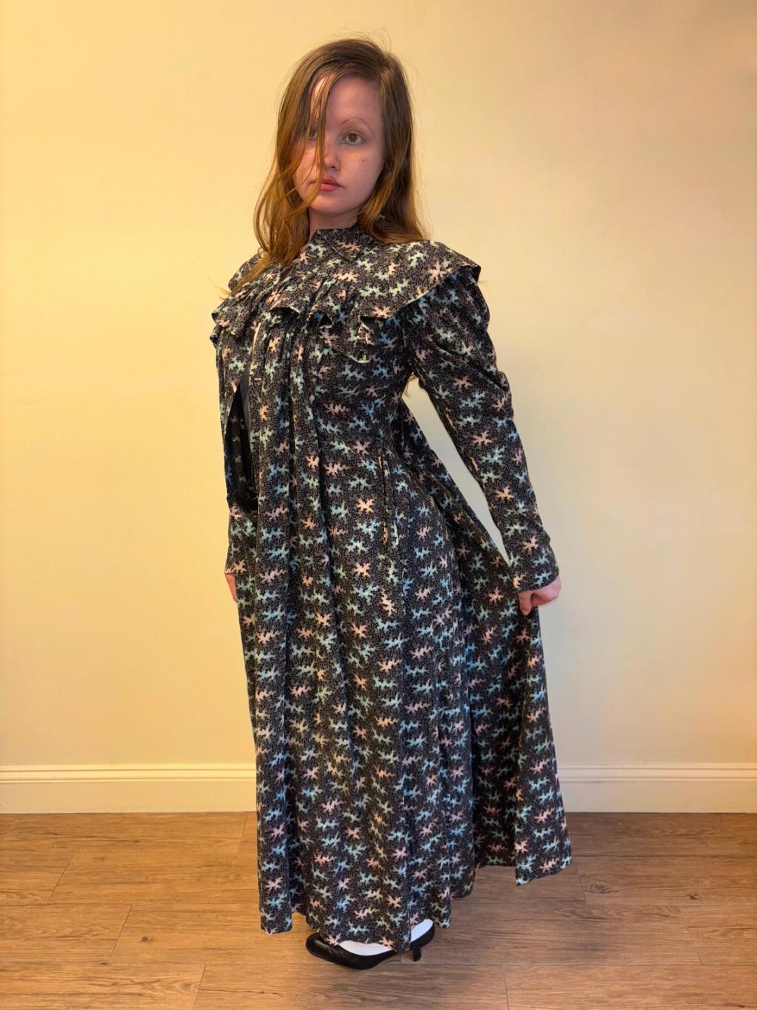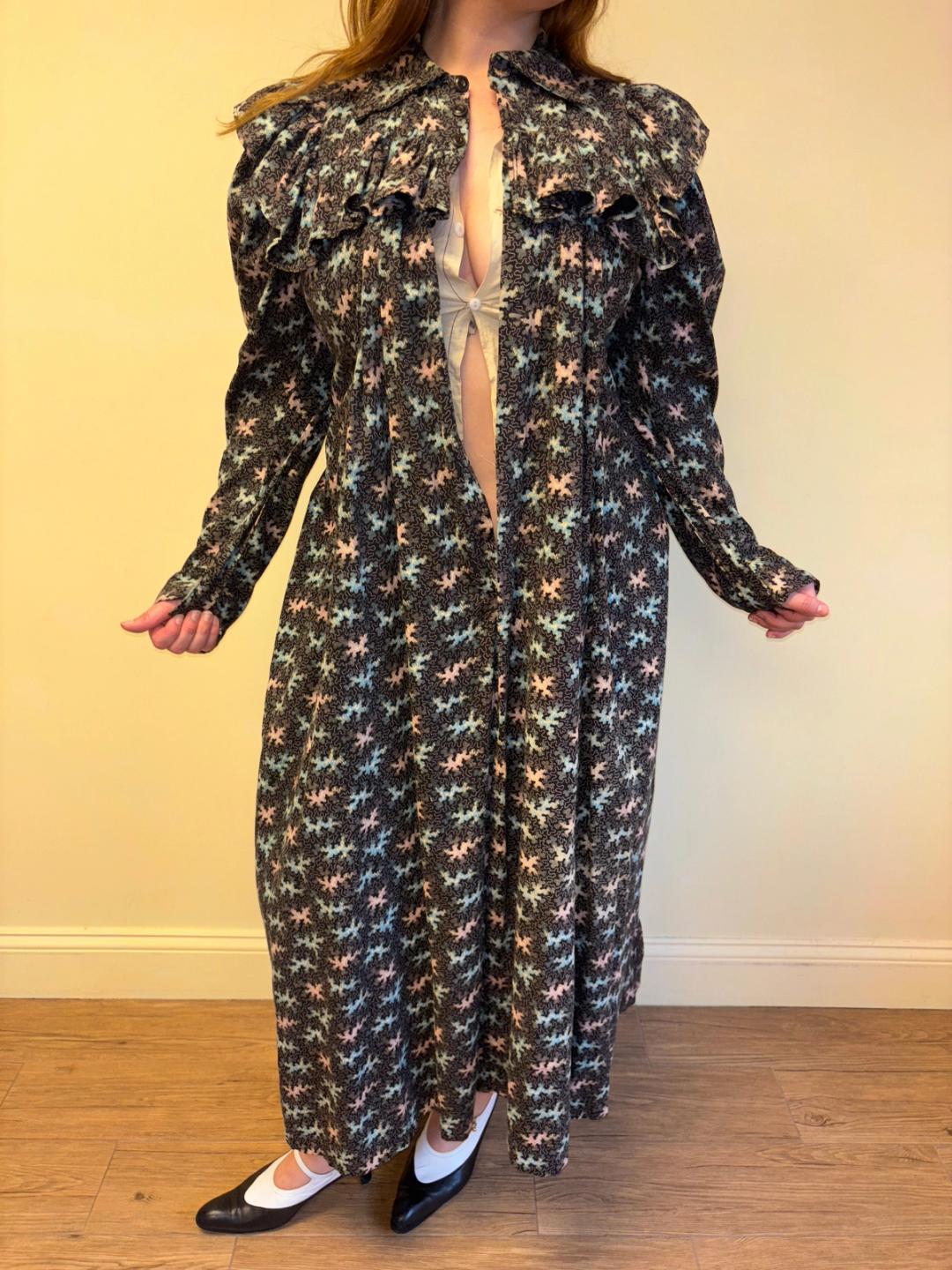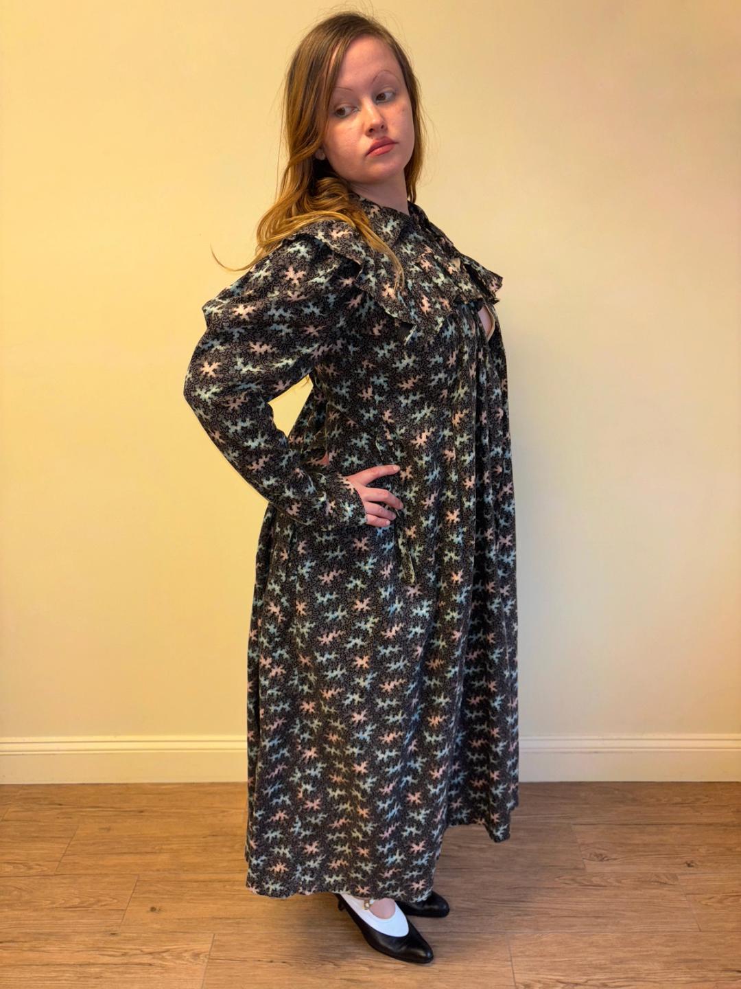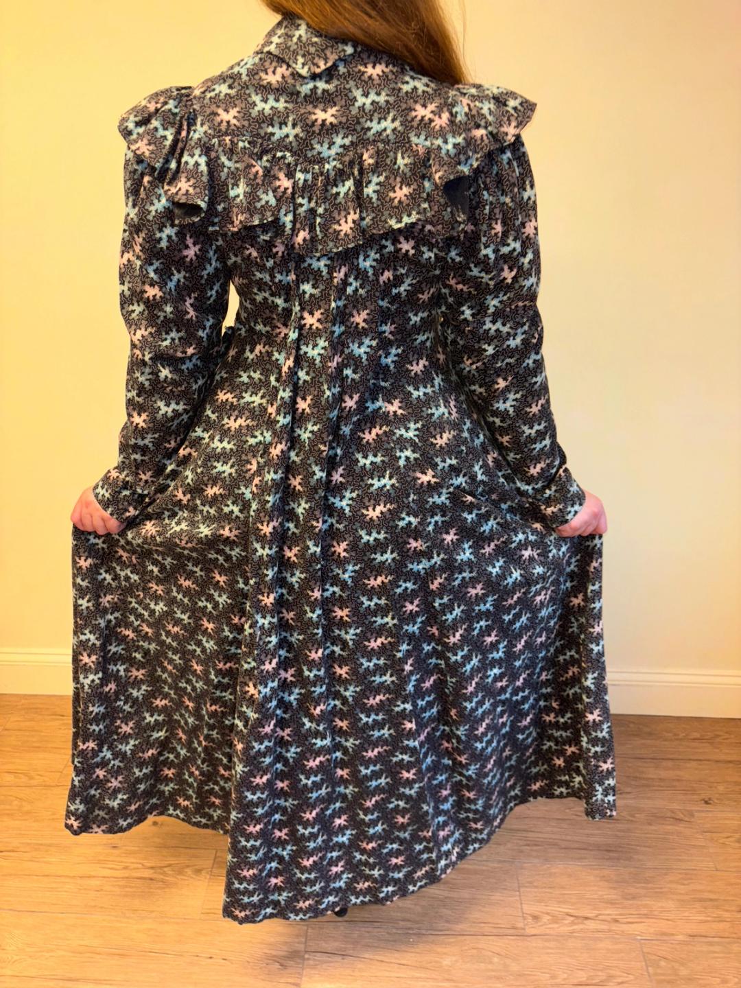 Stunning and rare late Victorian workwear dress with abstract vermicular print in black, vibrant pink and blue. "Vermincular" referred to a genre of printed textiles designs which emerged during the late 19th century which were inspired by the view under a microscope. The wrapper is made of cotton and in sturdy wearable condition. High neck, hook and eye closures, cinching sash at back and 3/4 length mutton sleeves.