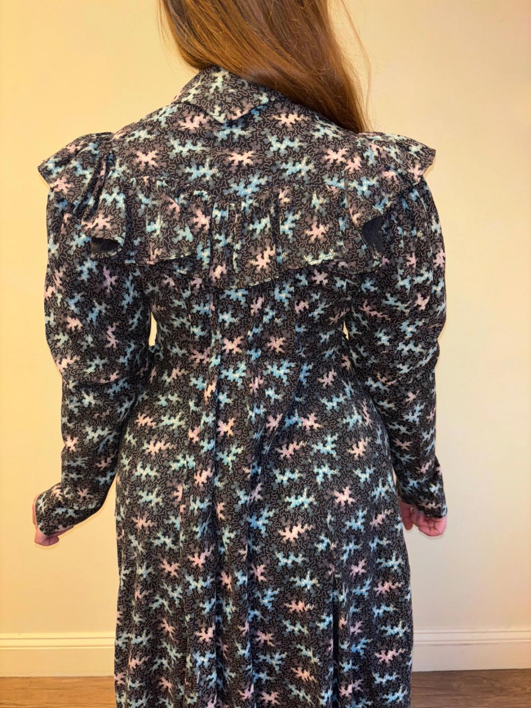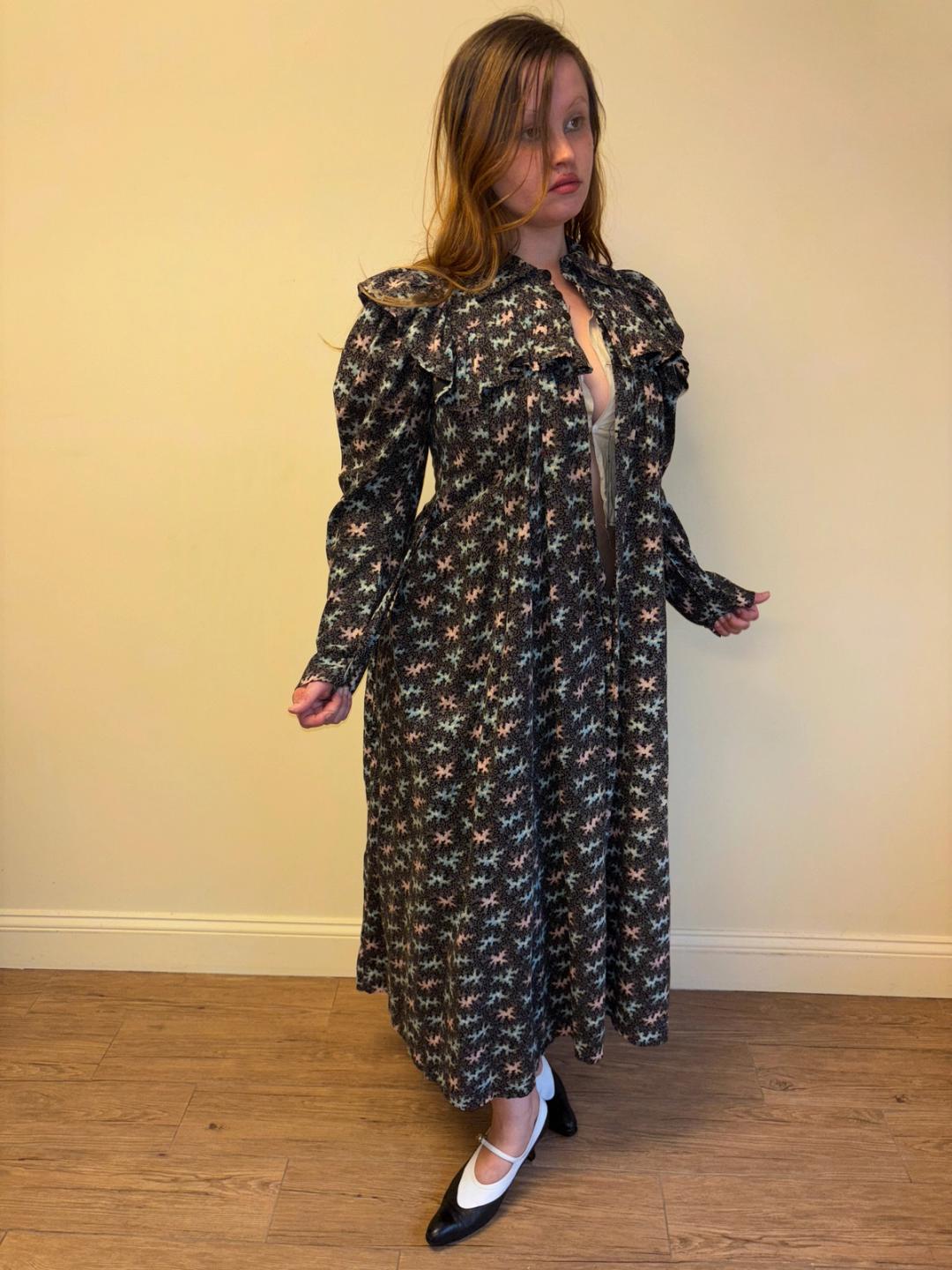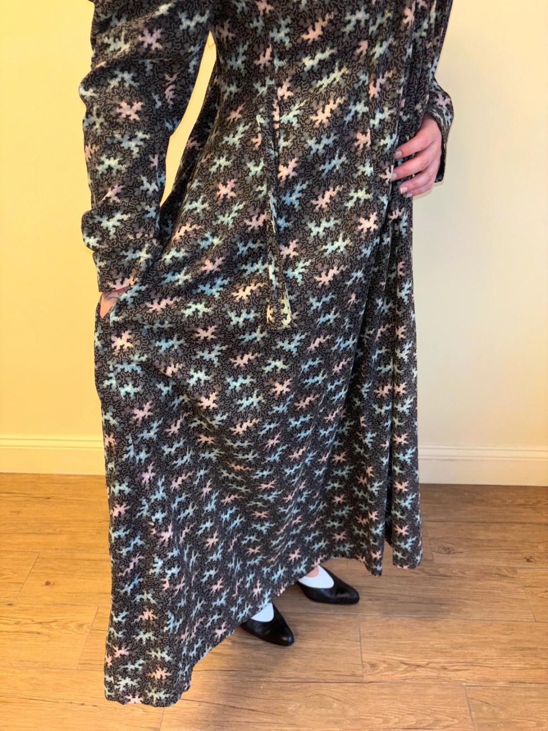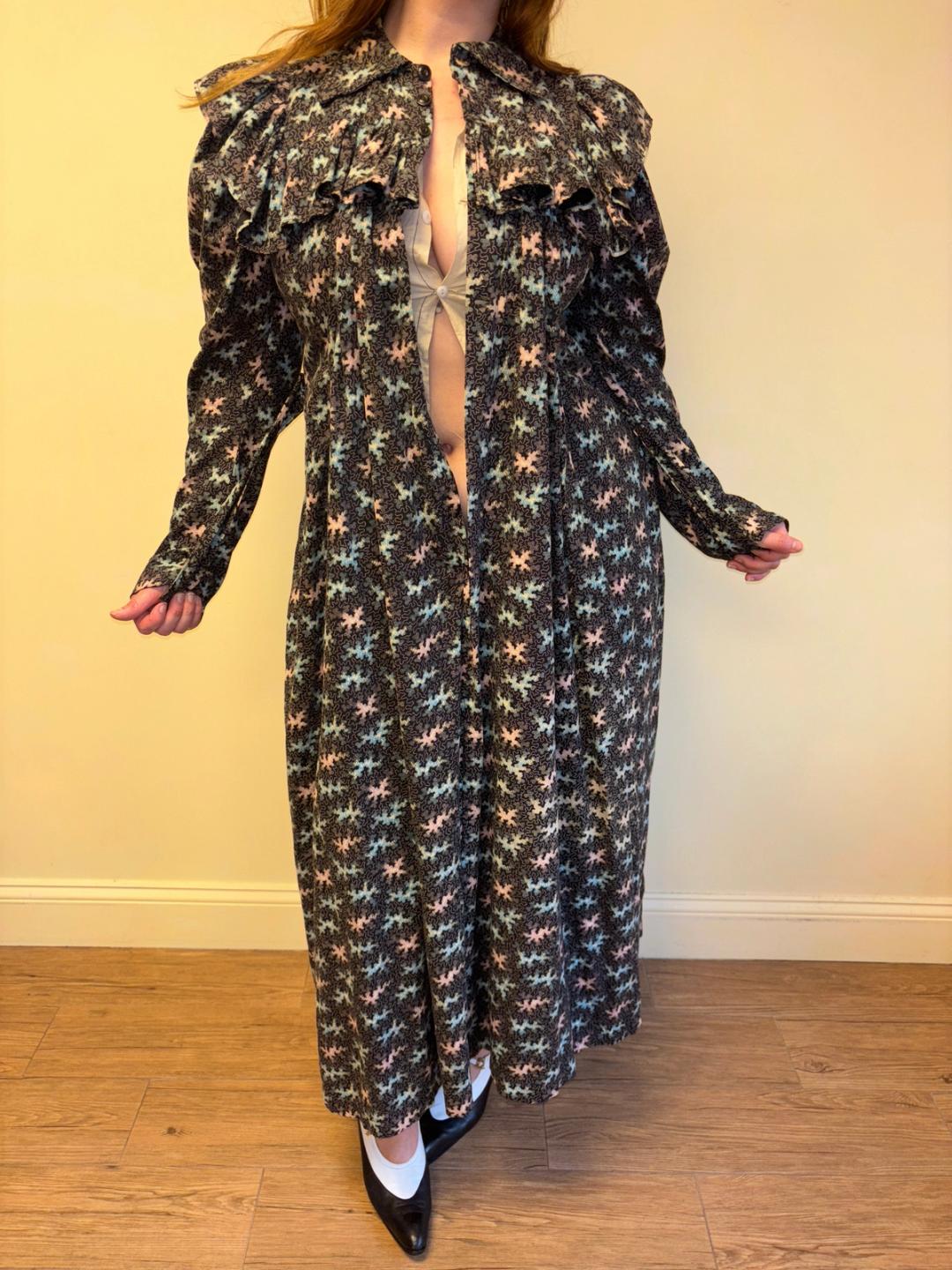 Stunning and rare late Victorian workwear dress with abstract vermicular print in black, vibrant pink and blue. "Vermincular" referred to a genre of printed textiles designs which emerged during the late 19th century which were inspired by the view under a microscope. The wrapper is made of cotton and in sturdy wearable condition. High neck, hook and eye closures, cinching sash at back and 3/4 length mutton sleeves.