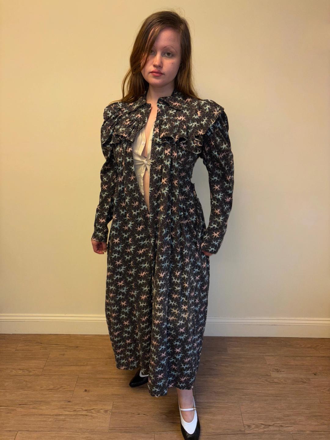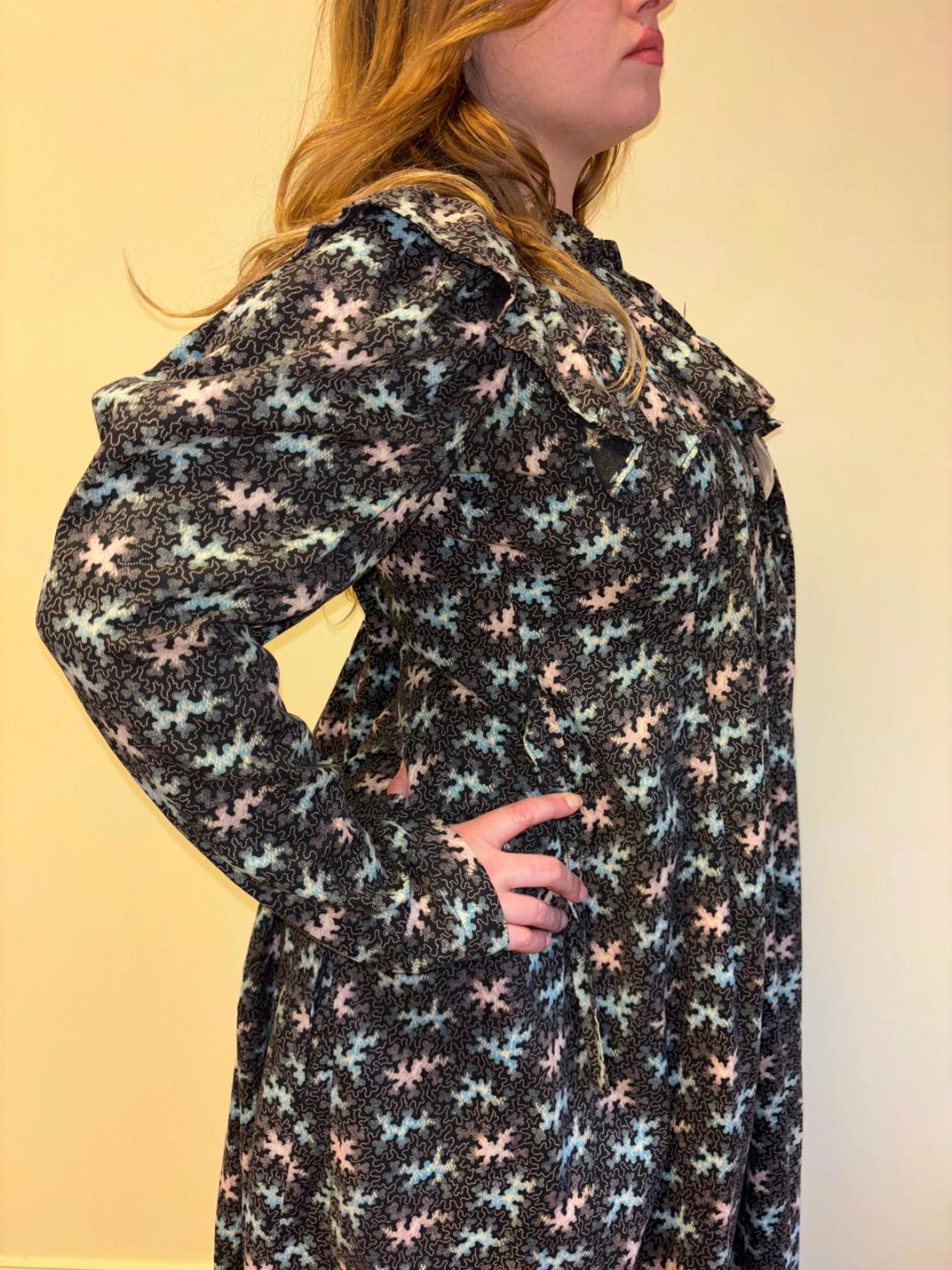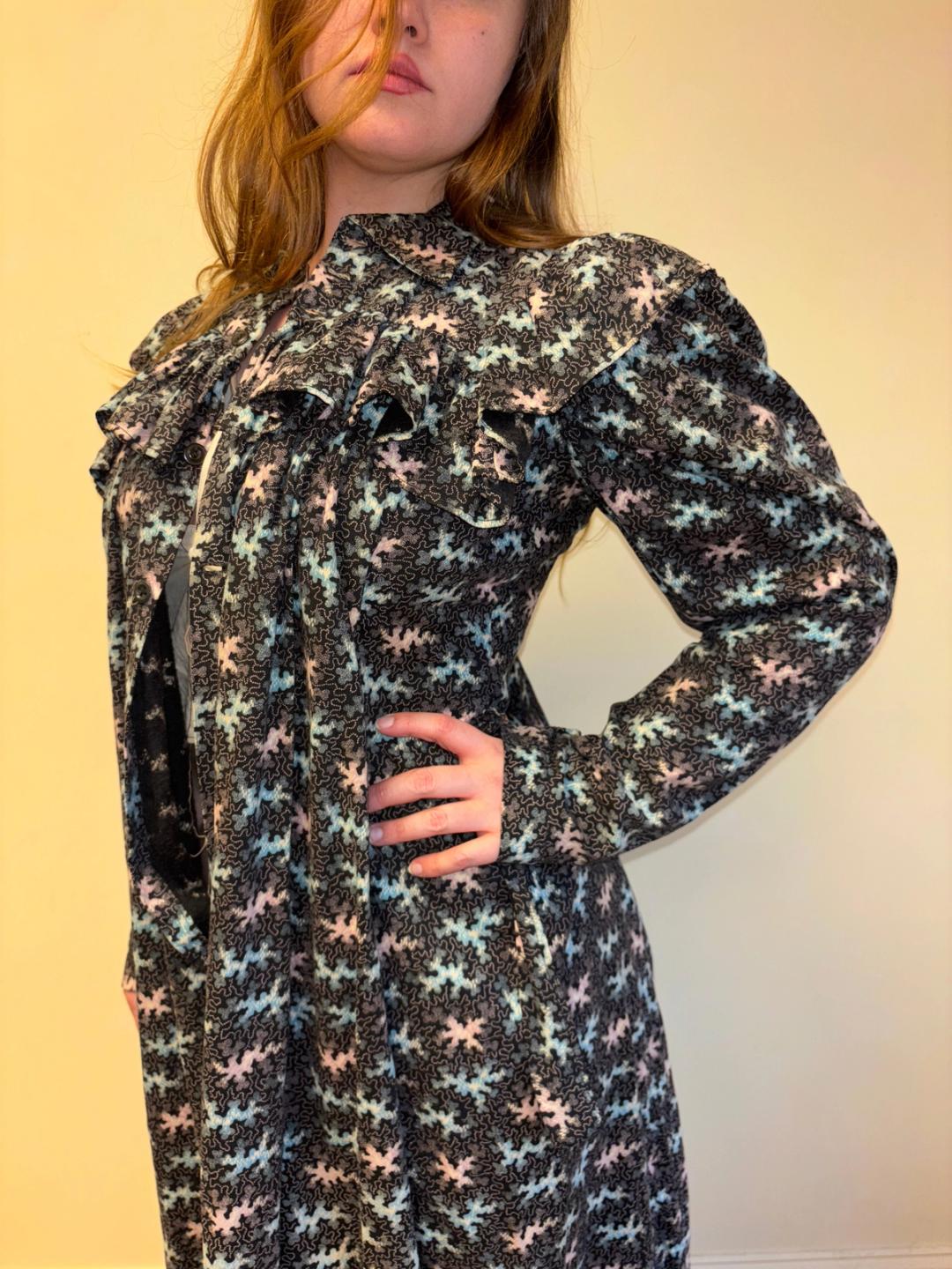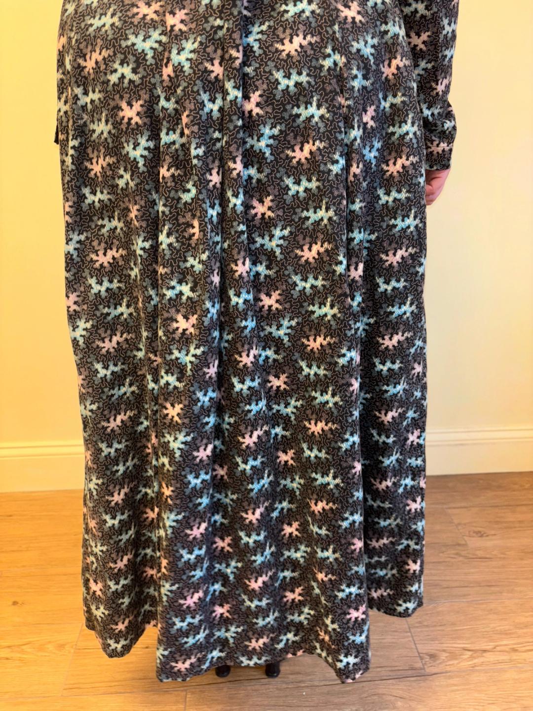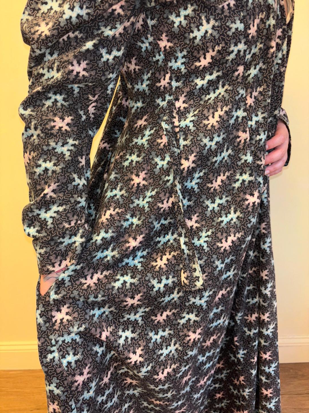 Stunning and rare late Victorian workwear dress with abstract vermicular print in black, vibrant pink and blue. "Vermincular" referred to a genre of printed textiles designs which emerged during the late 19th century which were inspired by the view under a microscope. The wrapper is made of cotton and in sturdy wearable condition. High neck, hook and eye closures, cinching sash at back and 3/4 length mutton sleeves.