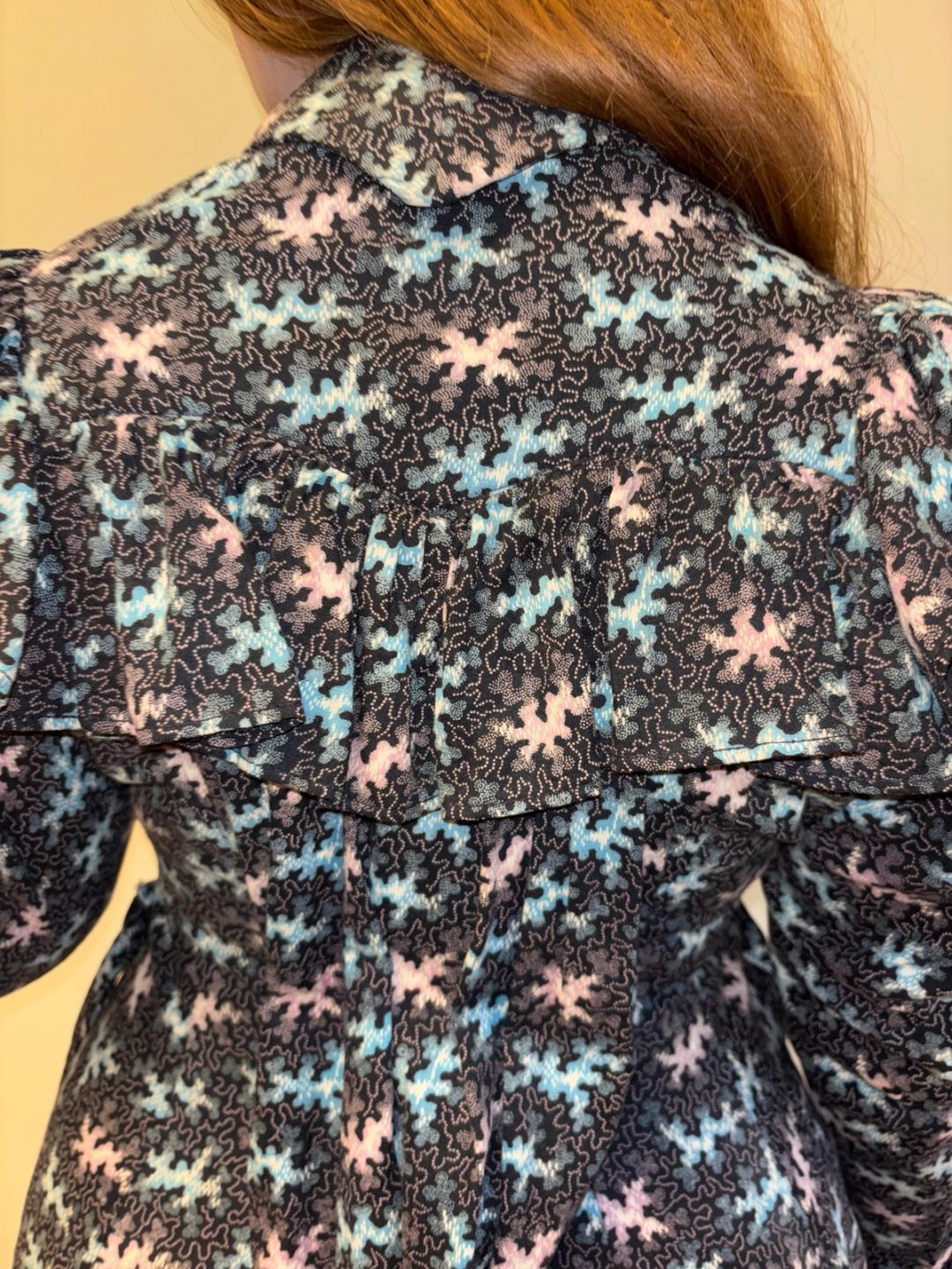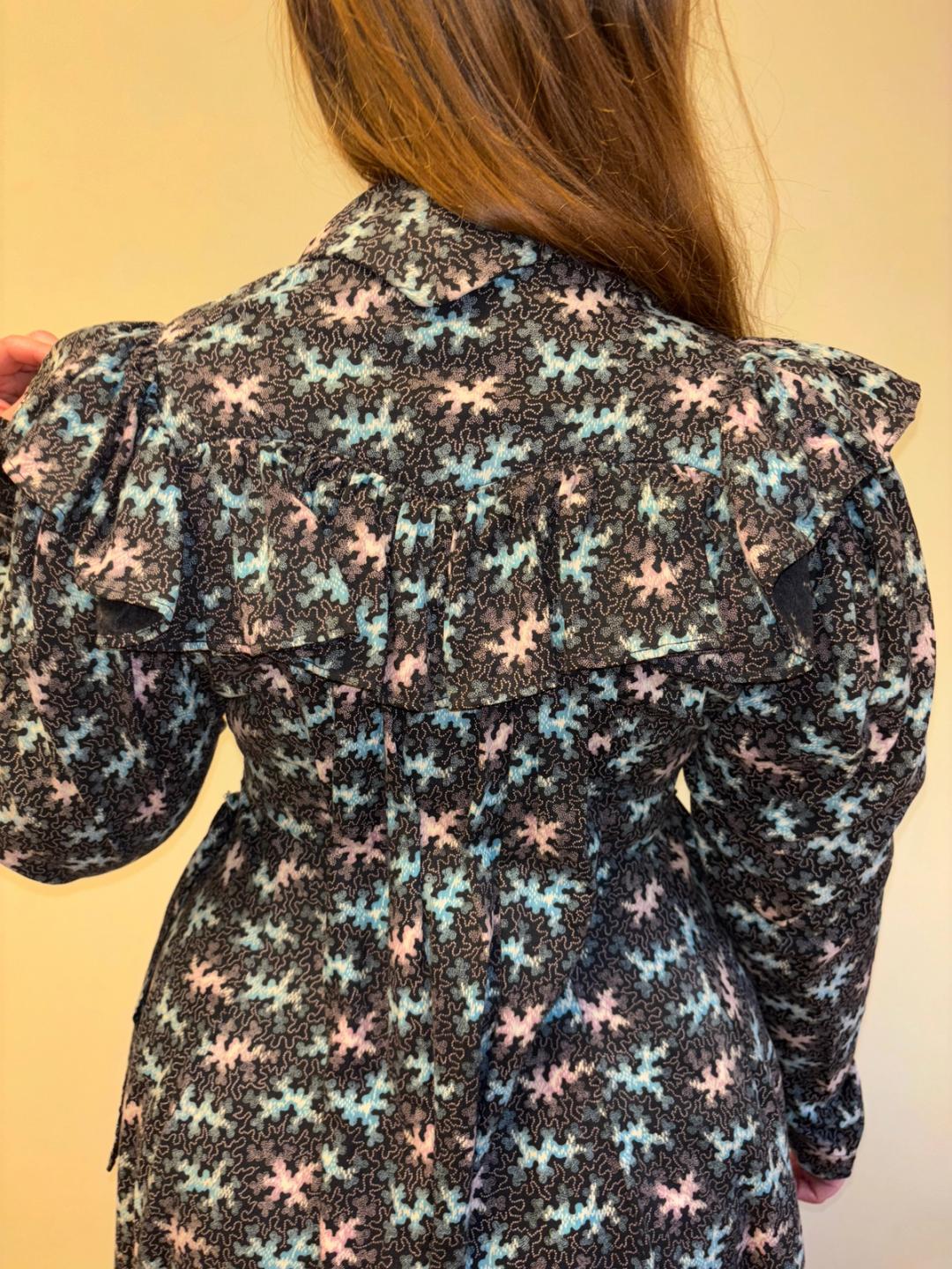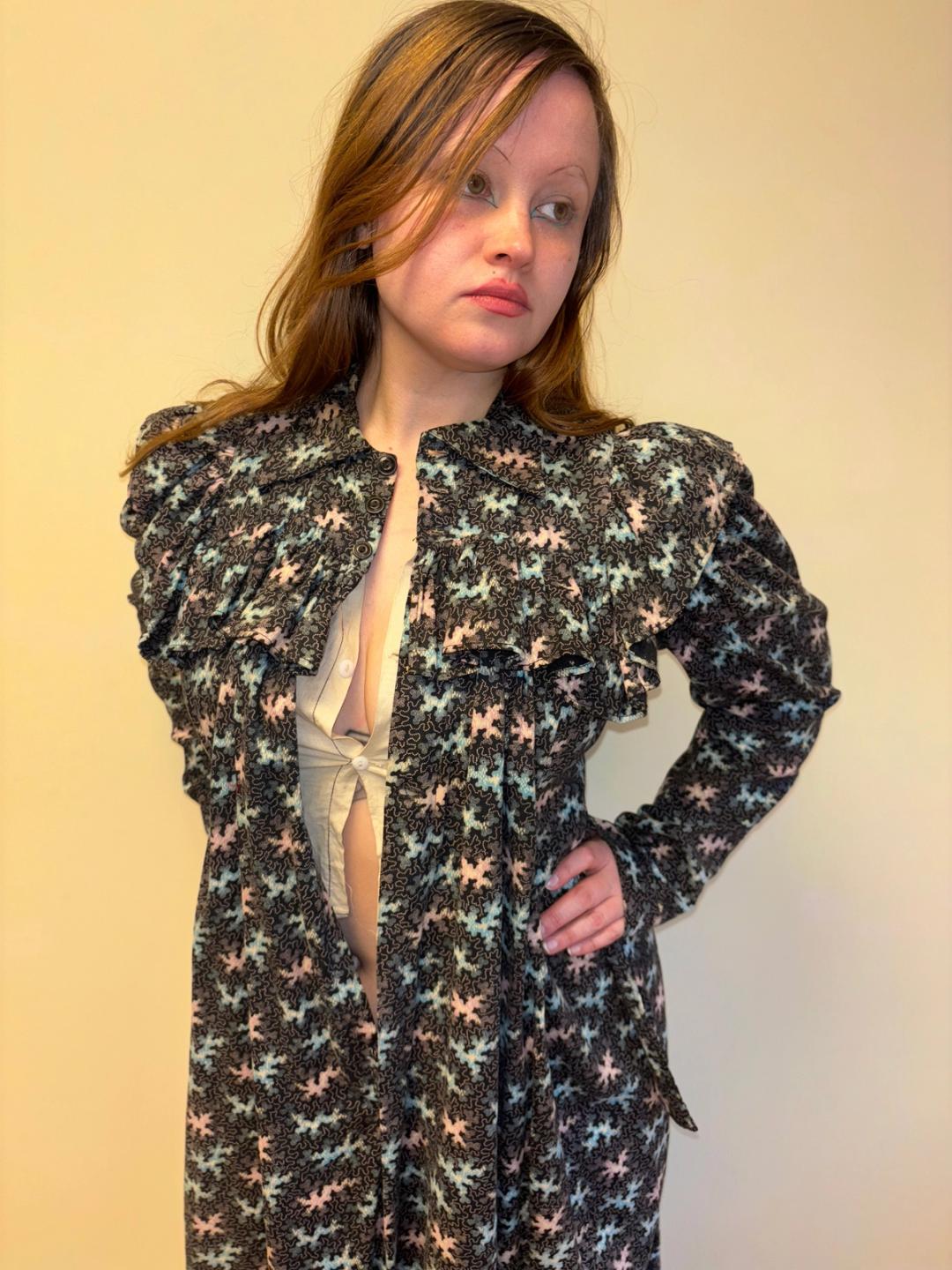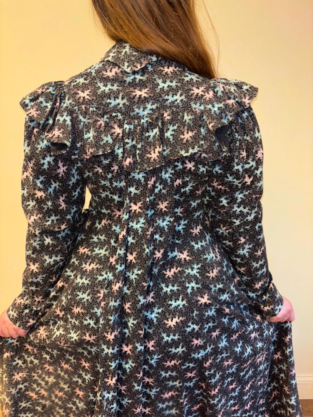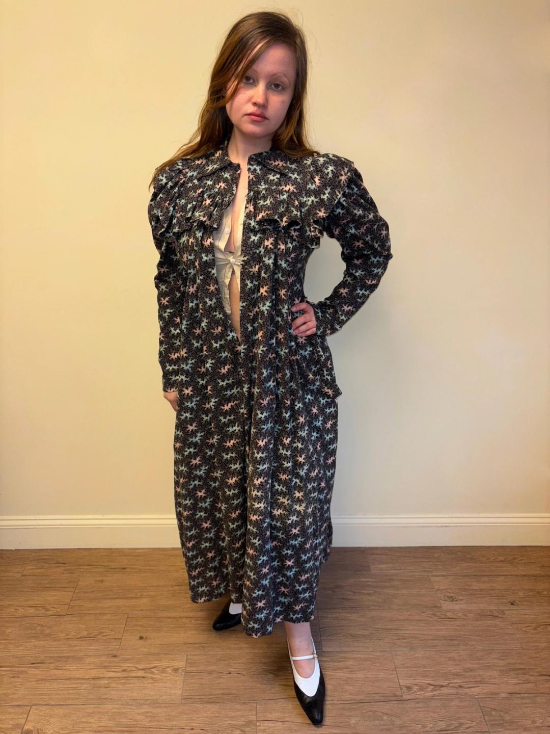 Stunning and rare late Victorian workwear dress with abstract vermicular print in black, vibrant pink and blue. "Vermincular" referred to a genre of printed textiles designs which emerged during the late 19th century which were inspired by the view under a microscope. The wrapper is made of cotton and in sturdy wearable condition. High neck, hook and eye closures, cinching sash at back and 3/4 length mutton sleeves.