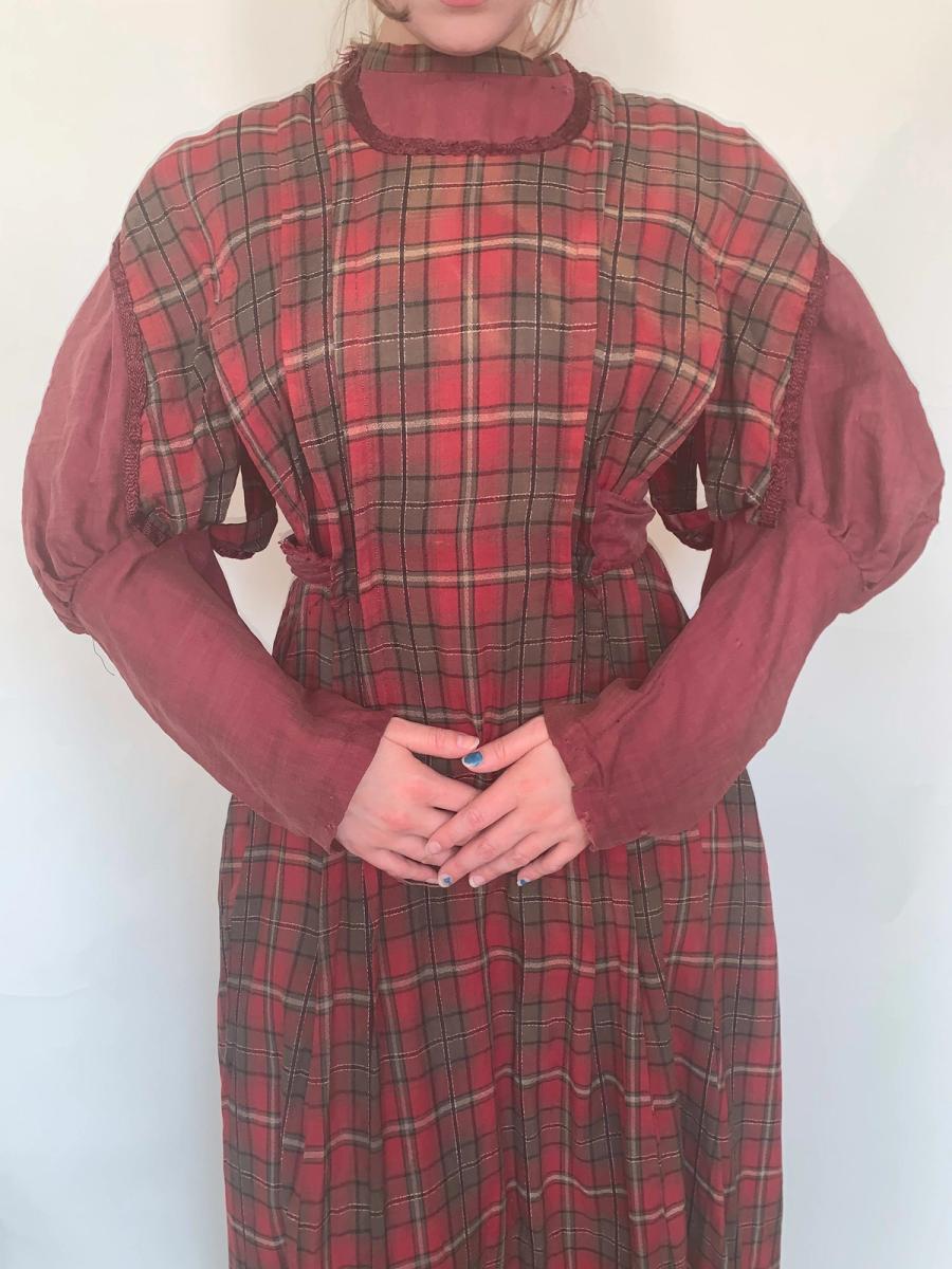 Late 1890s- early 1900s lightweight plaid wool challis and cotton work dress with pouffy leg o' mutton slashed Juliet sleeves-- because of the pinafore style it almost appears a two piece ensemble. It has all its original hook and eye closures, and a sash belt fastens at the back. The outer plaid fabric has some wear, fading, and discoloration, but overall is in strong, wearable condition. The inner cotton lining of the bodice is fragile, (patched and reinforced in places). Its flaws only add to its beautiful character. It is an innovative and stylish dress, a wearable artifact of the working woman at the turn of the century!