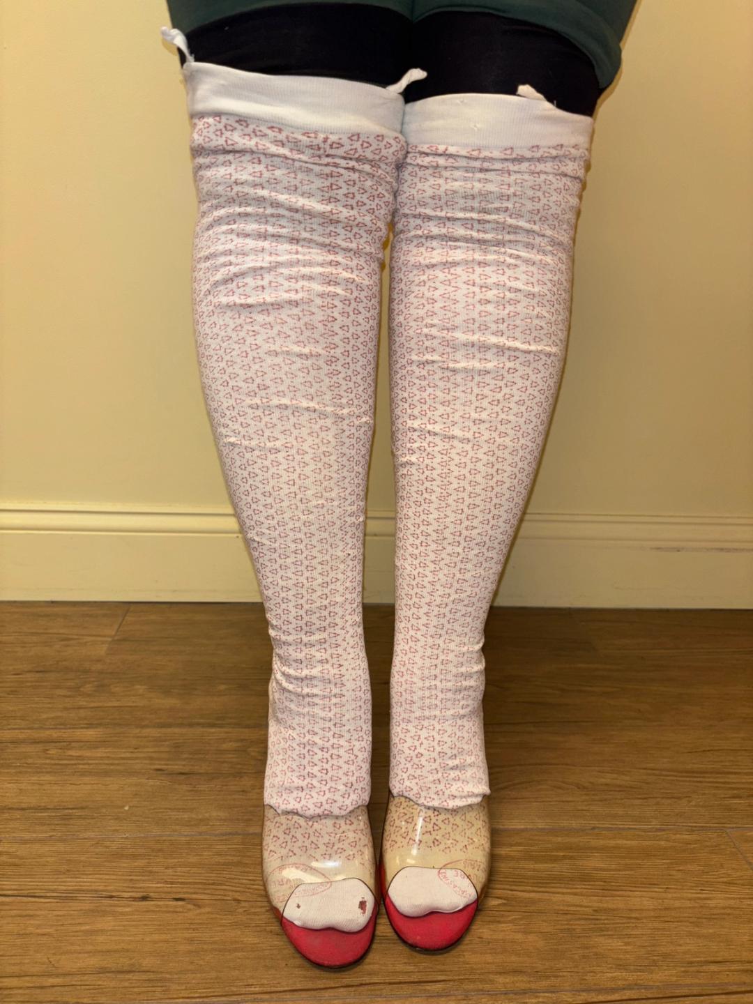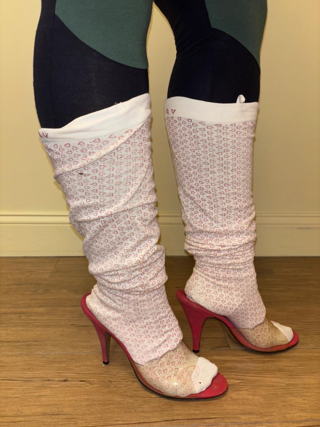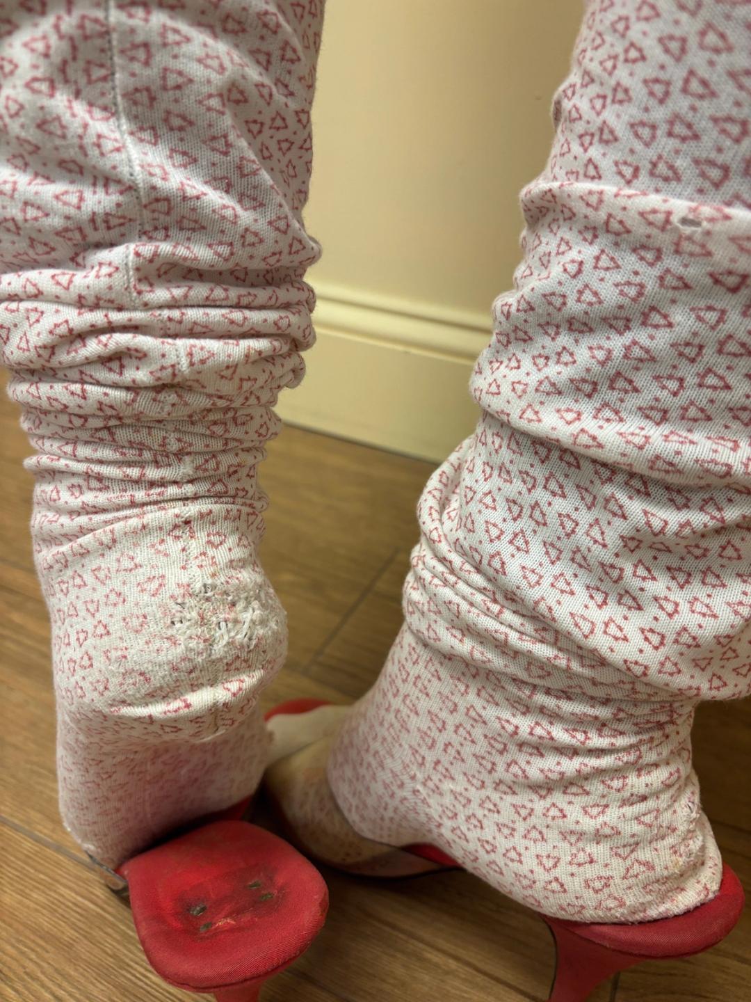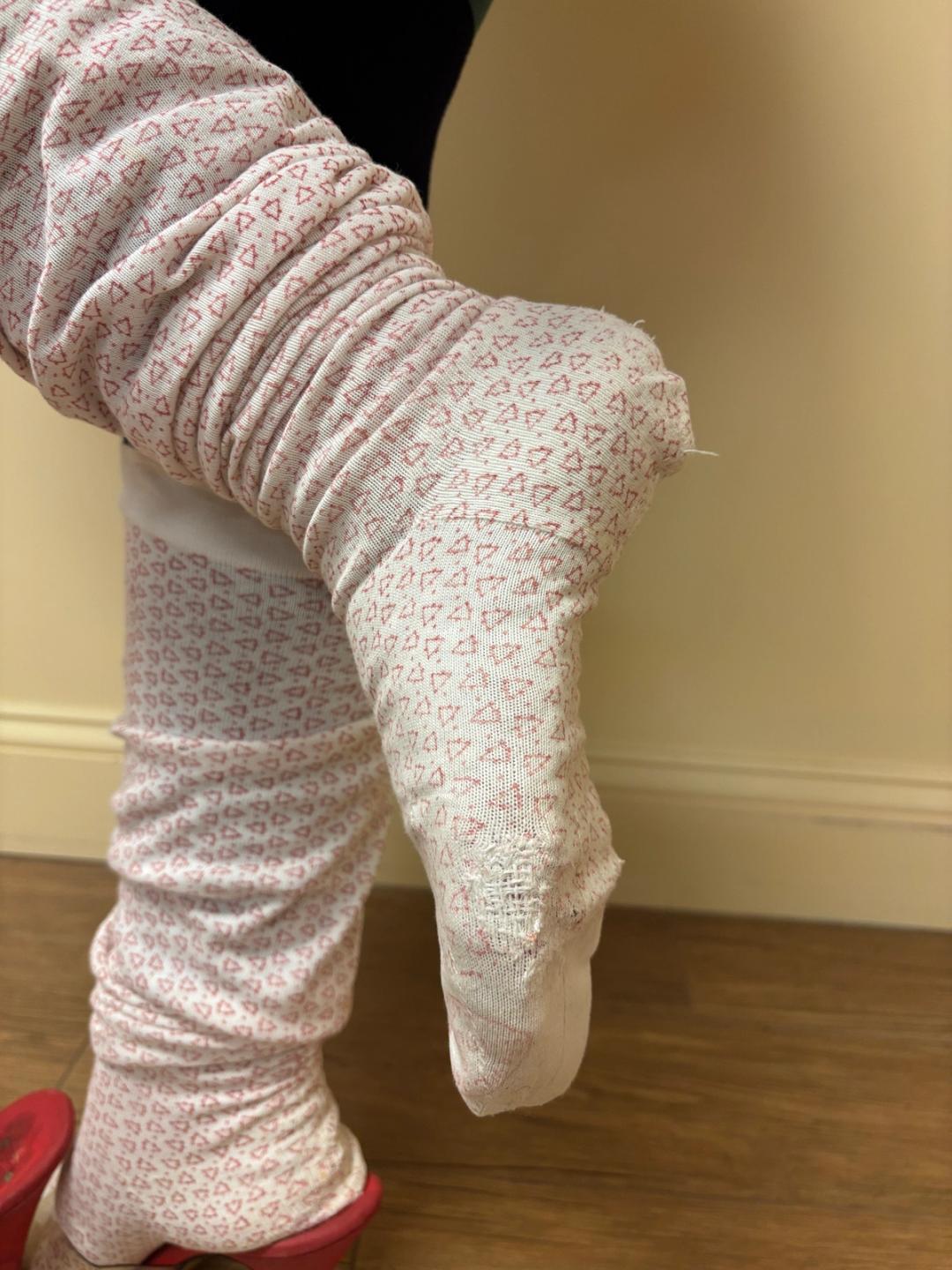 Rare 1890s triangle print stockings from the iconic Grands Magasins du Louvre department store in Paris, France. They have beautiful Louvre stamps on them. The stockings have embroidered initials on the back and delicate and beautiful darned repairs at the heels. There is a hole at the front of one of the stockings, but in sturdy wearable condition!