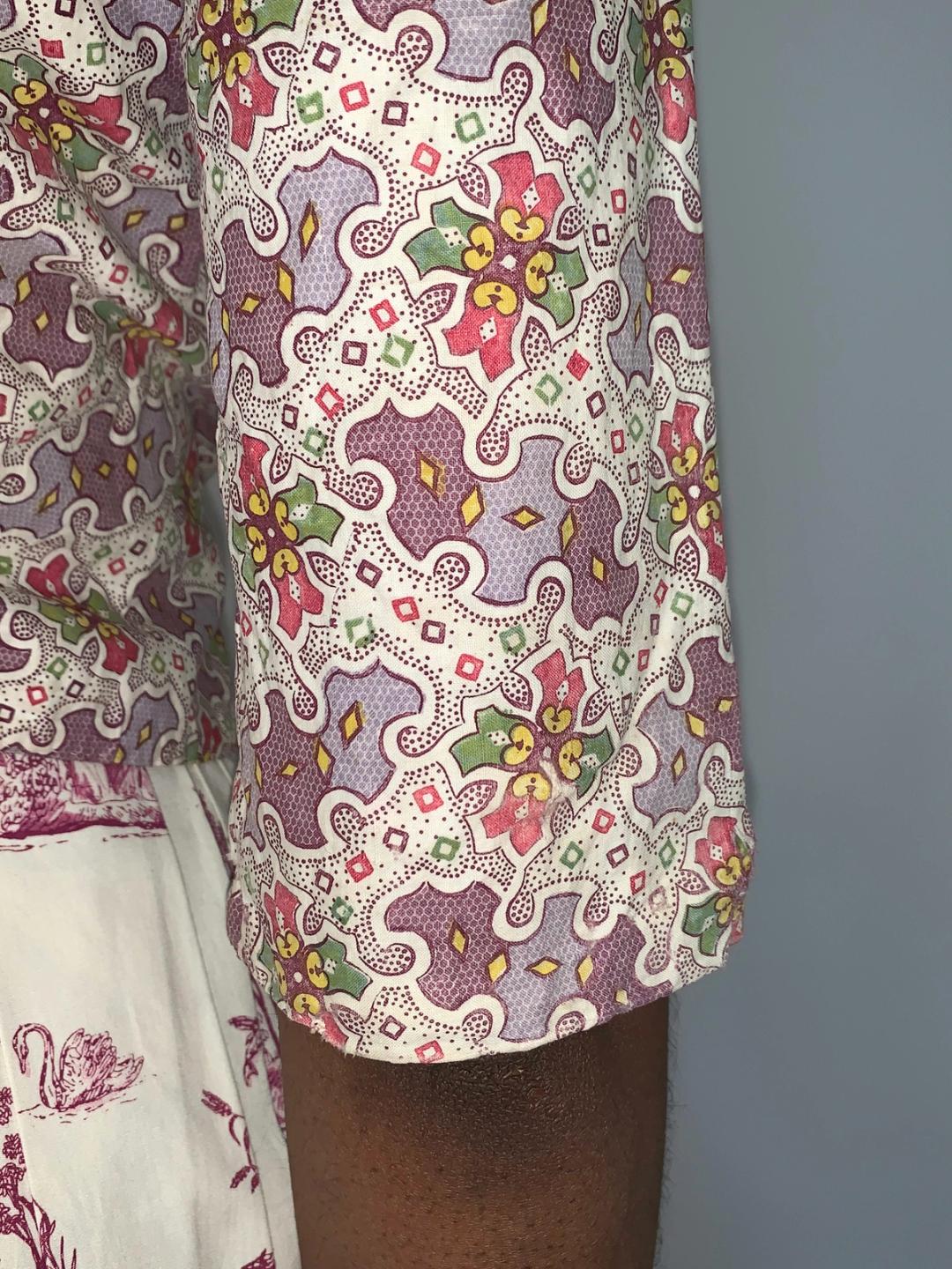 A very rare printed jacket from the late 18th century France. The jacket features a vivid and detailed multilayered print. The jacket is entirely handmade and hand-sewn, and is lined in a light flannel. It has string closures across the front which cinch the jacket into the shape as it would be worn historically with a stomacher or waistcoat, and fichu but it can also be worn open. It also has strings at the back which would attach it to the skirt of the dress. It is in shockingly great condition for it its age!