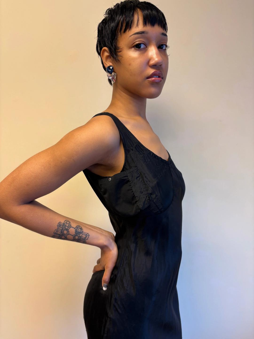 Beautiful home-made 1930s bias rayon slip dress. The dress has delicate deco seaming on the bust, and most interestingly a secret twill pocket near the armpit perfect for a wad of cash or a pack of cigarettes. It hits mid calf and has some scattered repairs and seems well loved. That said, the fabric is very strong and still very wearable.