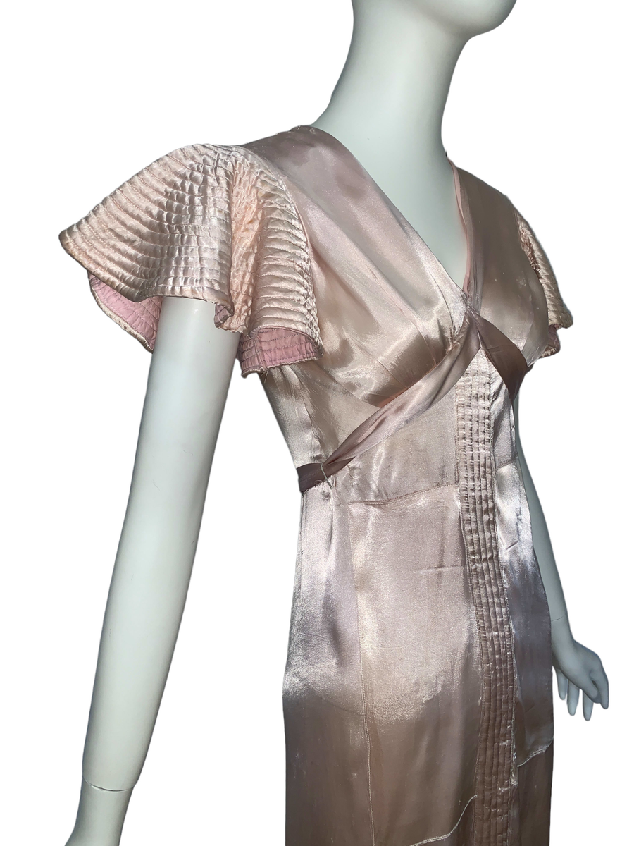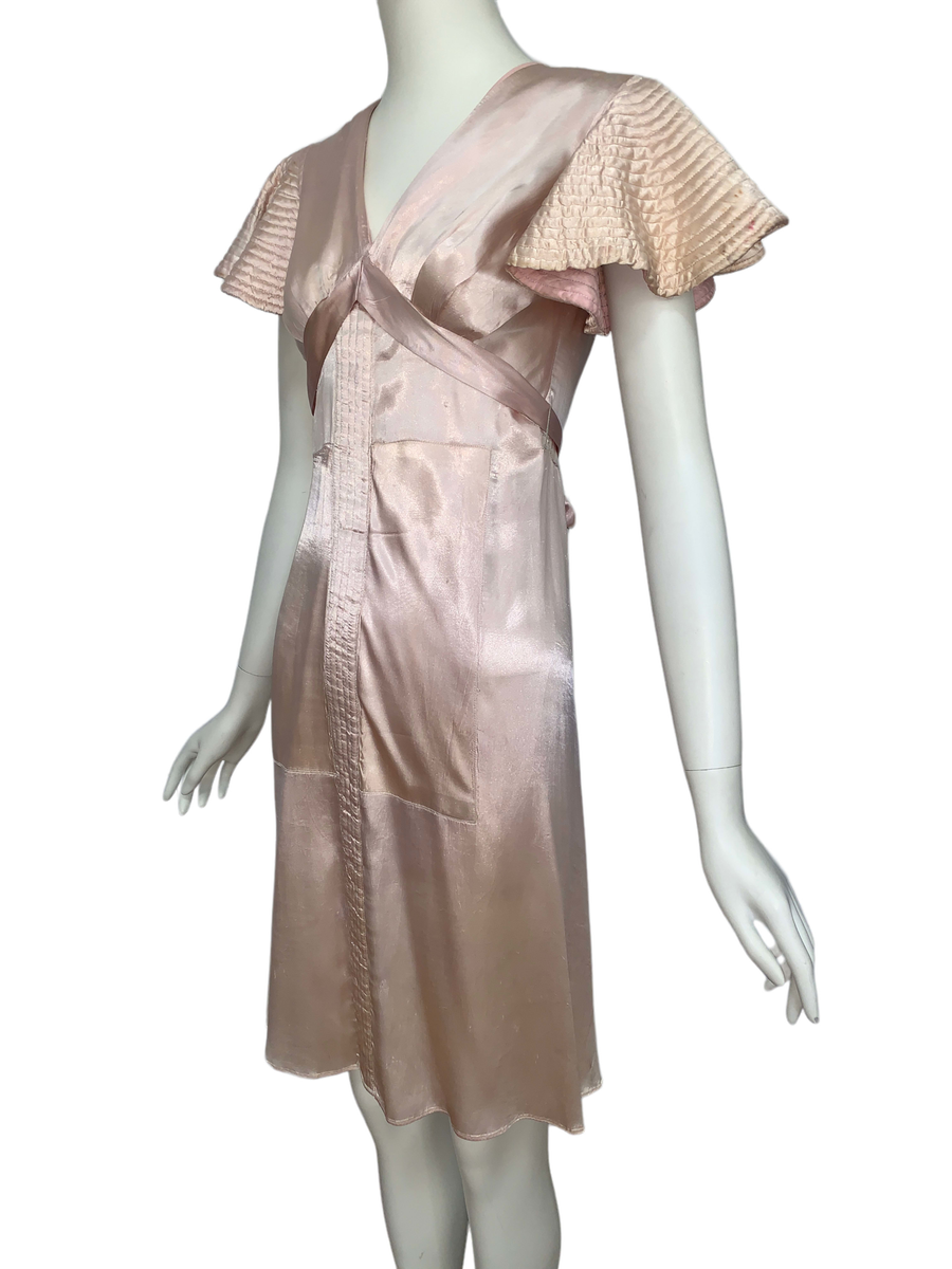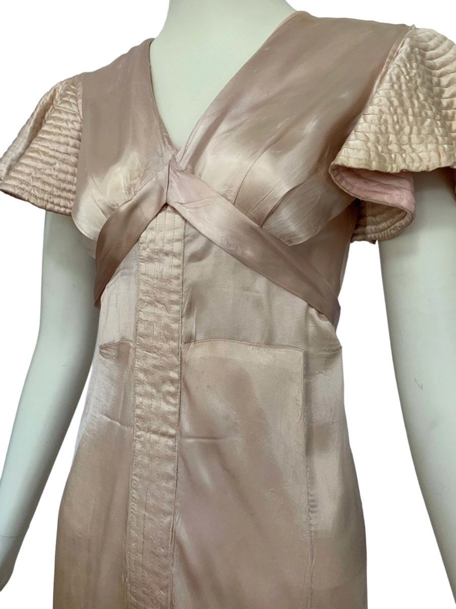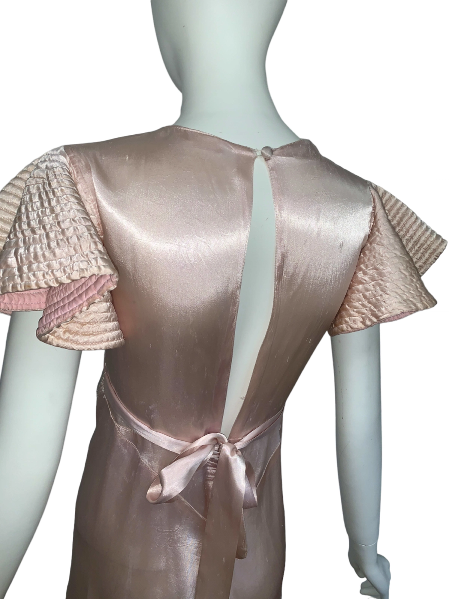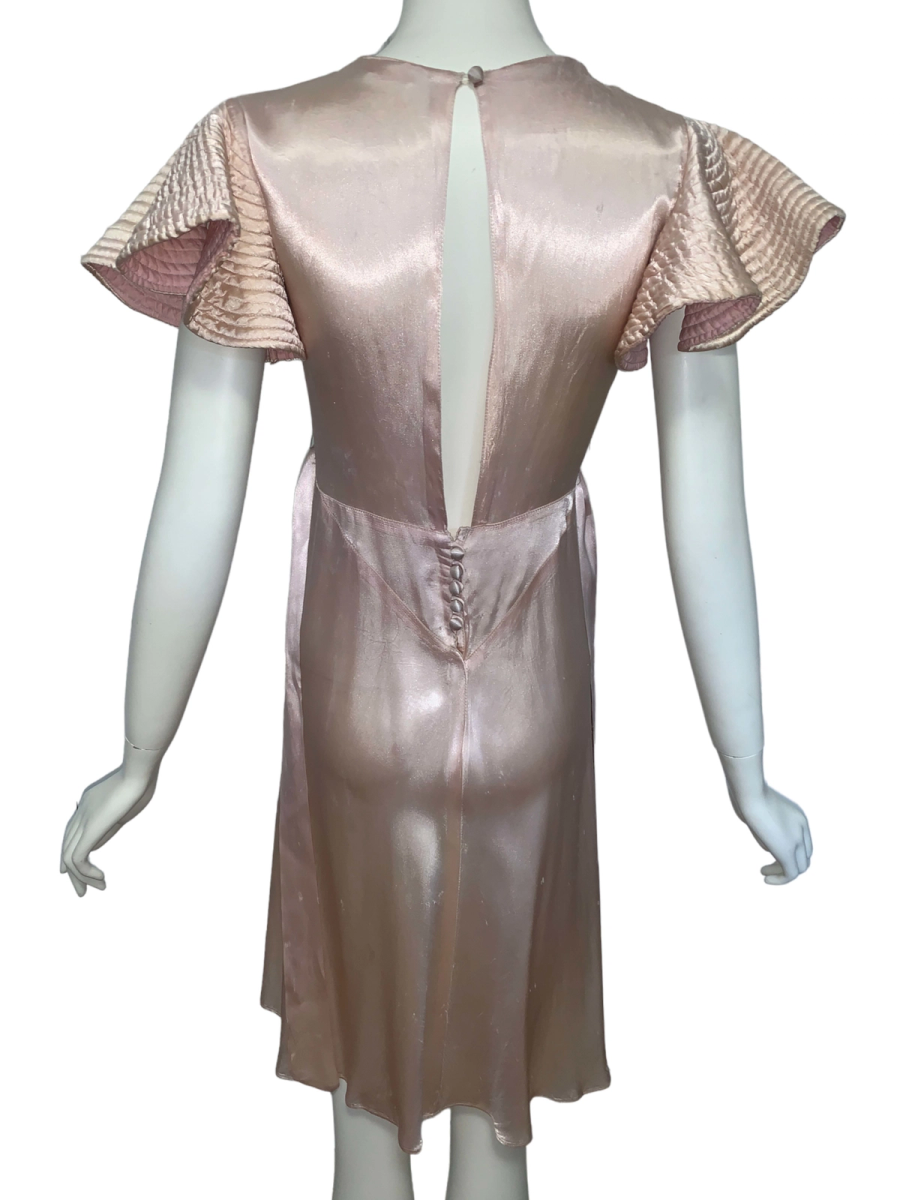 Very unique dress from the 1930s, made from indestructible pale pink rayon satin. It has dramatic circle quilted sleeves, an angled darted bust with sash which creates a great silhouette and support, may be no need for brassiere! I suspect this was custom made for a young girl, based on high fashions of the time.
