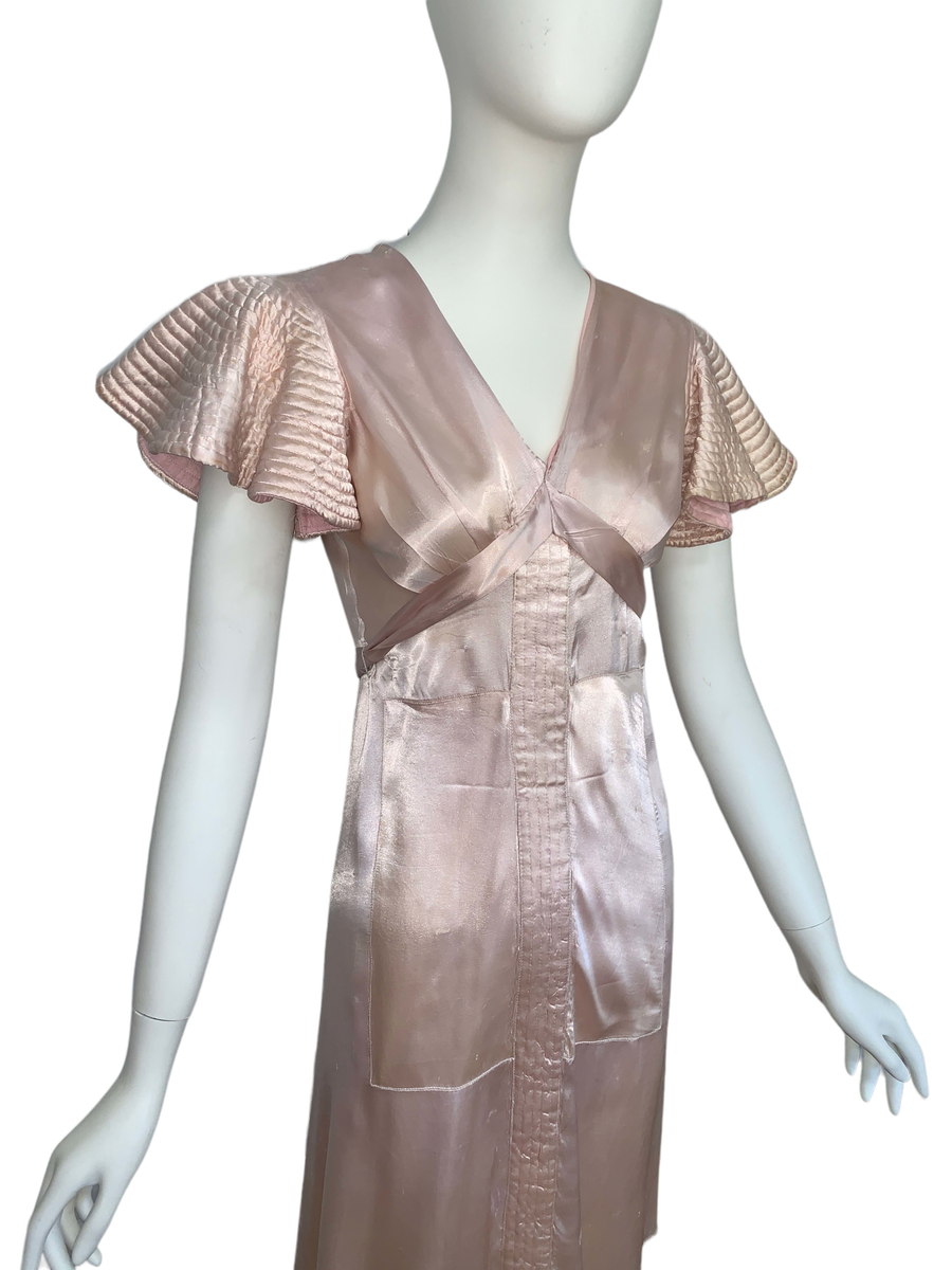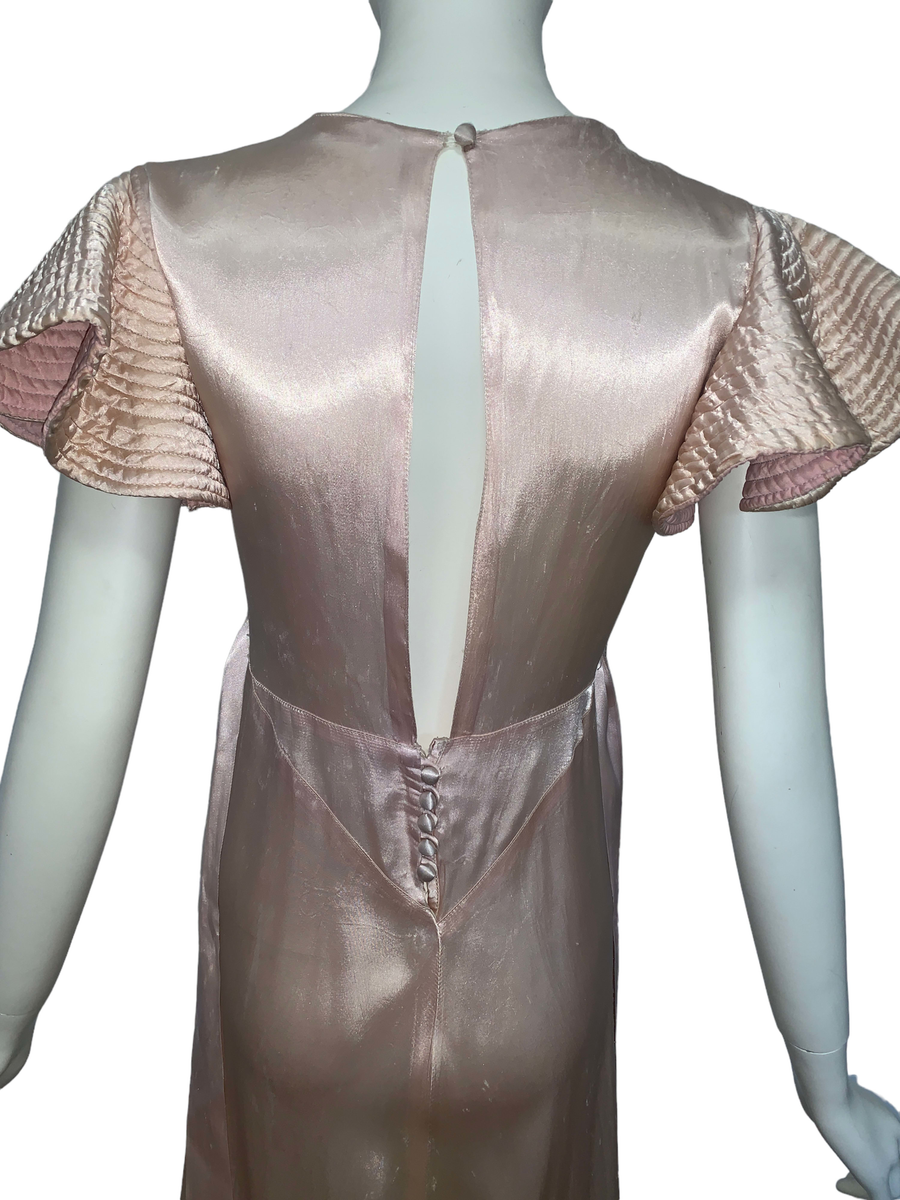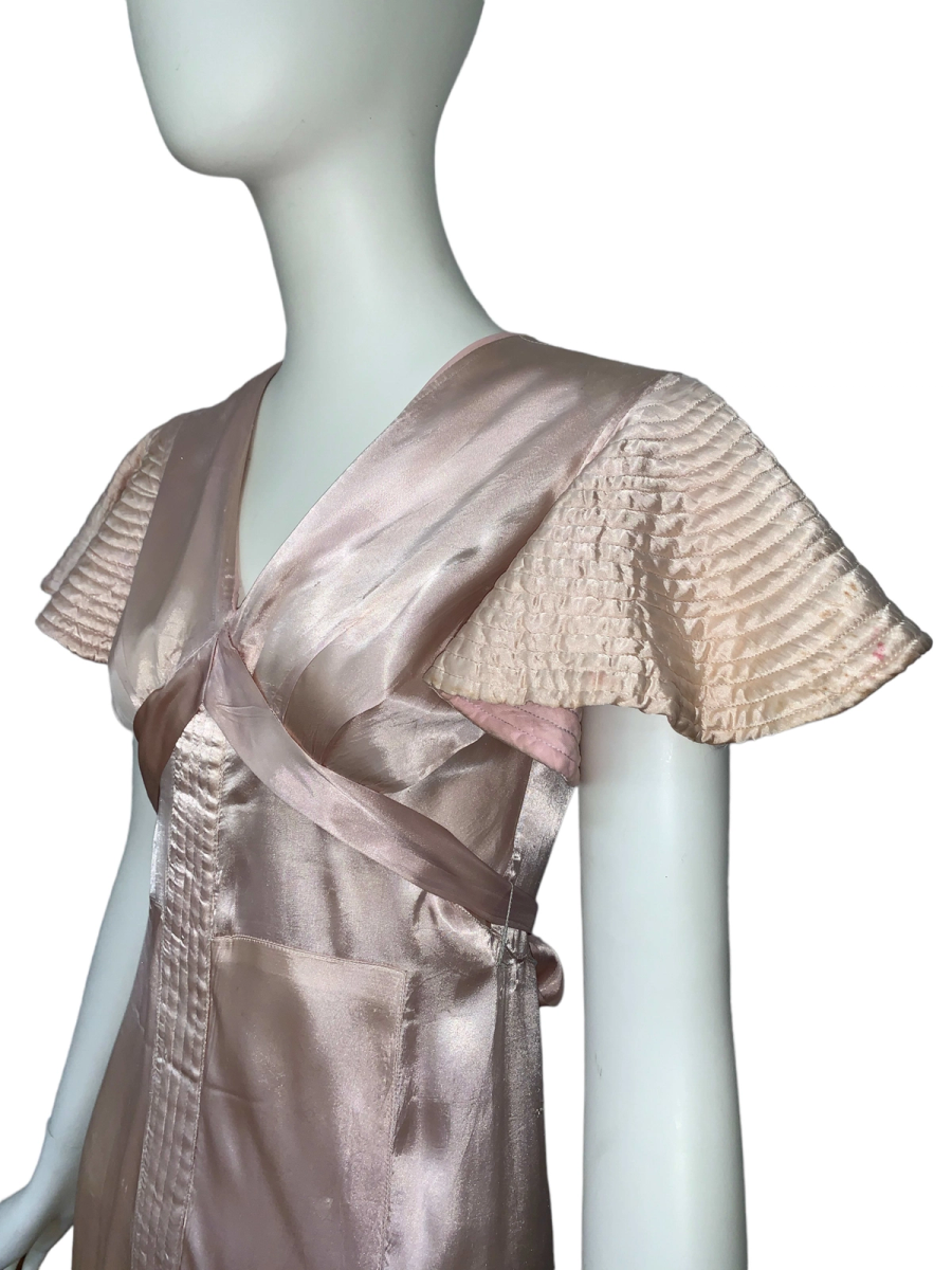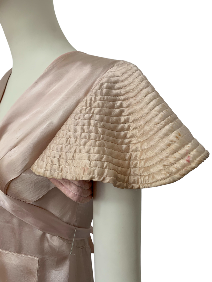 Very unique dress from the 1930s, made from indestructible pale pink rayon satin. It has dramatic circle quilted sleeves, an angled darted bust with sash which creates a great silhouette and support, may be no need for brassiere! I suspect this was custom made for a young girl, based on high fashions of the time.