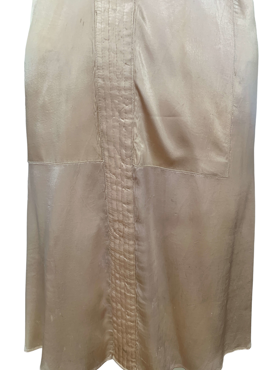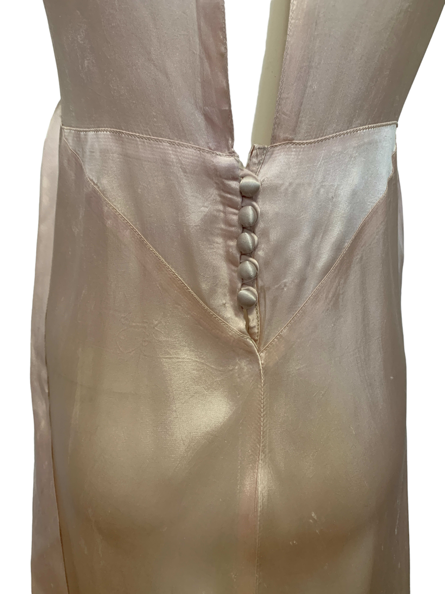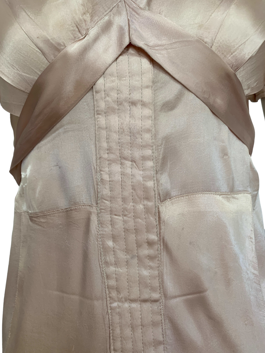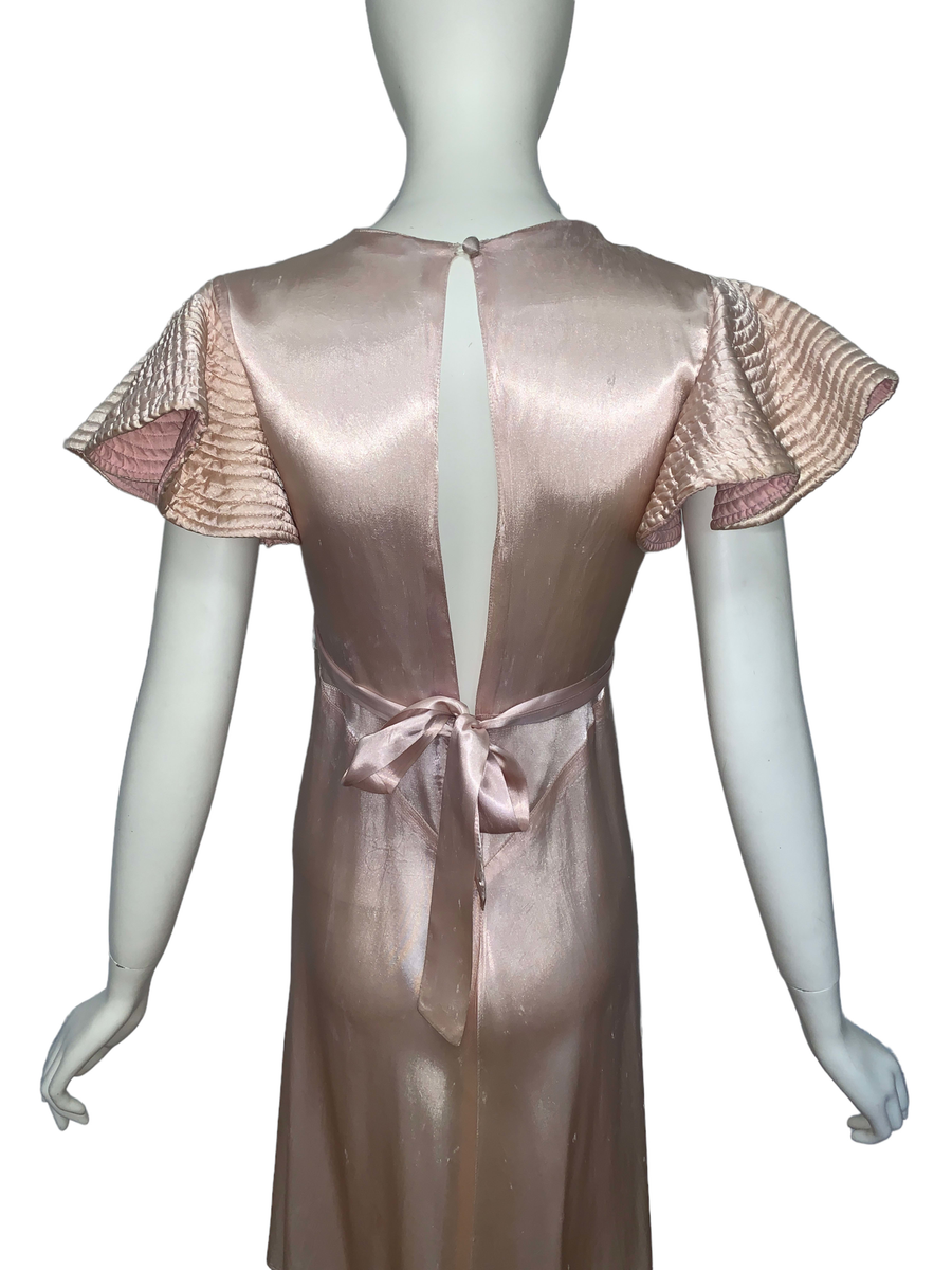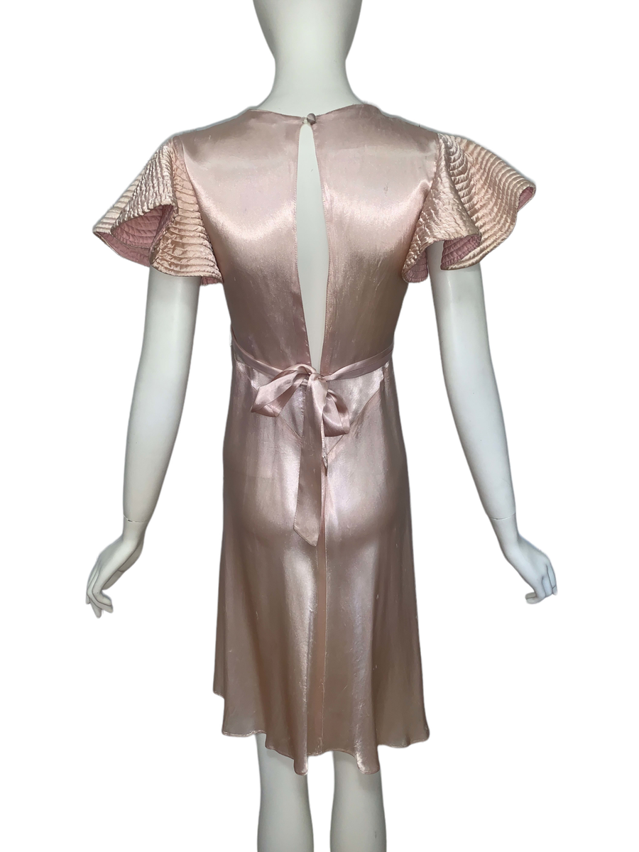 Very unique dress from the 1930s, made from indestructible pale pink rayon satin. It has dramatic circle quilted sleeves, an angled darted bust with sash which creates a great silhouette and support, may be no need for brassiere! I suspect this was custom made for a young girl, based on high fashions of the time.