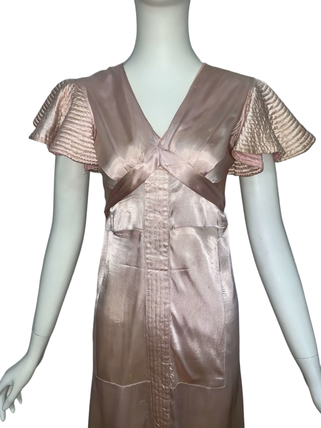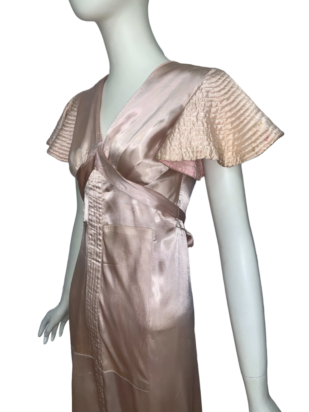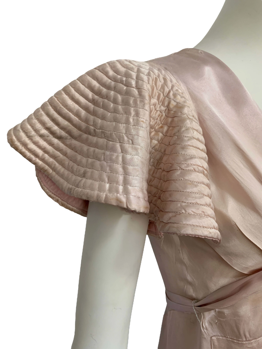 Very unique dress from the 1930s, made from indestructible pale pink rayon satin. It has dramatic circle quilted sleeves, an angled darted bust with sash which creates a great silhouette and support, may be no need for brassiere! I suspect this was custom made for a young girl, based on high fashions of the time.
