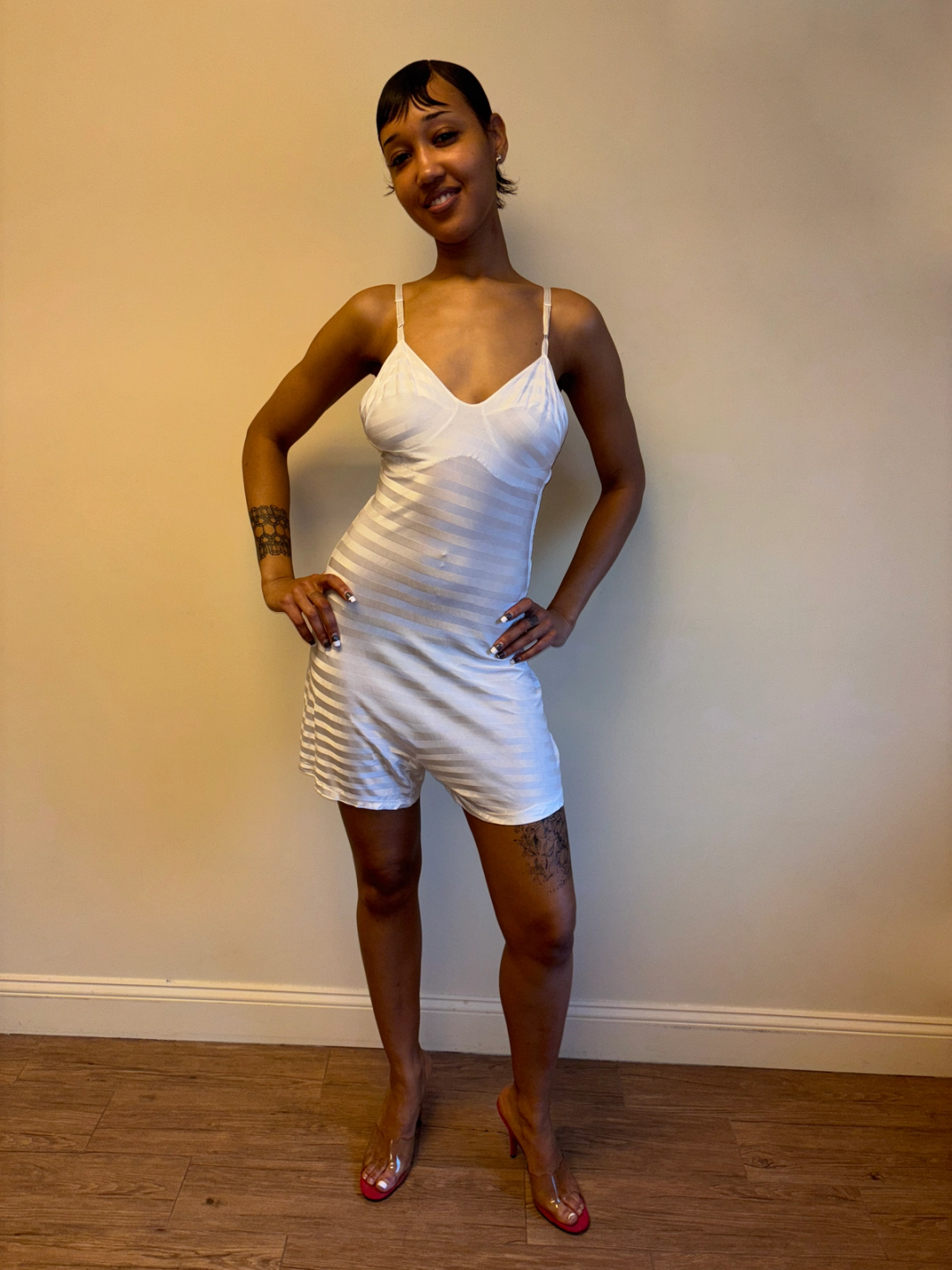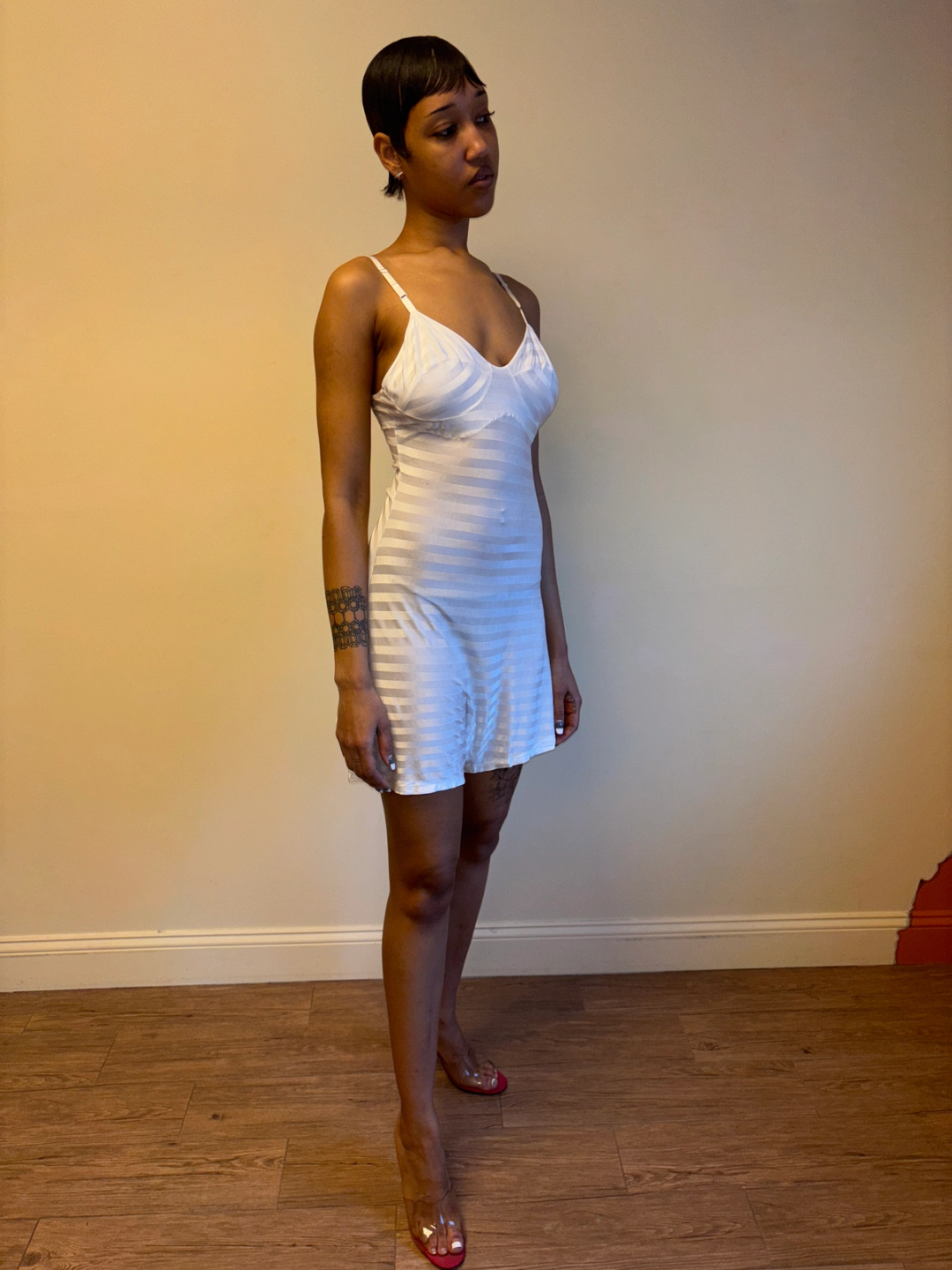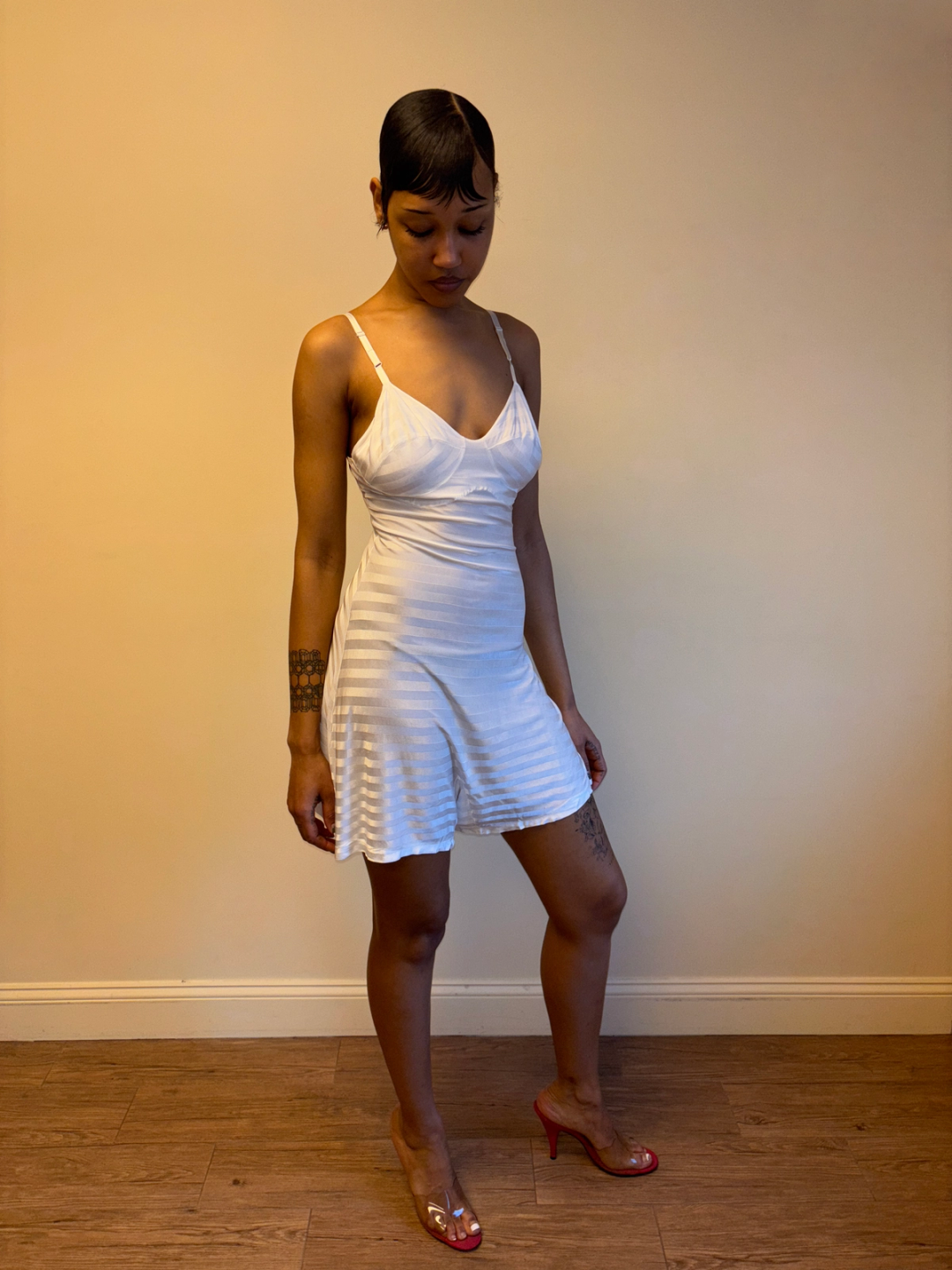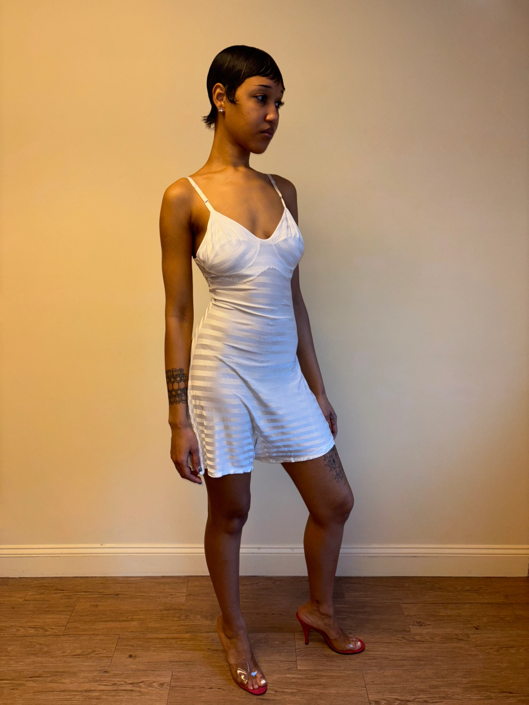 Gorgeous 1930s white striped rayon knit step in slip. The slip has built in shorts and hook and eye closures on one side. There is a darned repair on the bottom -- otherwise in sturdy wearable condition!