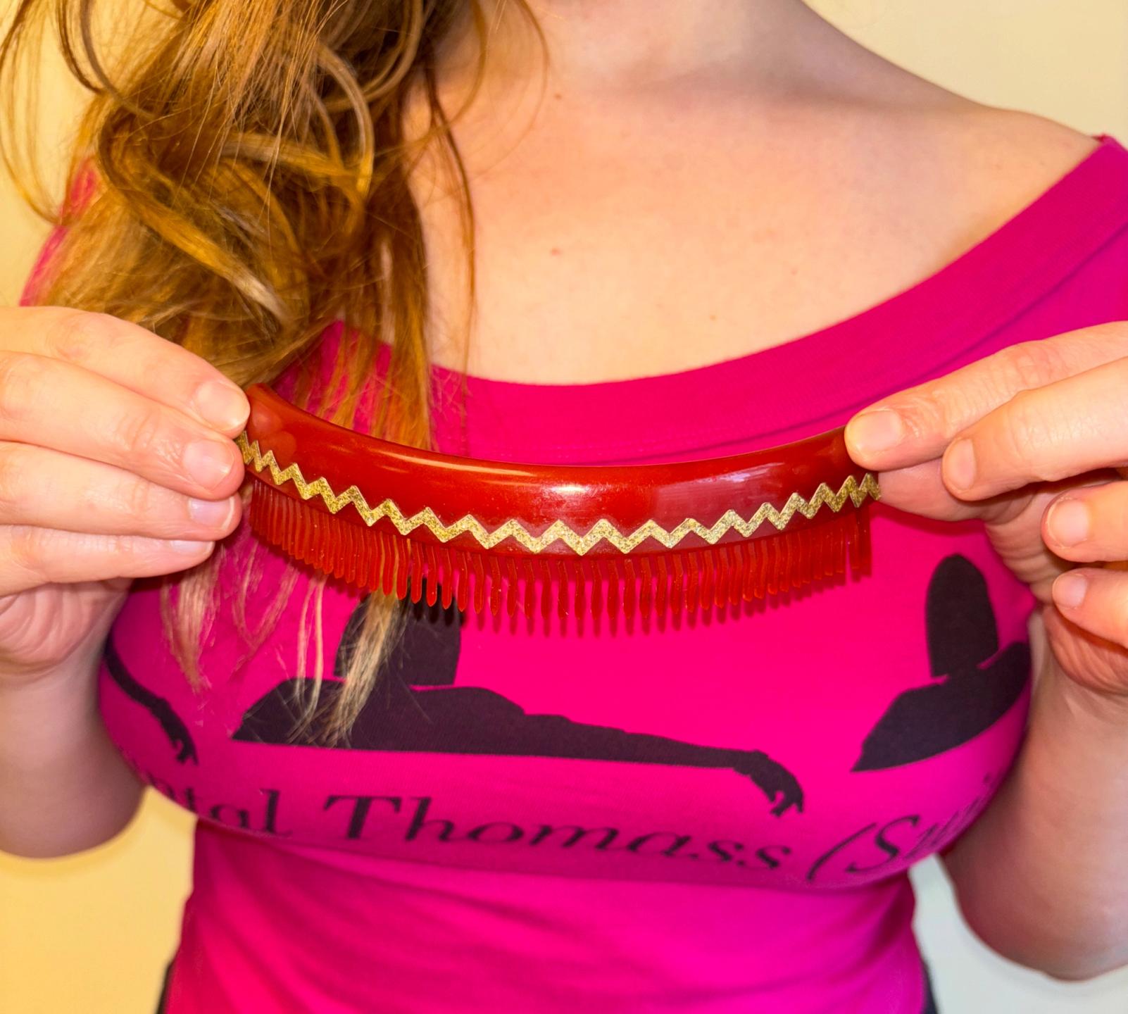 Celluloid or other such early plastic hair comb from 1940s France. It's made from a translucent red-brown amber plastic with glittered zigzag applied to its surface. The material is flexible yet strong, and teeth of the comb are beautifully wavy.