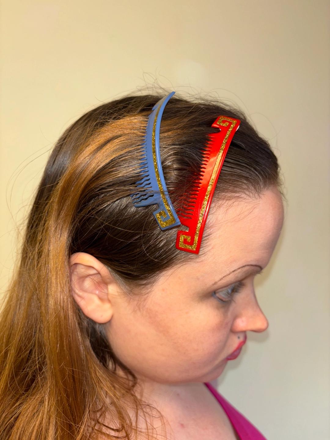 Beautiful 1940s French hair combs made of celluloid. The set includes two hair combs, one red and one blue, with a gold sparkly Greek key design.