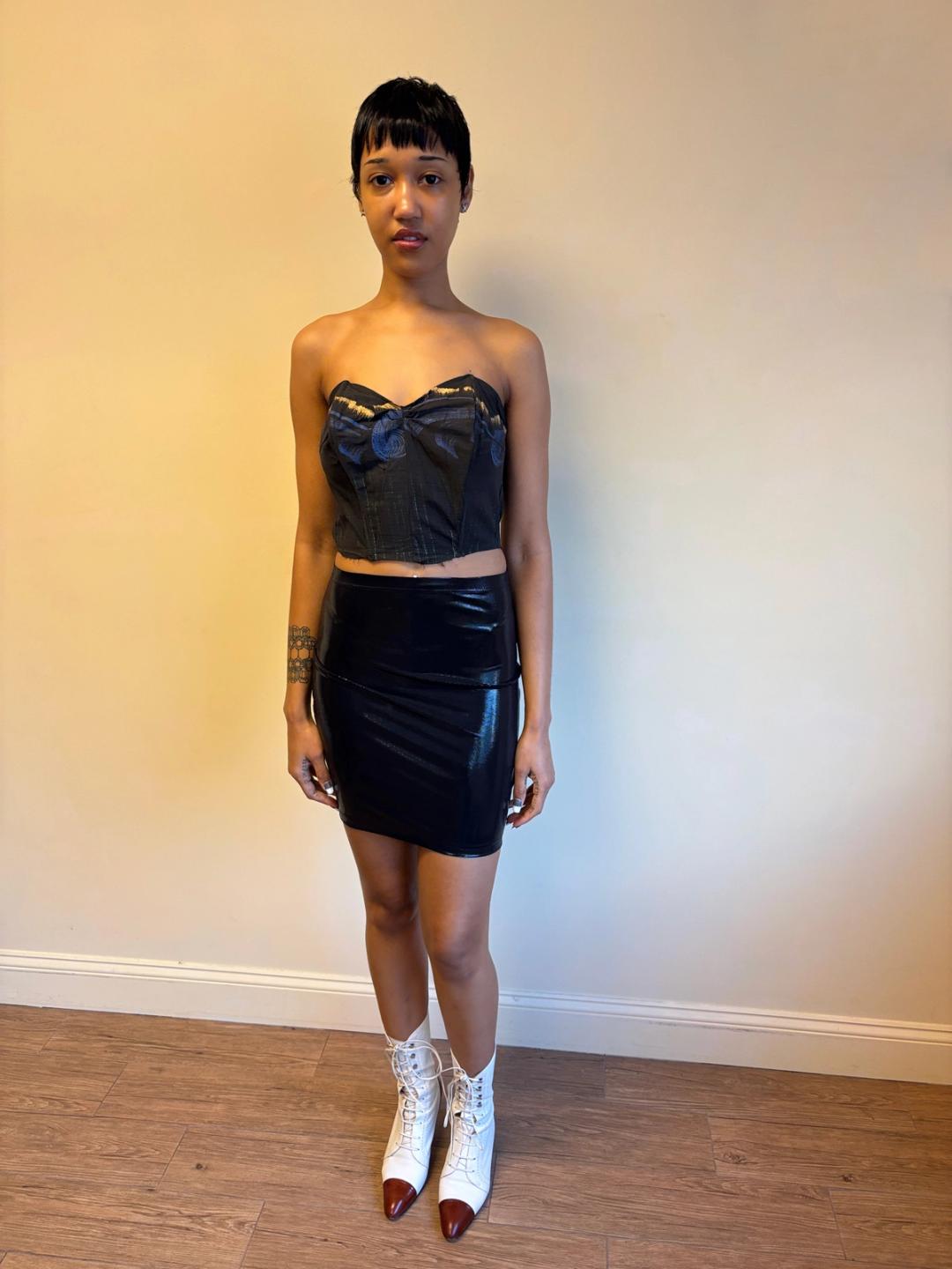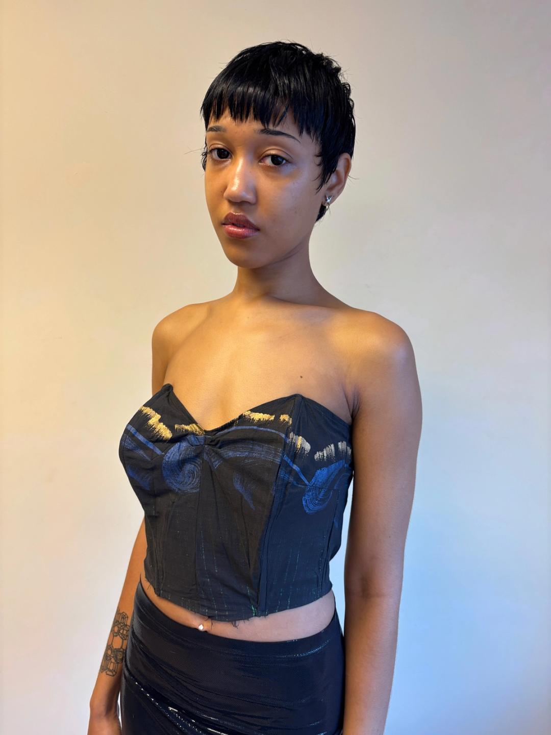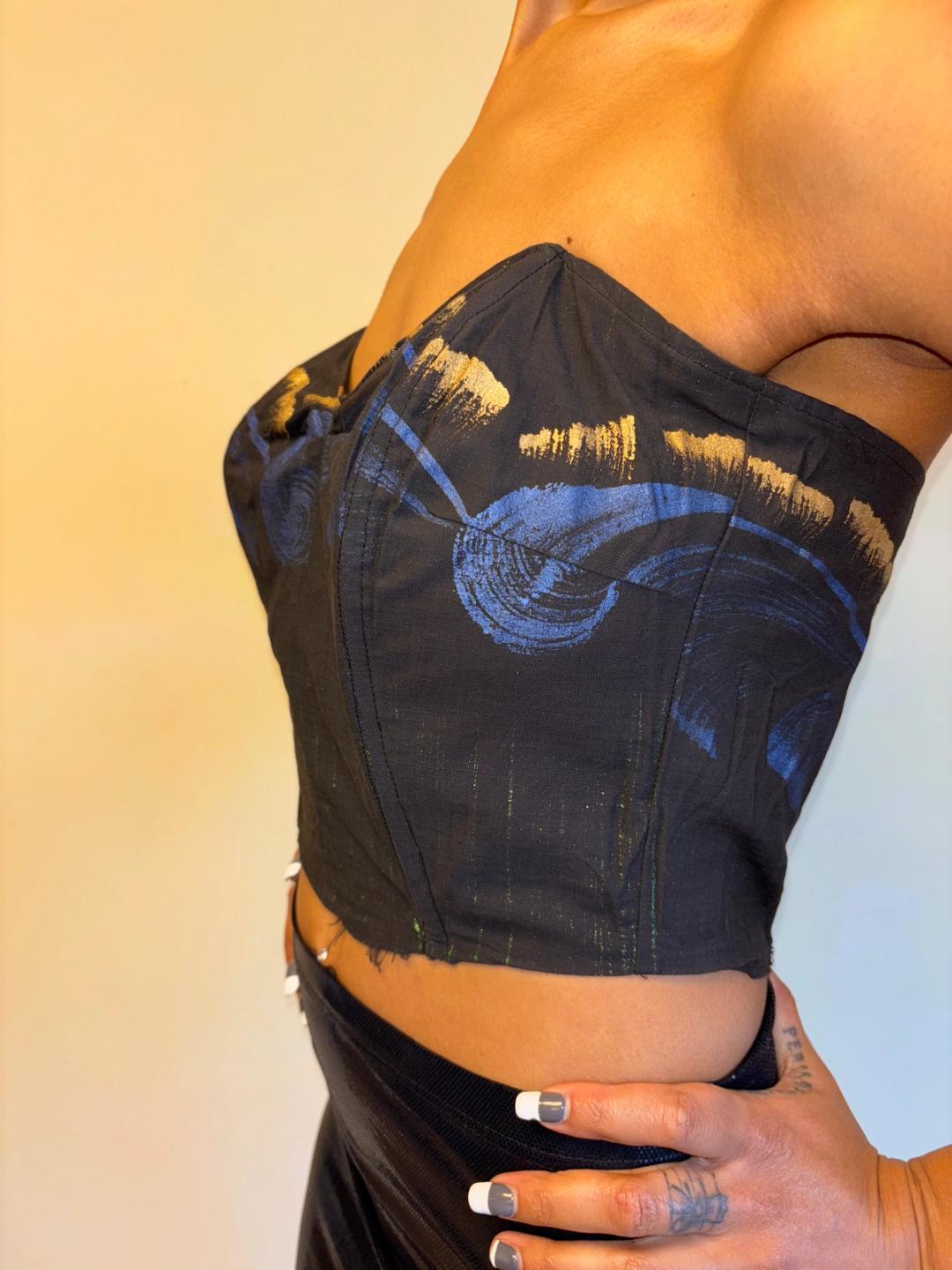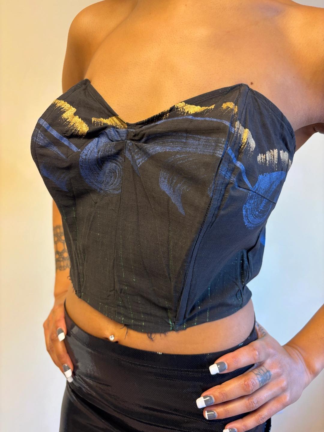 1950s hand painted bodice cut from a dress. It zips up the back and has boning throughout. In sturdy wearable condition.