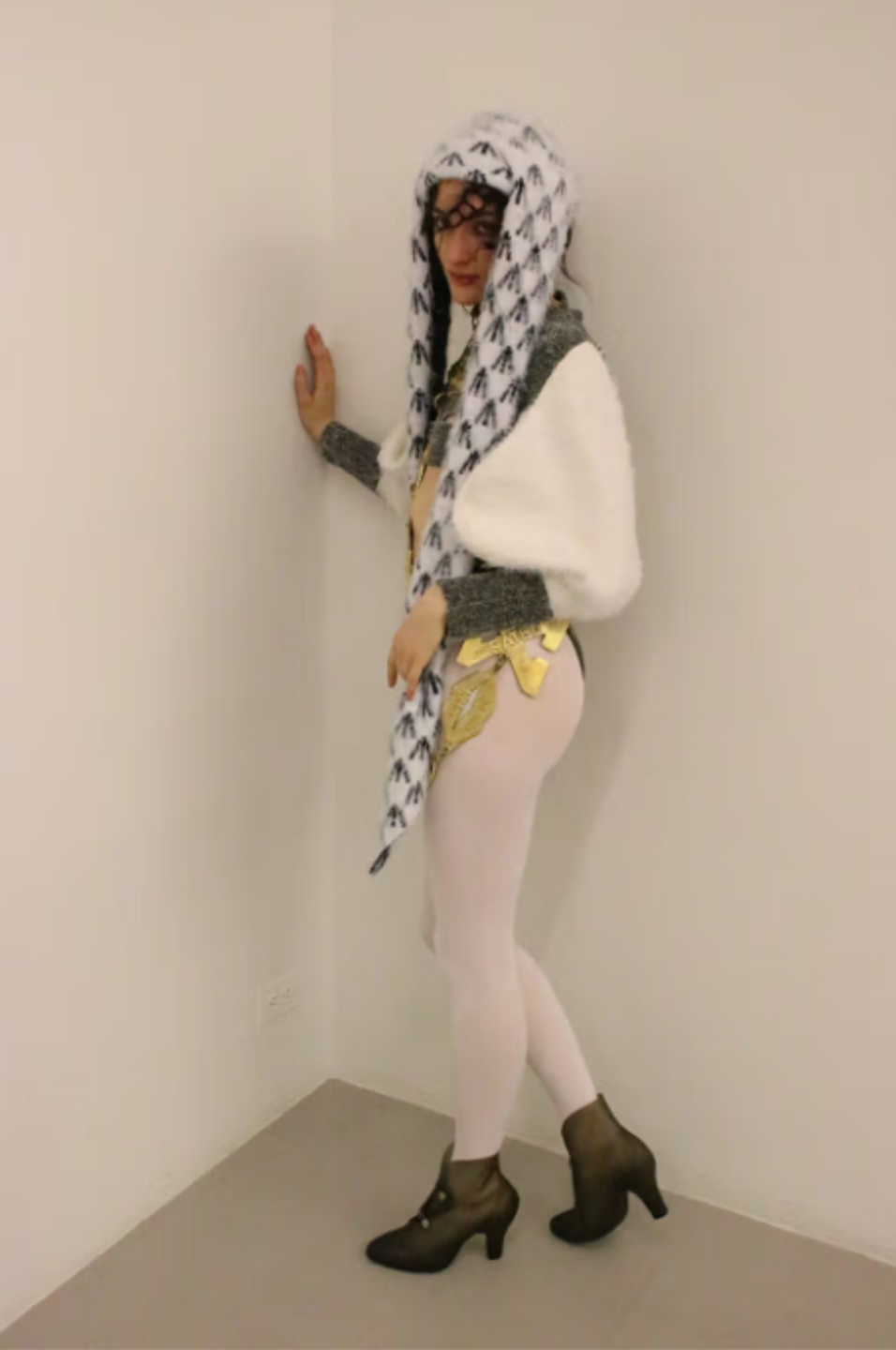 1950s rubber rain heel covers with included vintage satin shoes inside. Both fit like a US women's size 7. One shoe's elastic closure is damaged but still functional. These shoes were used in our 2020 runway show, "SEZX."