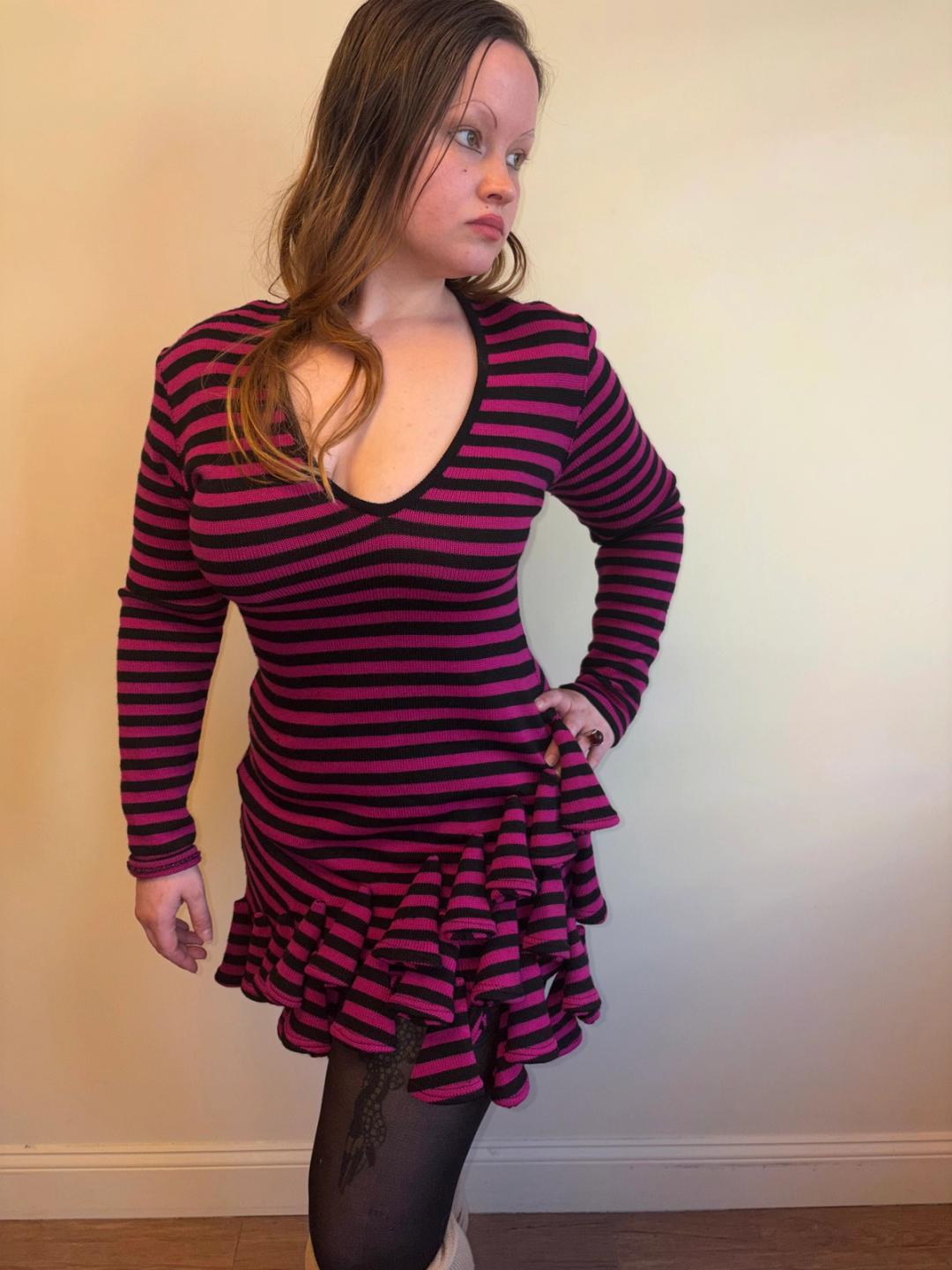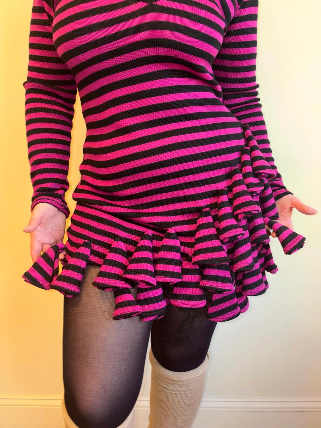 Rare 1980s Dorothée Bis knit striped bodycon dress with black and hot pink. The dress has unusual dimensional triangle rosettes flowing down it.