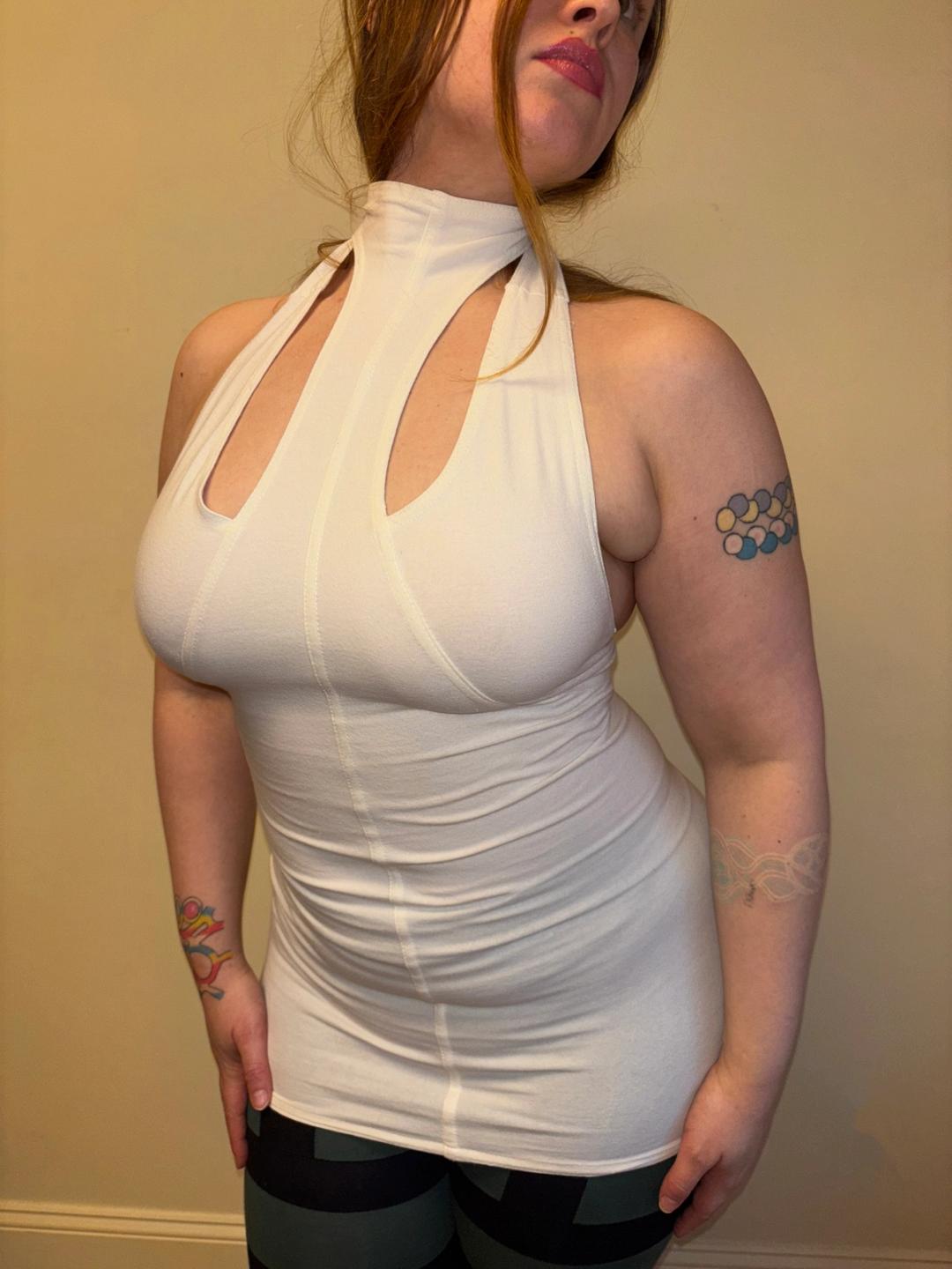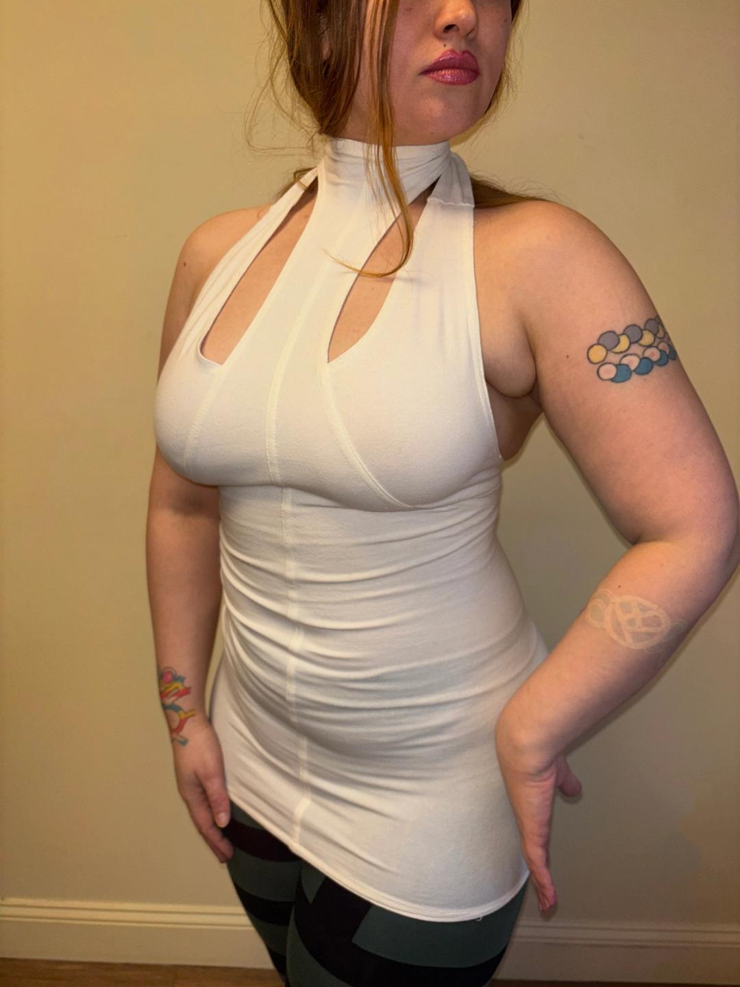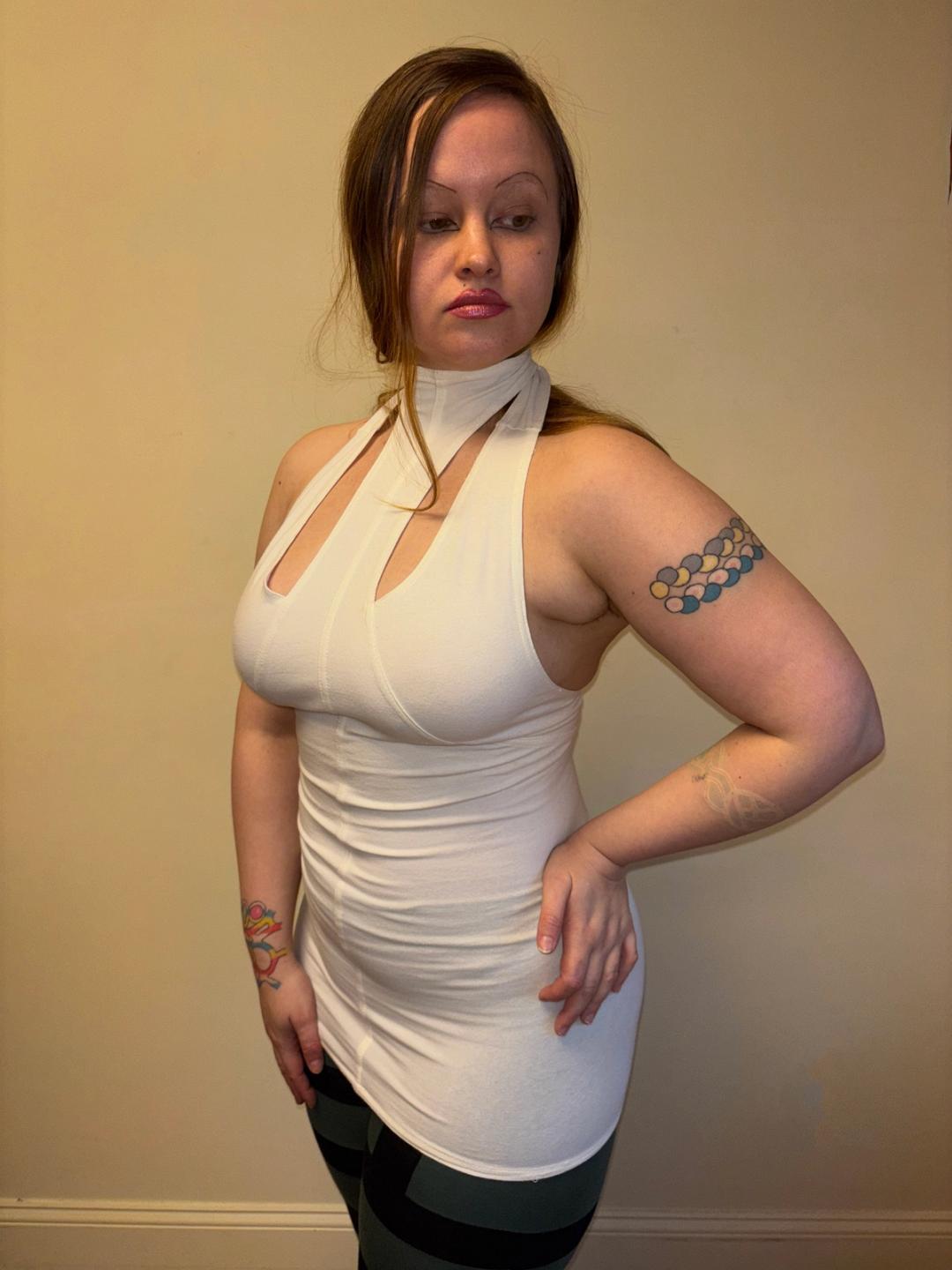 Stunning 1980s cutout top by Dorothee Bis, a French label known for directional and beautiful knitwear. Made from a cream-colored cotton spandex with unique velcro closure. In excellent vintage condition.