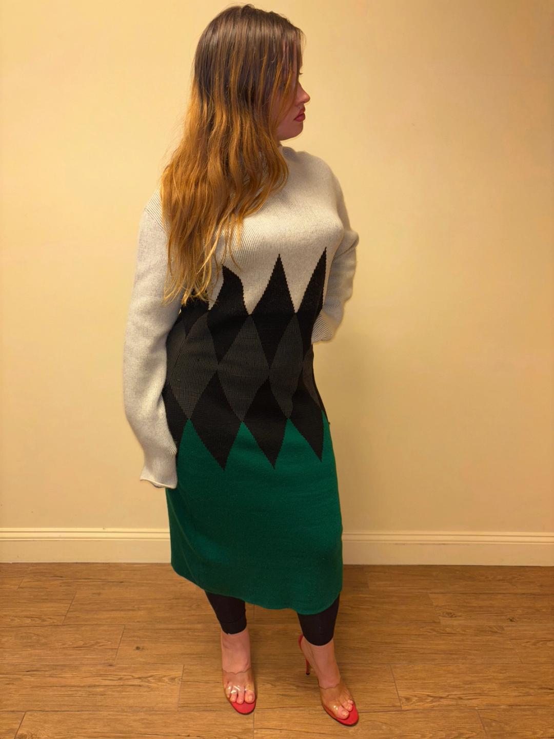 Rare early Gaultier x Gibo piece from the 1986-87. Flattering knit dress with extra long sleeves and bold jagged print on the midsection, a motif seen in Gaultier's shows and ads of this period. The dress is in good vintage condition with one hole and a few snags throughout (see photos), priced accordingly.
