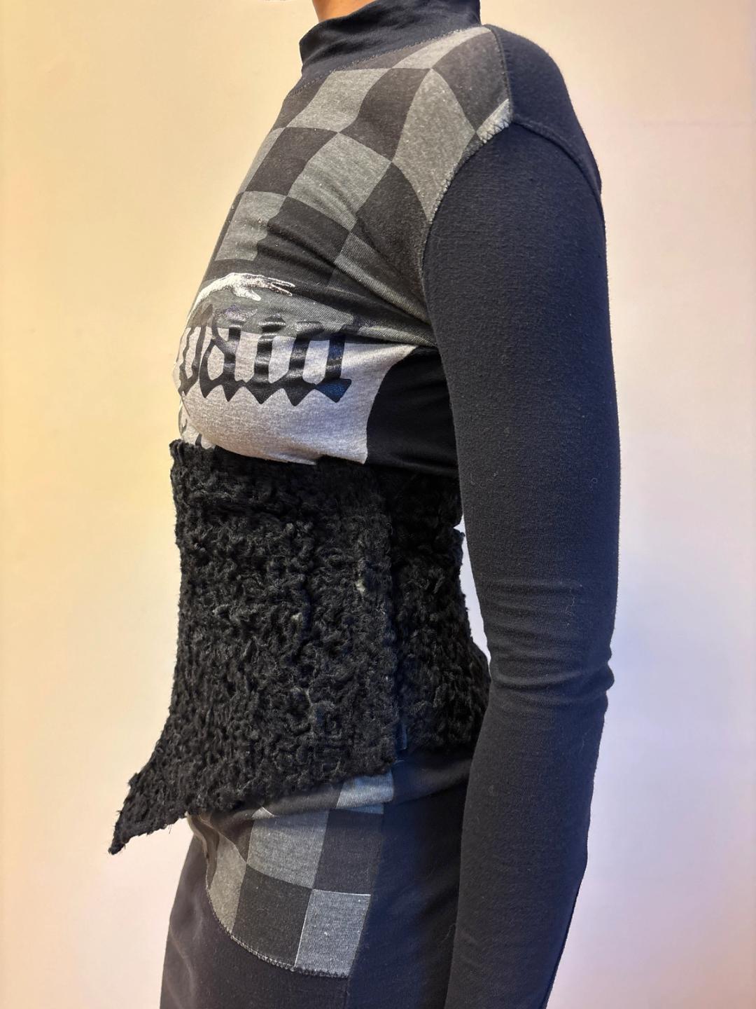 1980s Gaultier pour Gibo faux astrakhan waist cincher. It has beautiful quilted lining and velcro closure. A very rare piece, possibly a showpiece. In good vintage condition with some signs of wear/age.