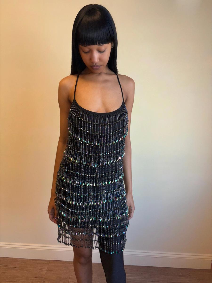 Rare 1980s dress by Helen Storey with dramatic layered beaded tassels. The dress has a low back (obscured by the leggings the model is wearing). It has a criss cross design on the back as well. It is quite stretchy with a bodycon fit. Moves like a dream!
