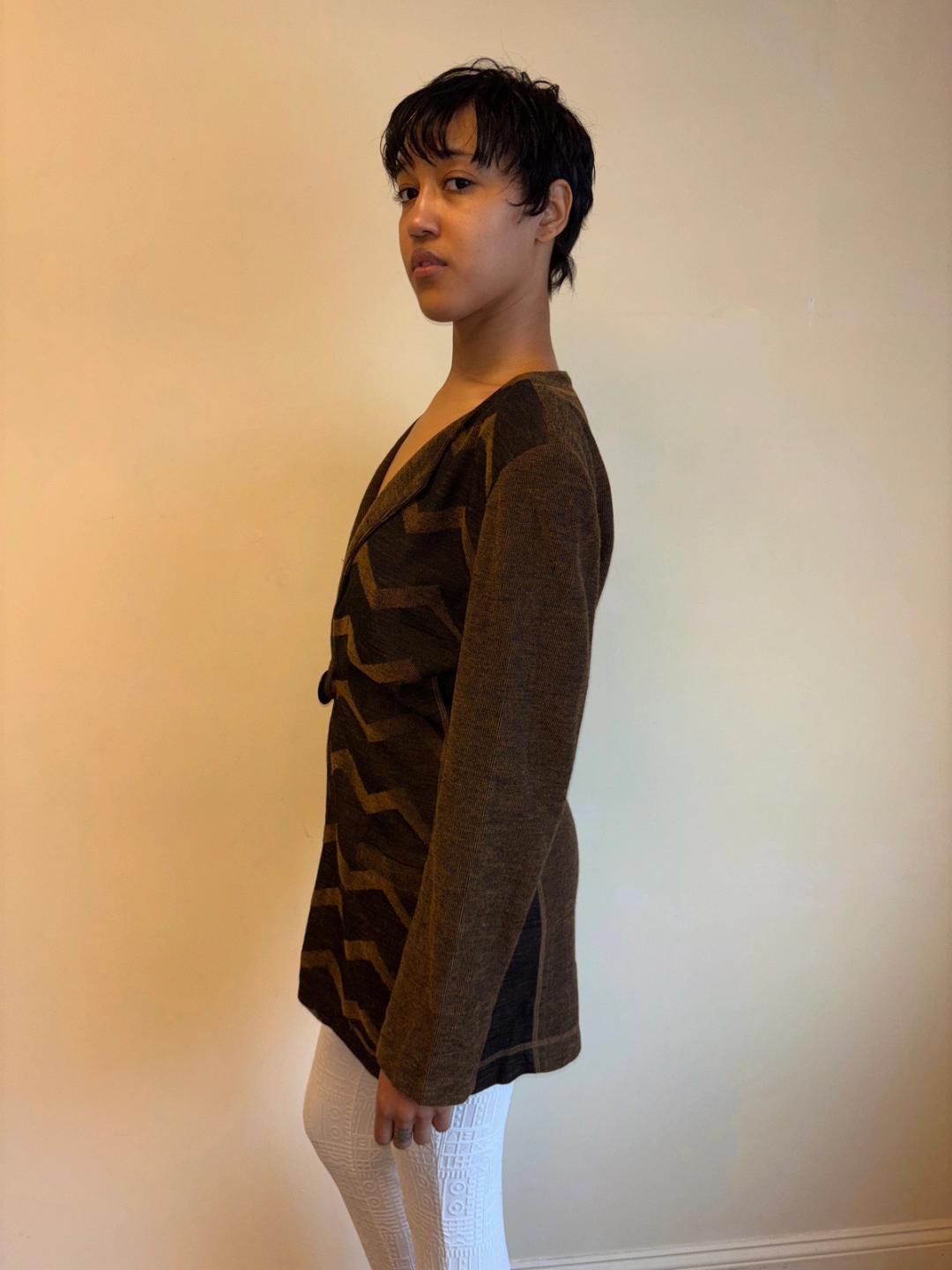 Striking 1980s knit jacket by renowned Japanese designer Hiroko Koshino who often referenced antique clothing in her designs from this time. The knit pattern features graphic rows of snakes. The jacket has strong lightly padded shoulders closing with a single button at the waist. In excellent condition.