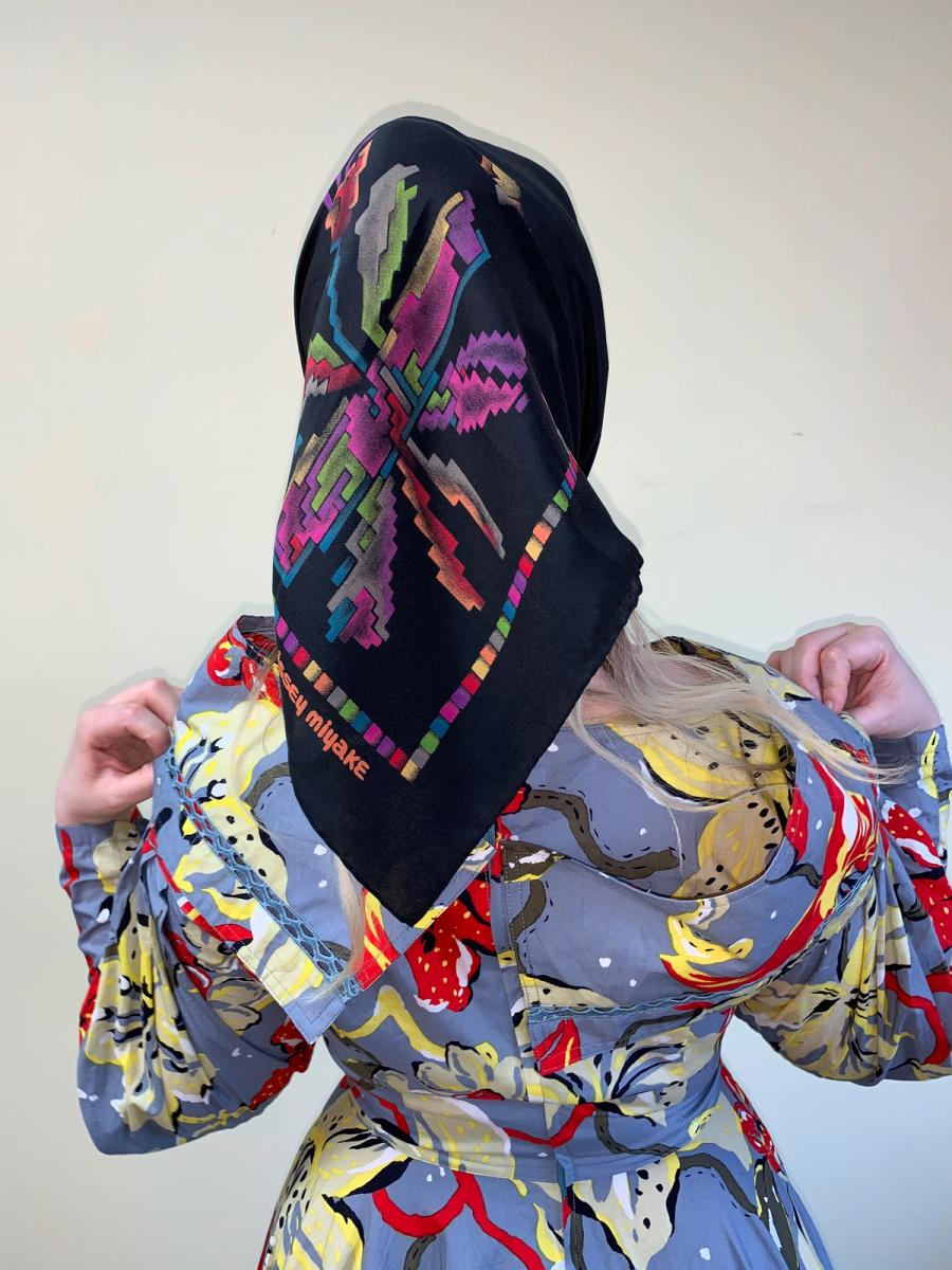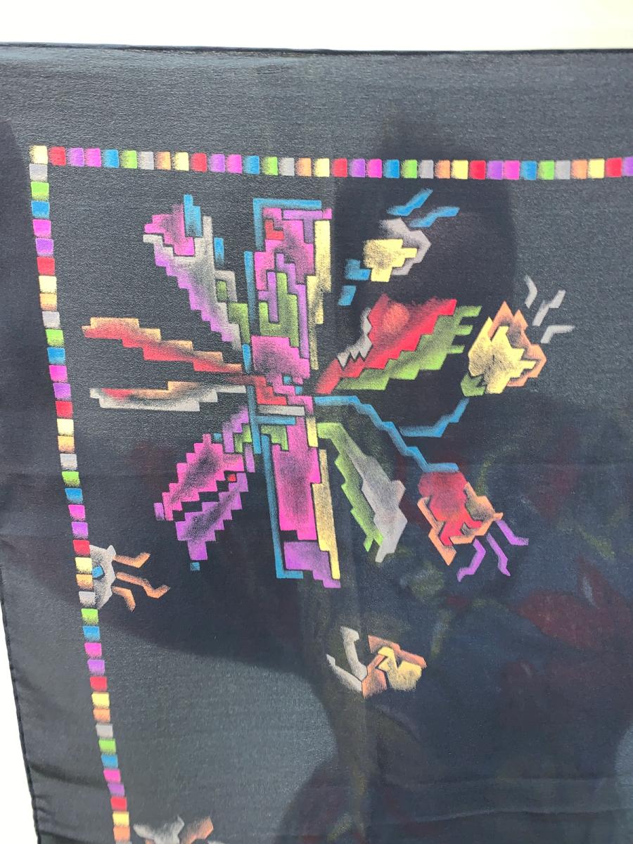 Large silk scarf by Issey Miyake, either from the late 70s or the 1980s. It has a black background with large rainbow "pixelated" floral motif throughout. In impeccable condition. Signed and finished with a rolled hem.
