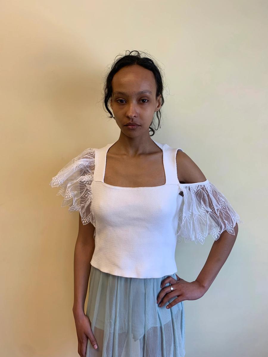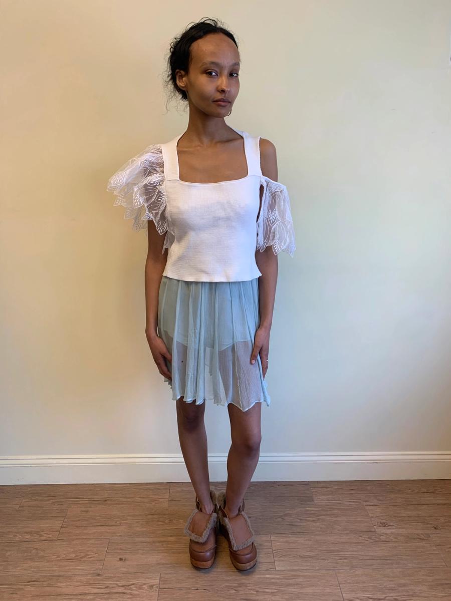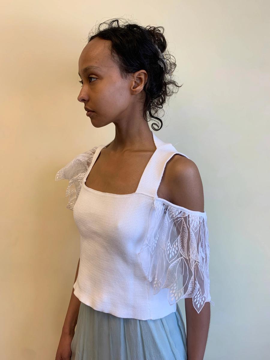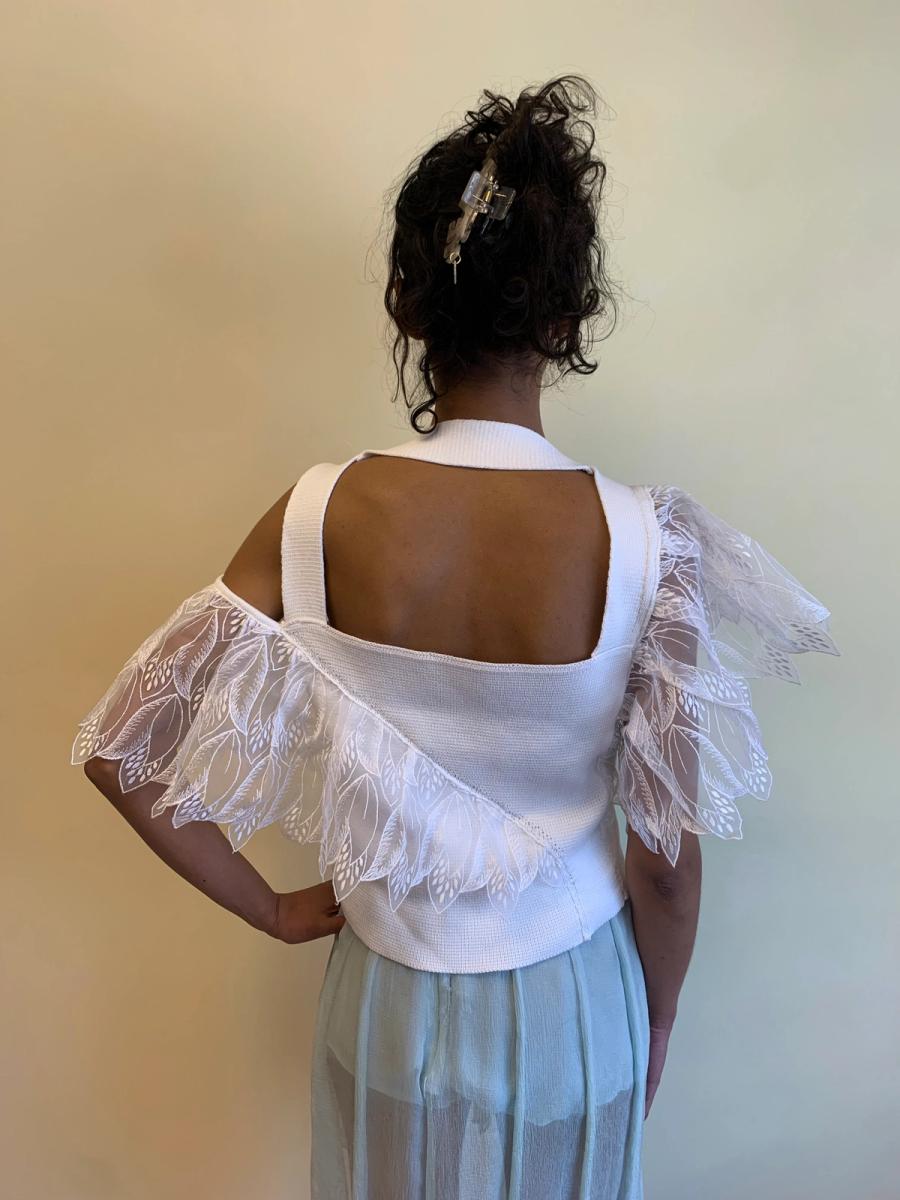 Rare and unusual late 1980s knit top attributed to Julien Macdonald. Made from a thick cotton knit with thick asymmetrical straps and embroidered flounce sleeves that almost look like wings. In perfect condition.
