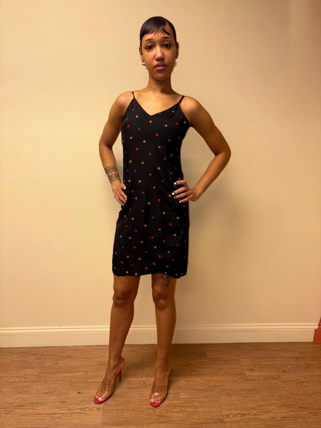 Chic and simple early 80s Krizia dress made from a black crepe fabric and multicolor heart confetti print throughout. It has a sweetheart neckline and thin straps. One spot on the dress