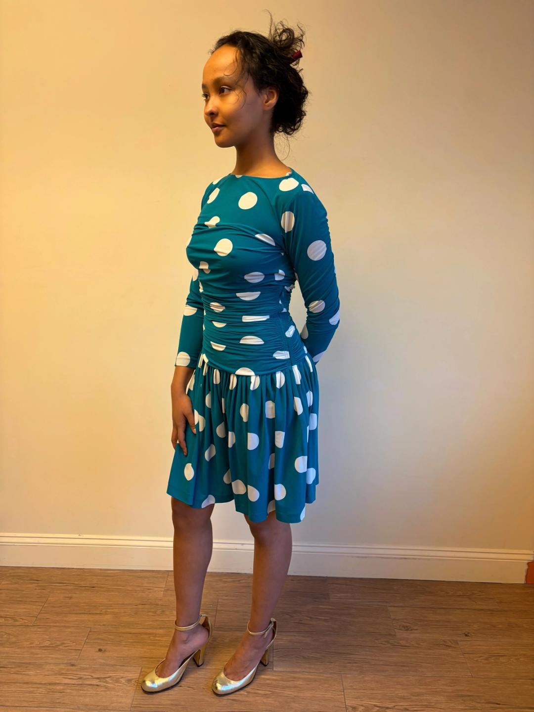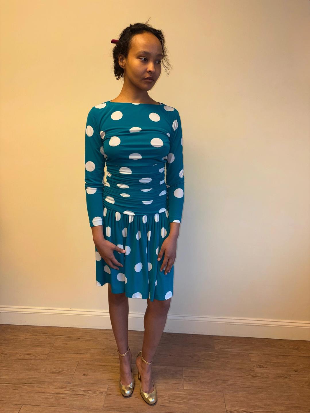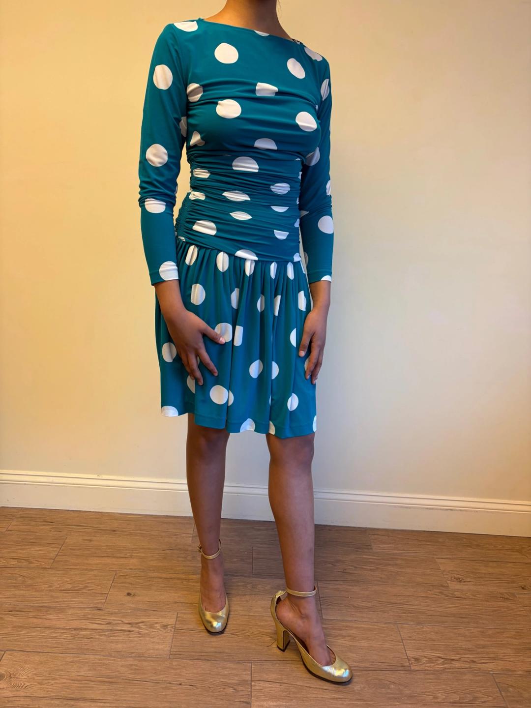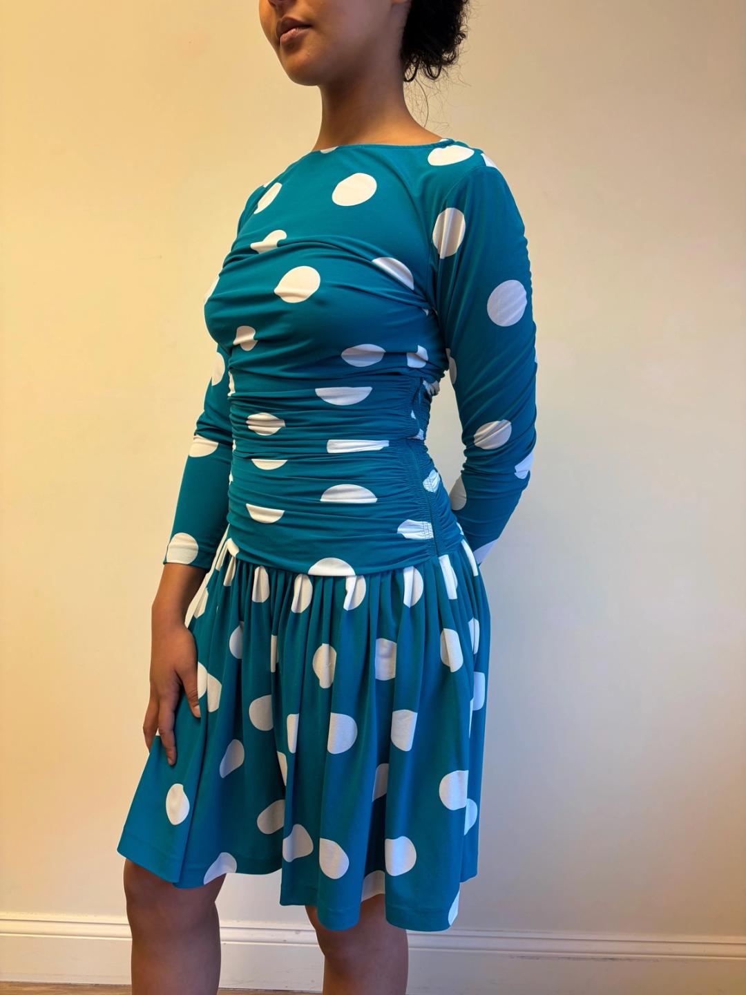 80s Norma Kamali polka dot set. The set includes a high waisted ruched skirt and a matching shirt. The pieces can be worn together or separate! Some snags on the shirt, but otherwise in great vintage condition.