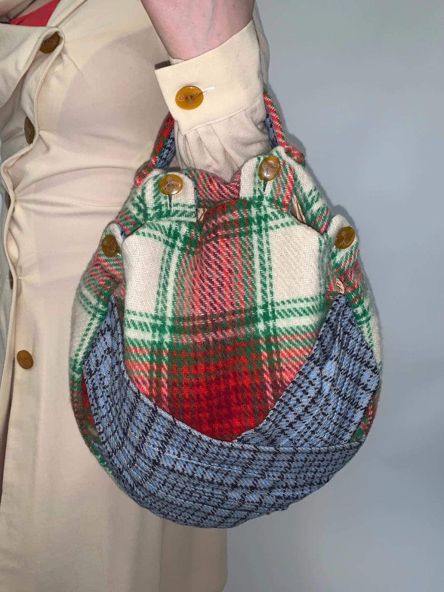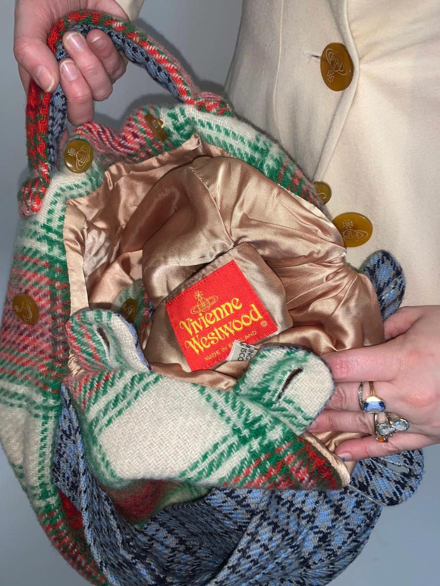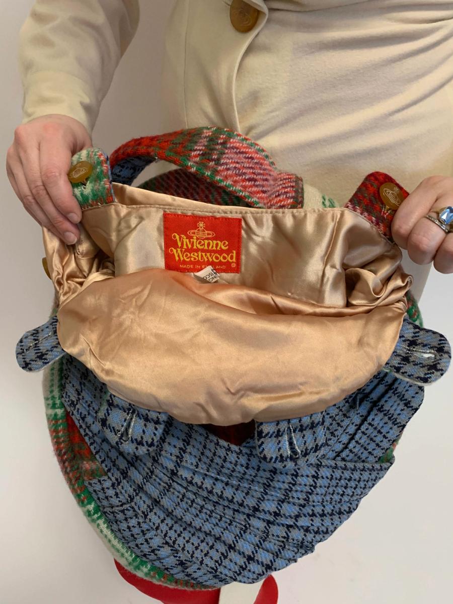 Incredible and rare Vivienne Westwood handbag from the iconic Time Machine/Pagan 1988-89 era, made of a gorgeous assortment of tartan fabrics, lined in flesh toned satin. It's a large circle with a secret inner compartment and orb button tab closures throughout, brilliant design. Westwood herself is pictured sporting the same design.
